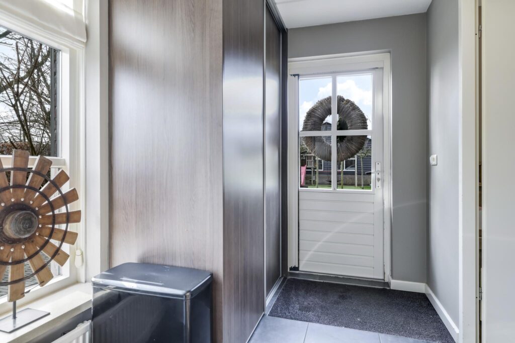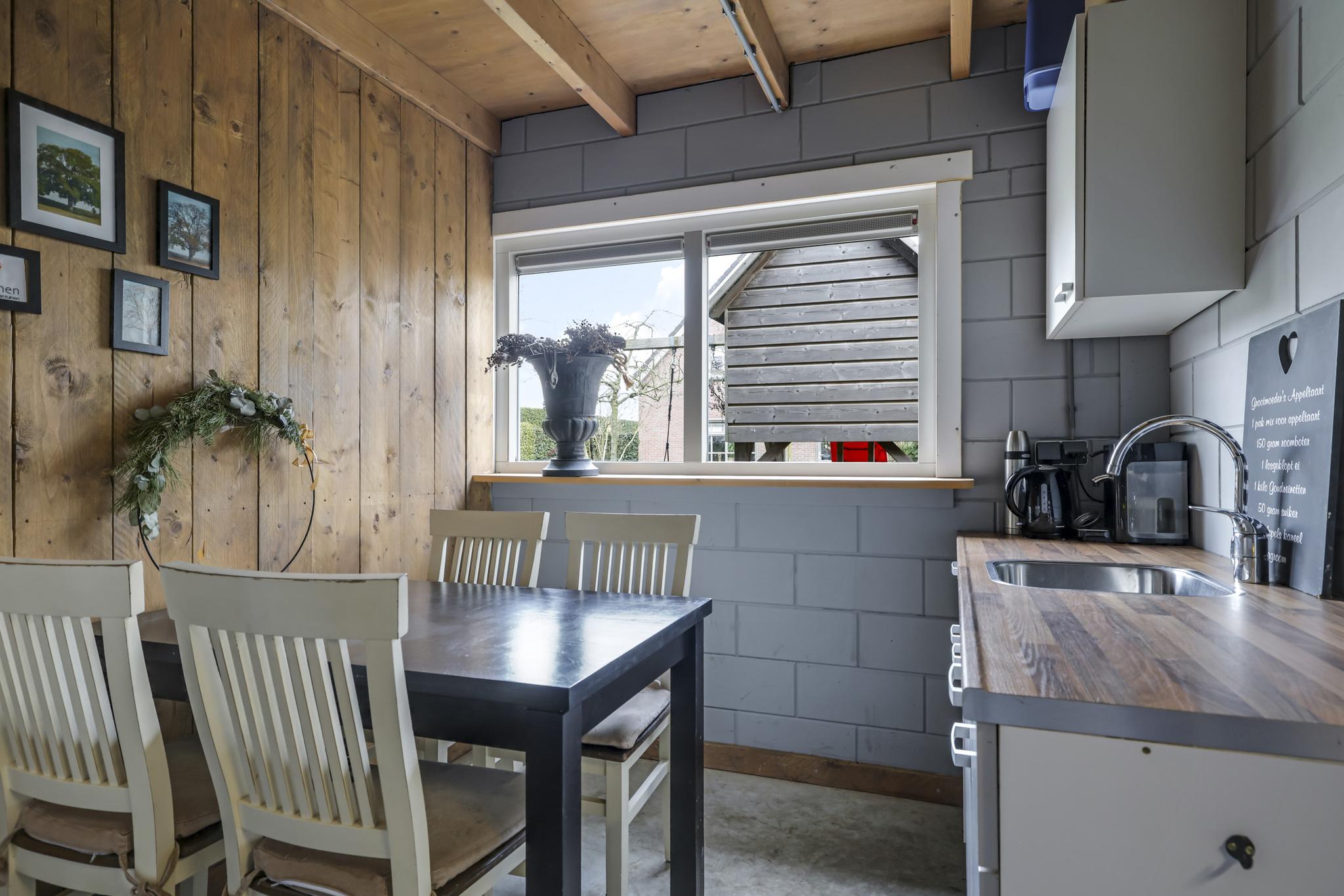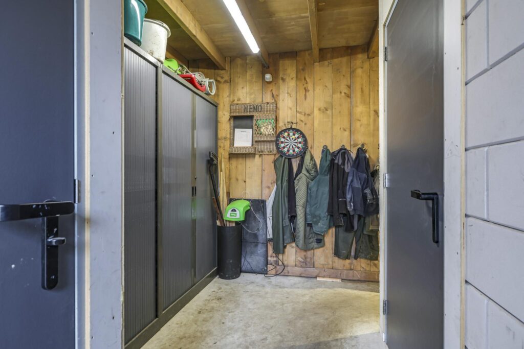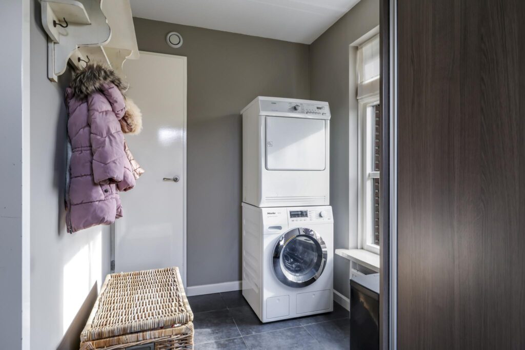 Grenzend aan de keuken bevindt zich een praktische bijkeuken. Hier zijn de aansluitingen voor de wasmachine en wasdroger aanwezig, evenals een vaste kast voor voorraad en een aparte kast met CV-ketelopstelling. Via de tuindeur loop je direct het buitenterras op.