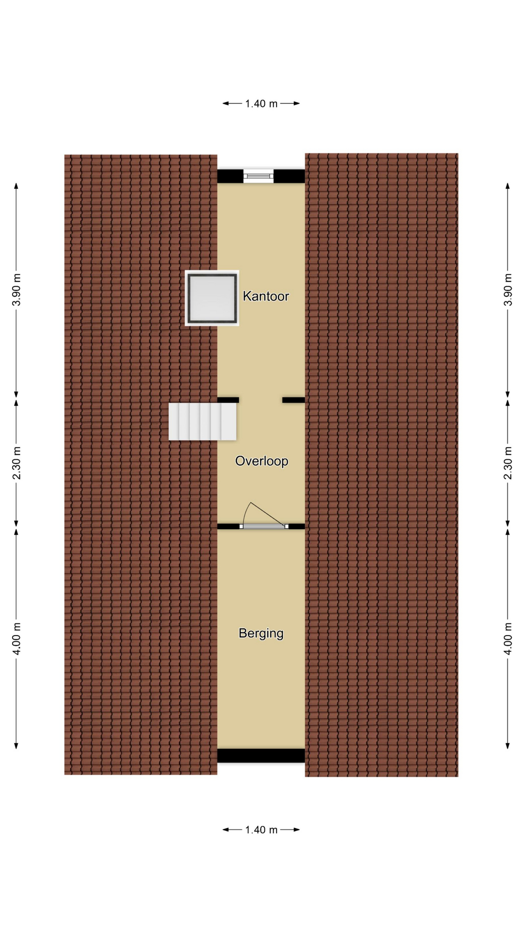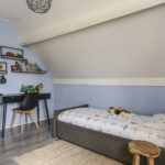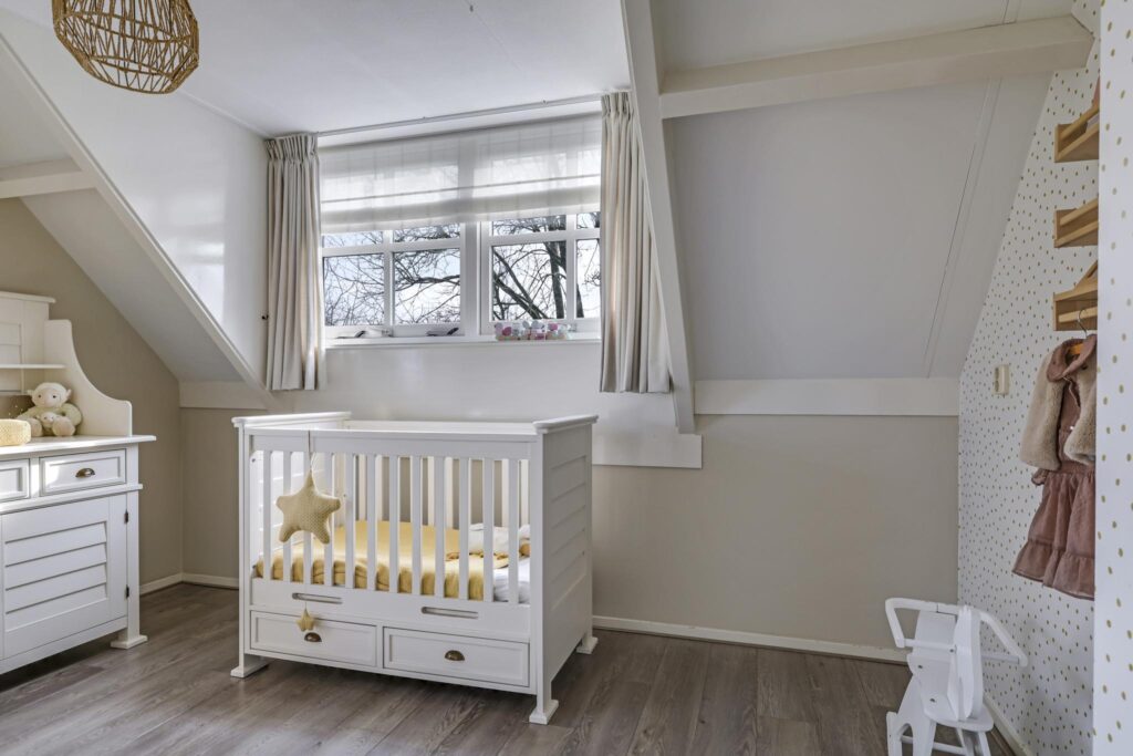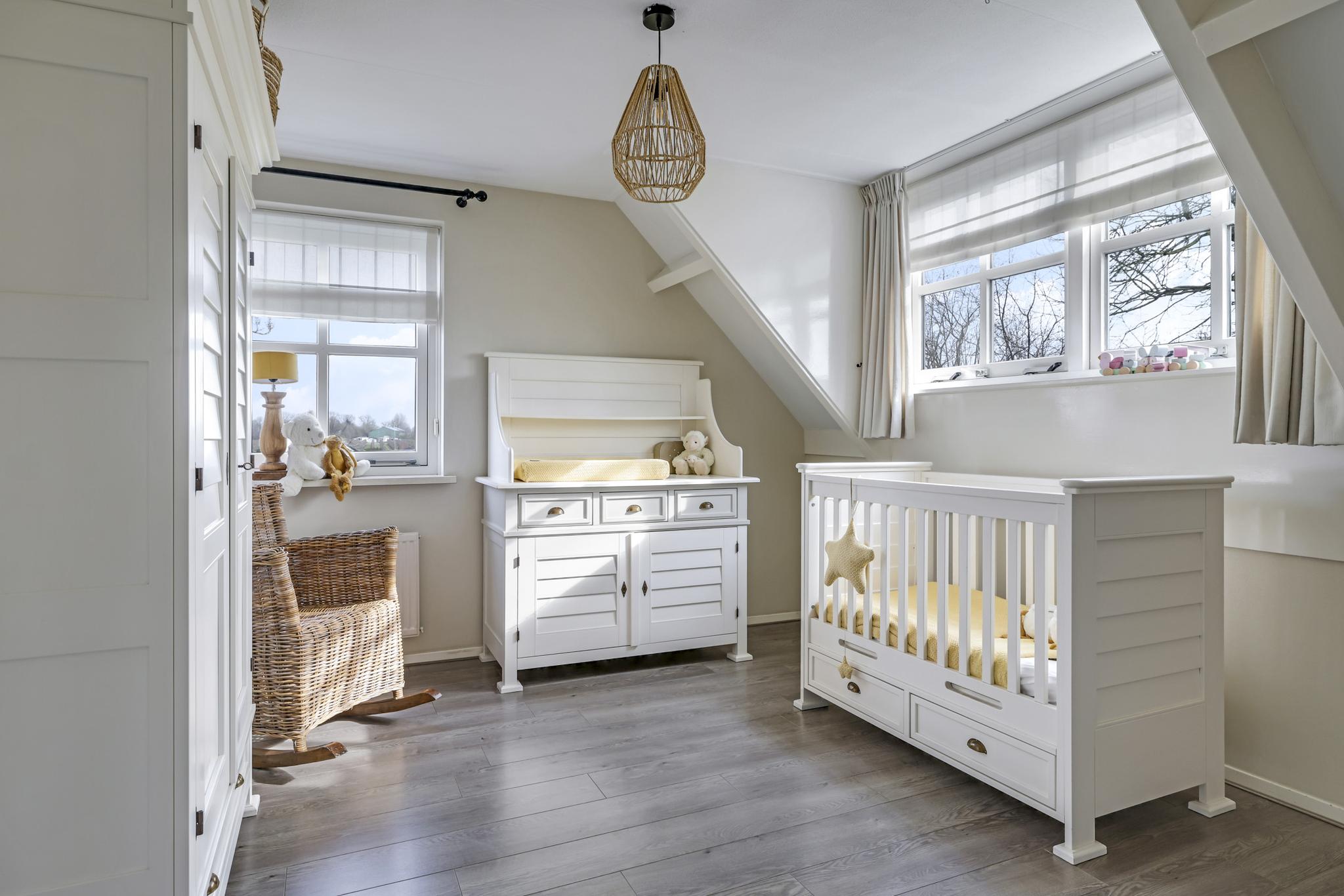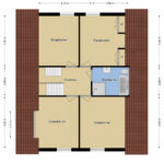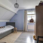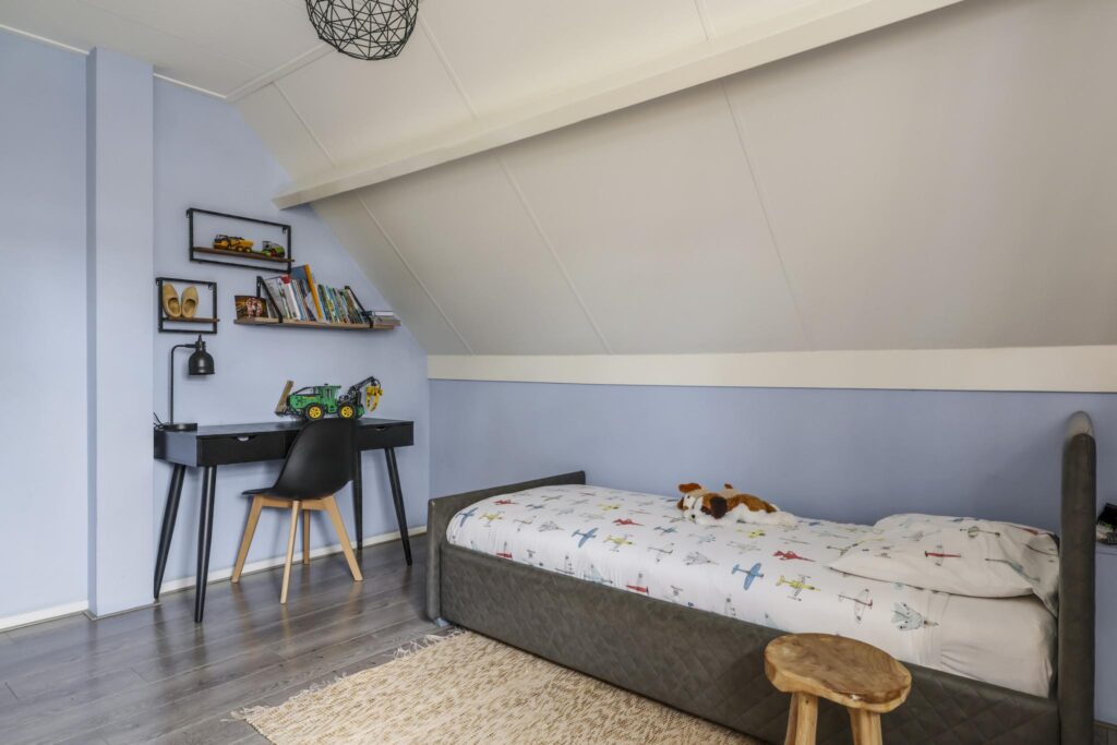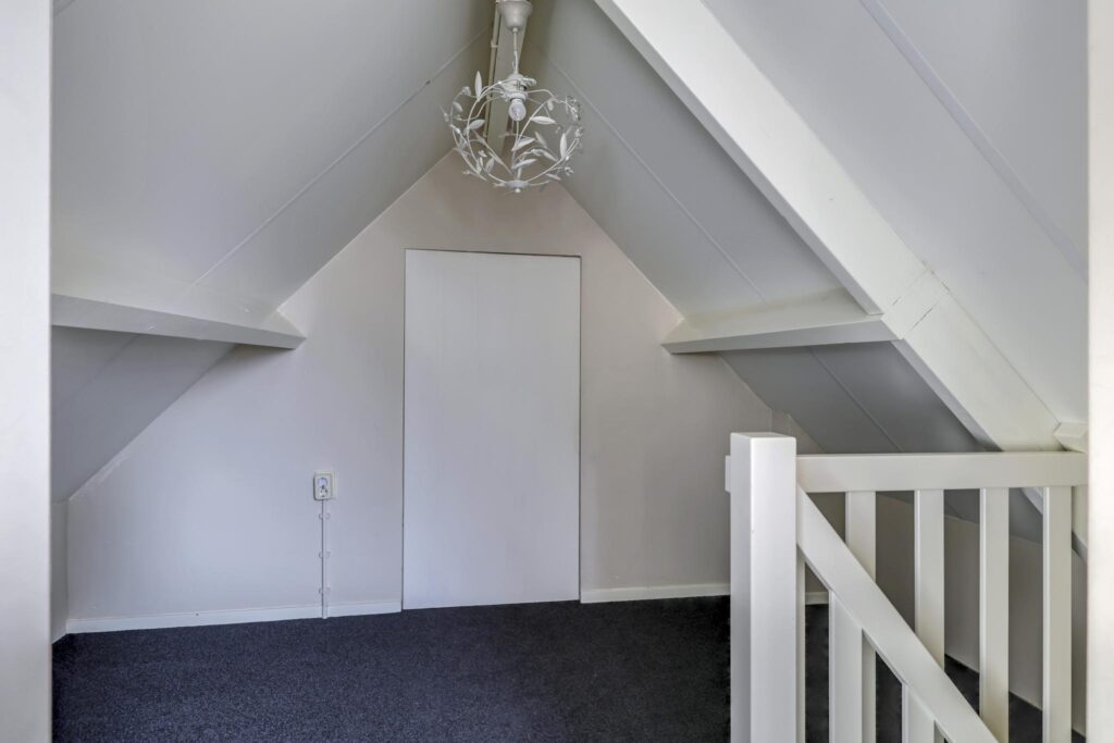 De 2e verdieping is via een vaste trap bereikbaar en biedt veel mogelijkheden (nokhoogte ca. 2 meter). Of je nu een werkkamer, studieruimte of extra slaapkamer wilt realiseren, deze ruimte is veelzijdig inzetbaar. Dankzij het dakvenster en het ronde kopgevelraam valt er voldoende daglicht naar binnen en de knieschot schuifpanelen bieden extra opbergruimte.