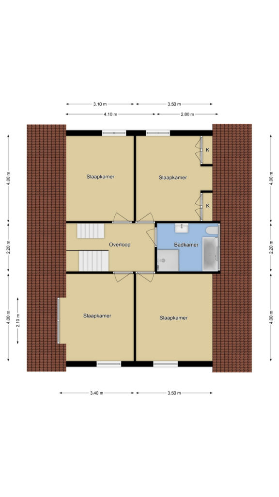 De royale overloop geeft toegang tot vier volwaardige slaapkamers. Deze zijn respectievelijk 15m2, 14m2, 14m en 12m2 groot (gemeten vanaf 1,5m hoogte). Een kleine kamer zit er dus niet tussen. Eén slaapkamer is voorzien van een dakkapel, terwijl een andere beschikt over vaste kasten. Dankzij de draai/kiepramen is ventileren eenvoudig. De slaapkamers aan de achterzijde zijn uitgerust met rolluiken, waardoor deze kamers volledig te verduisteren zijn, ideaal voor een goede nachtrust.