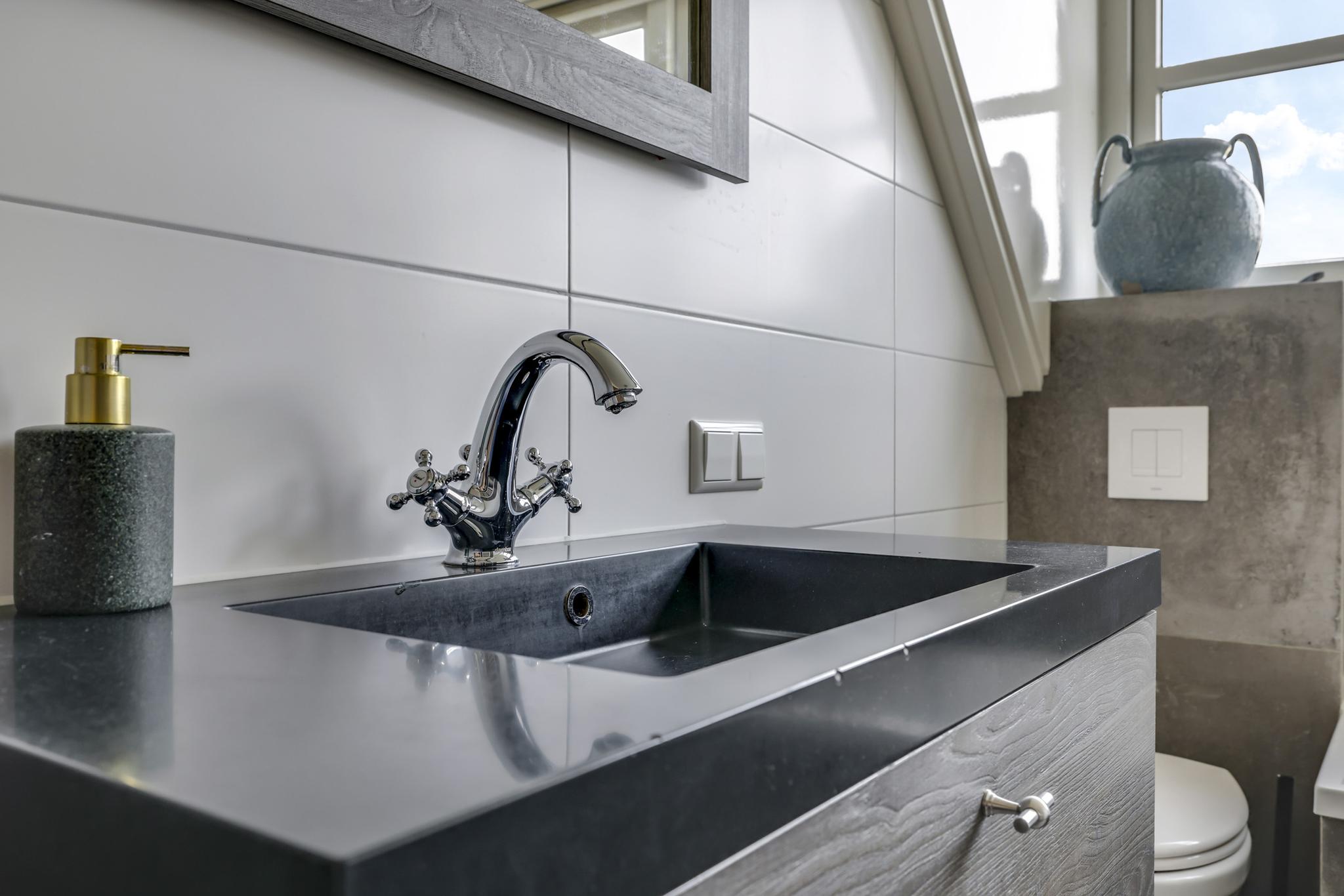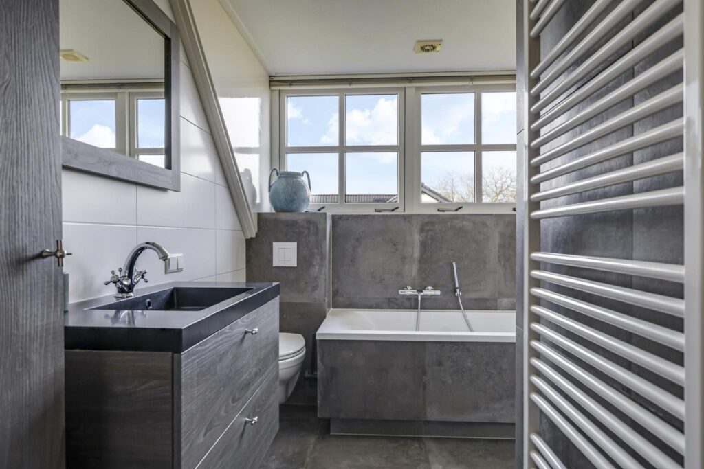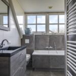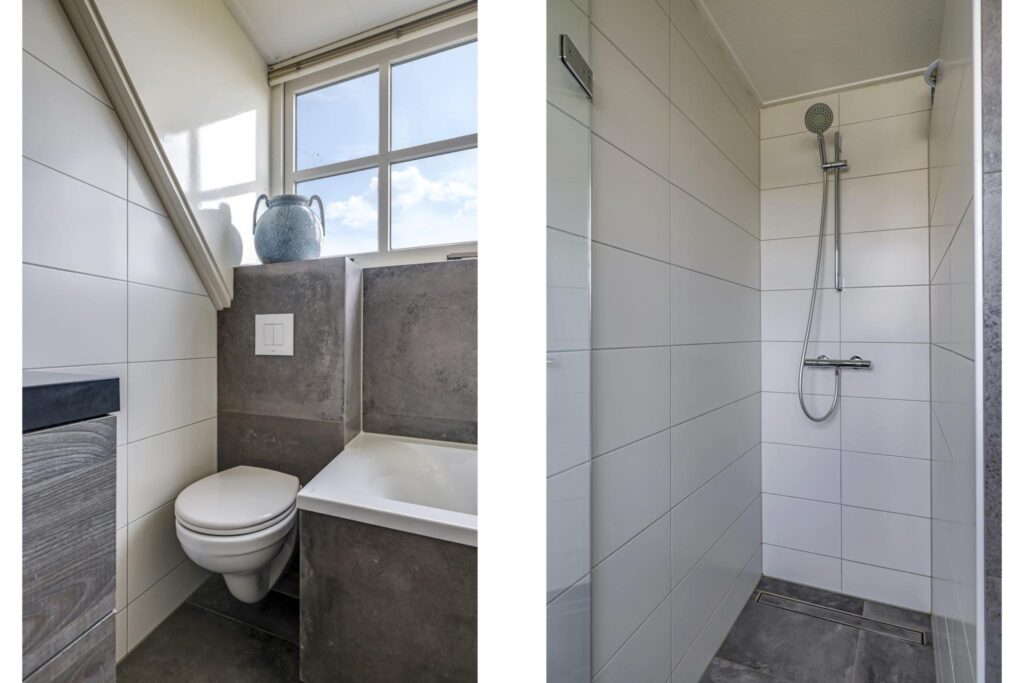 De complete en stijlvolle badkamer is voorzien van een ligbad, een inloopdouche, een wastafelmeubel met ladekorven, een natuurstenen wastafelblad en een bijpassende spiegel. Daarnaast is er een 2e zwevend toilet en een handdoekradiator aanwezig. De dakkapel zorgt voor extra ruimte en een prettige lichtinval. Verzorgd tegelwerk zorgt voor een modernen en trendy uitstraling.