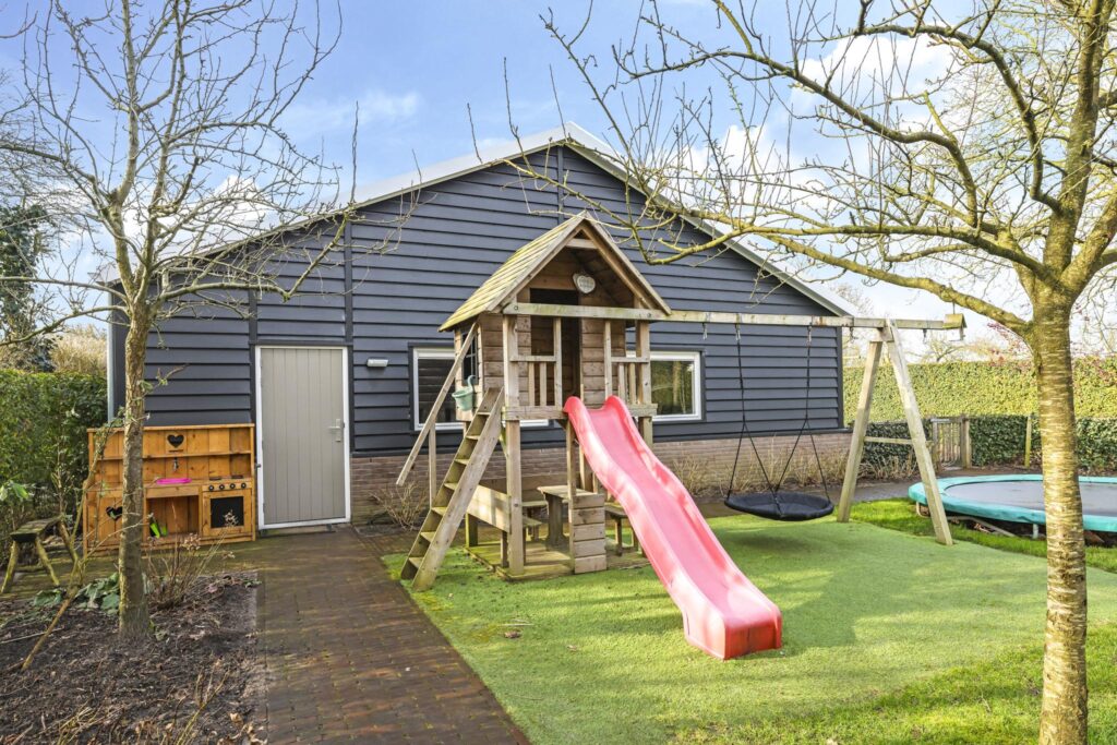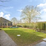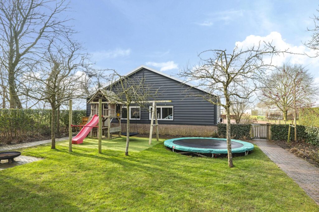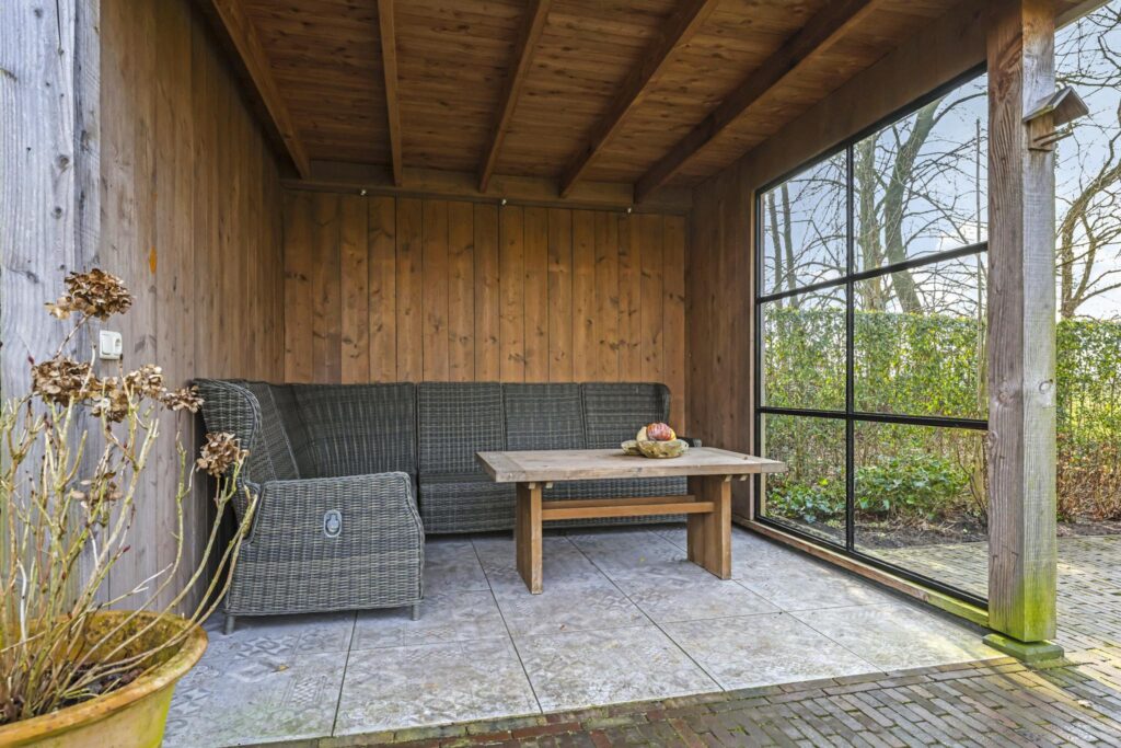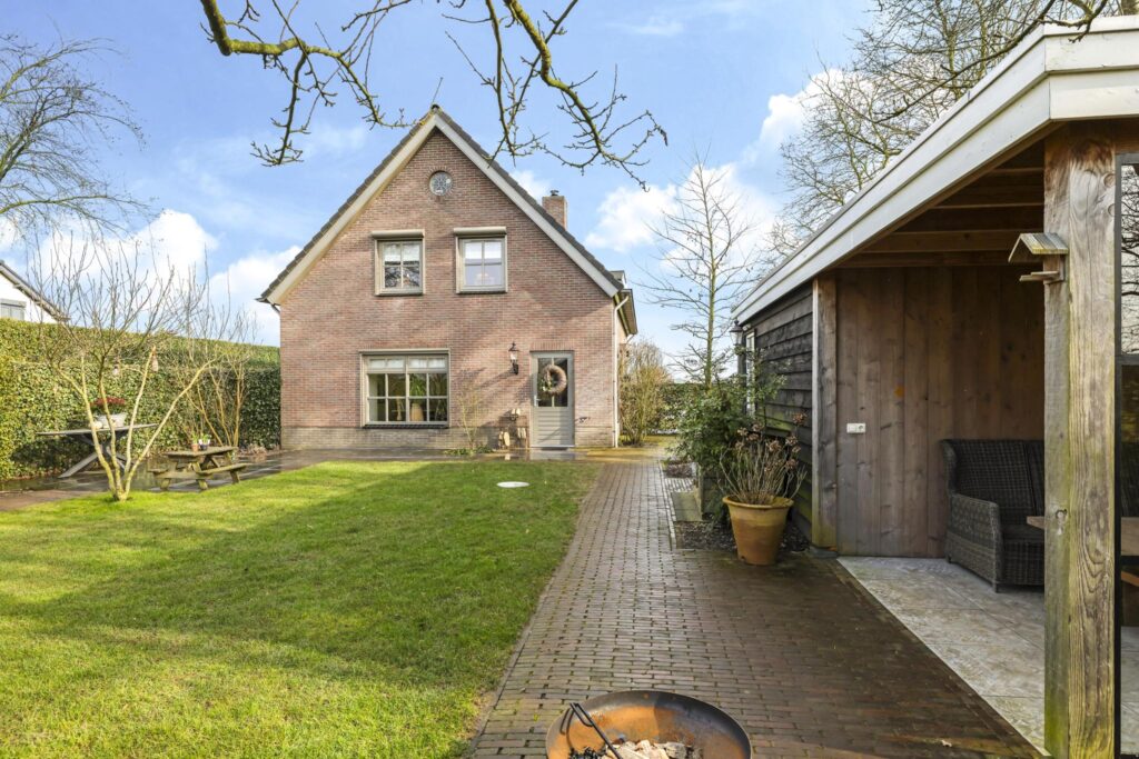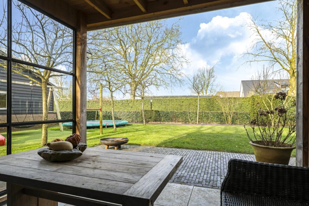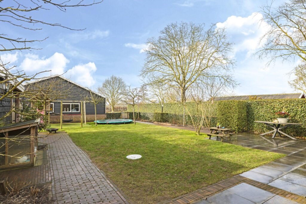 De fraai aangelegde tuin is ontworpen door een hovenier en biedt een perfecte combinatie van groen en comfort. De paden zijn aangelegd met gebakken klinkers en de terrassen met keramische tegels (60×60). Het grasgazon en de diverse bomen, waaronder fruitbomen (o.a. pruim en appel), geven de tuin een natuurlijke uitstraling. De gunstige zonligging op het zuidwesten zorgt voor veel zonuren. Dankzij het druppelsysteem blijft de tuin ook in de zomer mooi groen. Extra voorzieningen zoals een geïsoleerde schuur (12m2) met elektra en een sfeervolle veranda (9m2) met glazen pui maken het geheel compleet. De ingegraven trampoline blijft achter, het speelhuisje met glijbaan en schommel wordt ter overname aangeboden.
