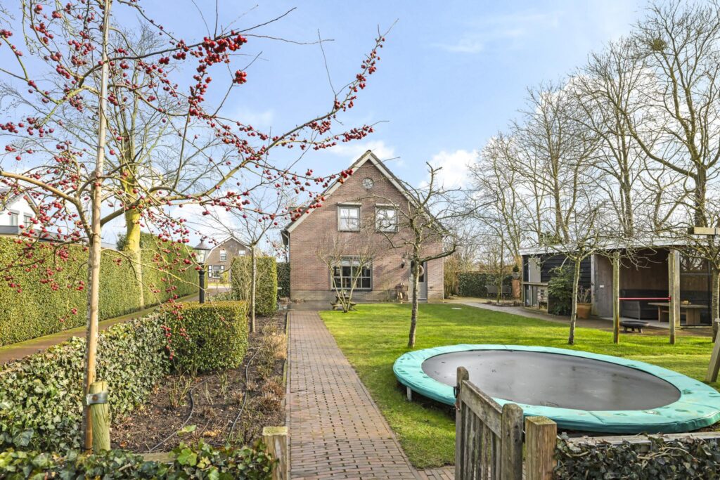 Deze woning staat op een perceel van maar liefst 1.609m2 groot hetgeen voor veel ruimte en vrijheid om de woning heen zorgt. De tuin is rondom fraai door een hovenier aangelegd met terrassen, een grasgazon, verschillende (fruit)bomen, degelijke bestrating en tegelwerk (keramiek 60×60) en er is ruimte voor meerdere speeltoestellen. Tevens heeft het een gunstige zonligging waarbij de privacyvolle achtertuin op het zuid/westen is gelegen. Aan de linkerzijde van het perceel is een afsluitbare oprit aangelegd. Aan de rechterzijde vind je een diepe oprijlaan met meerdere parkeerhavens, toegang tot de garage én de loods met aan de achterzijde een royale ‘parkeerplein’ met ruimte voor grote ‘bedrijfsvoertuigen’.