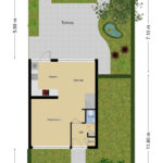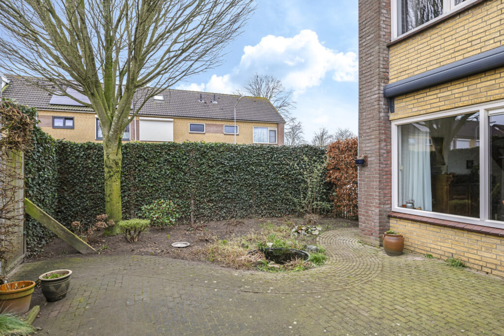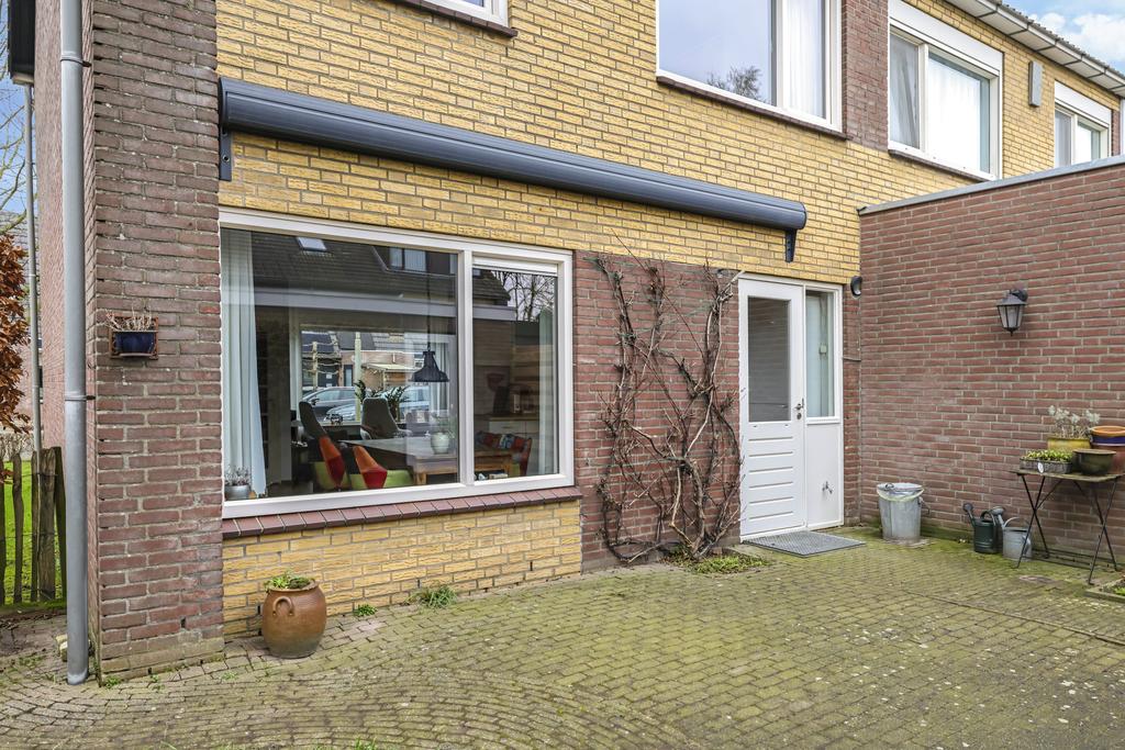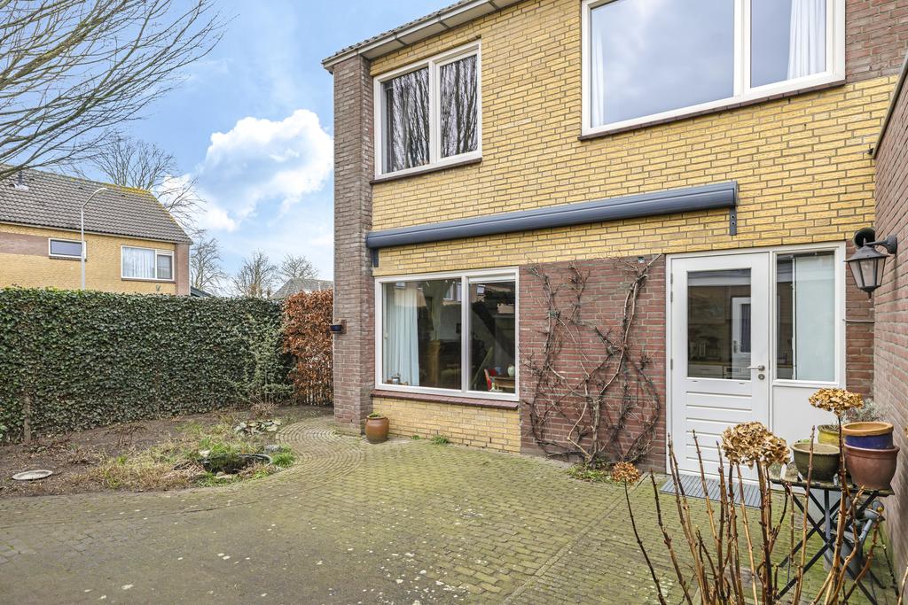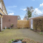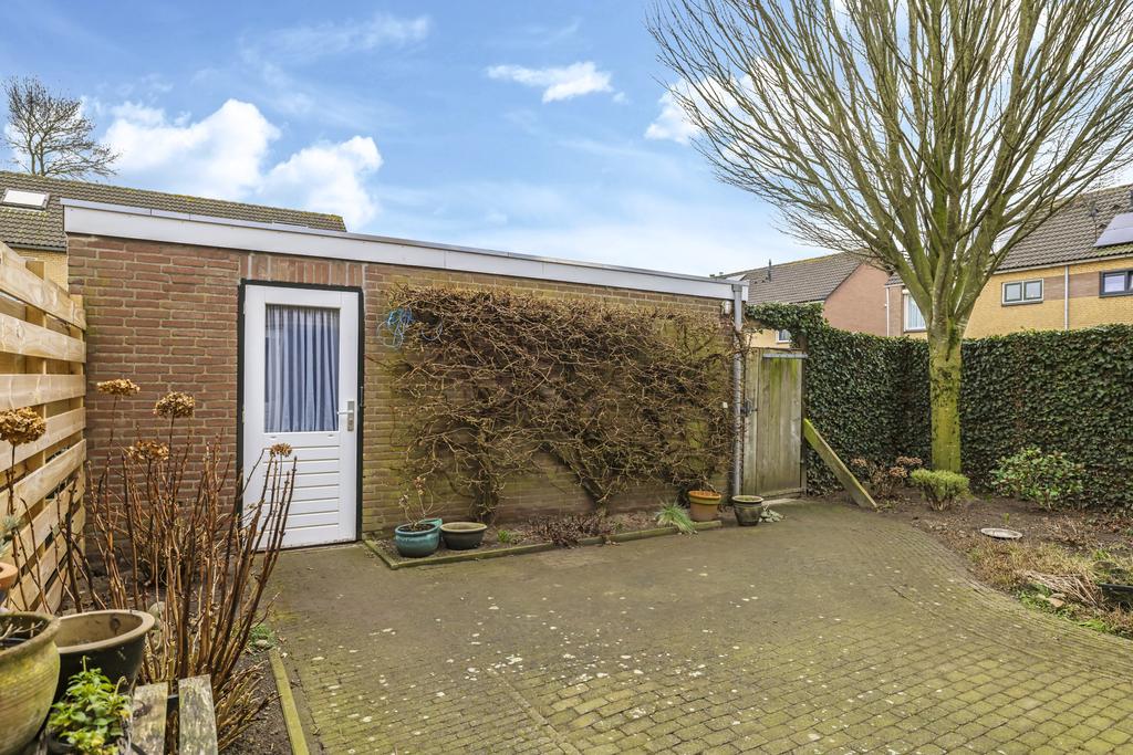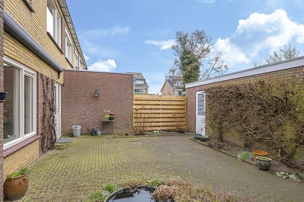 Doordat het een hoekwoning betreft is de tuin ruim 3 meter breder dan normaal. Hierdoor heb je extra ruimte voor nog een zithoek of planten en struiken. Door de ligging pal op het zuiden kan je hier ook maximaal van de zon genieten. Om een plekje in de schaduw te kunnen creëren is er elektrisch bedienbare zonwering aan de achtergevel geplaatst. Achter in de tuin staat de garage welke via de tuin toegankelijk is. Naast de garage is een poort aanwezig welke dient als achterom.