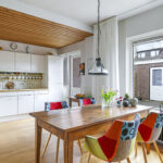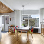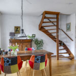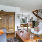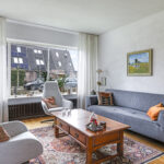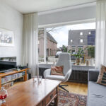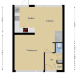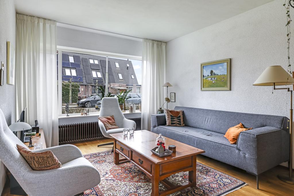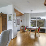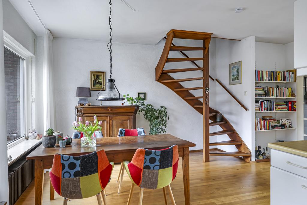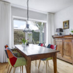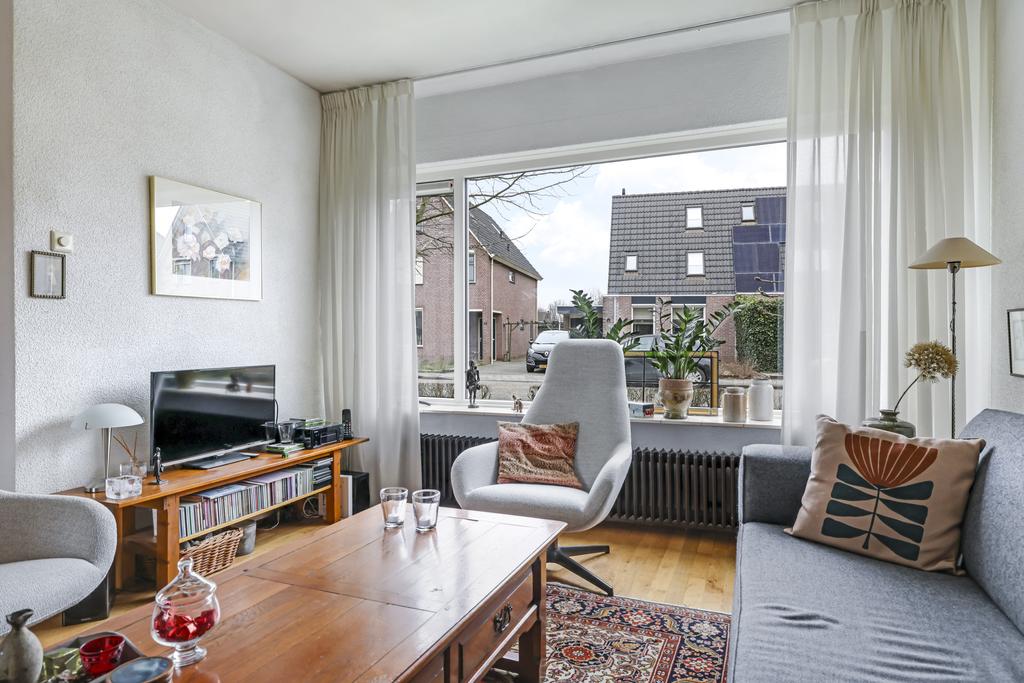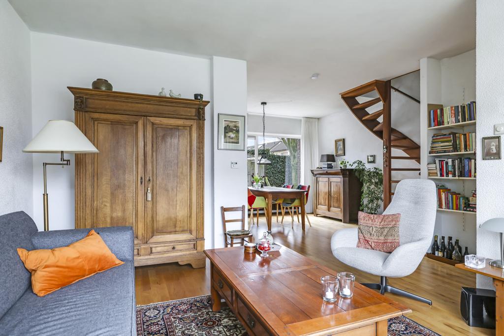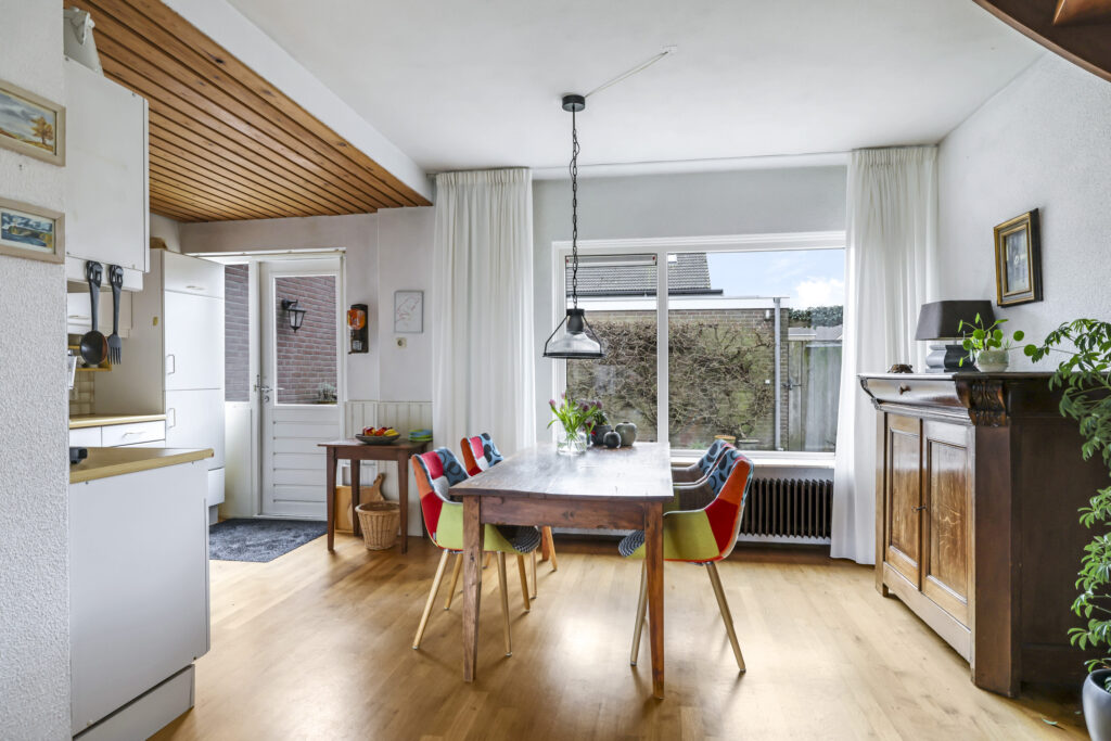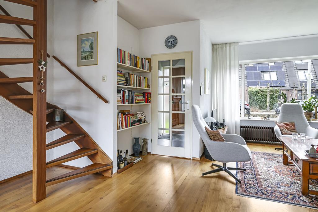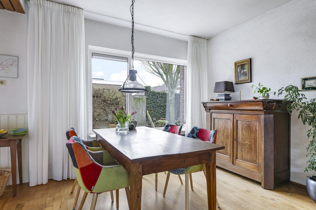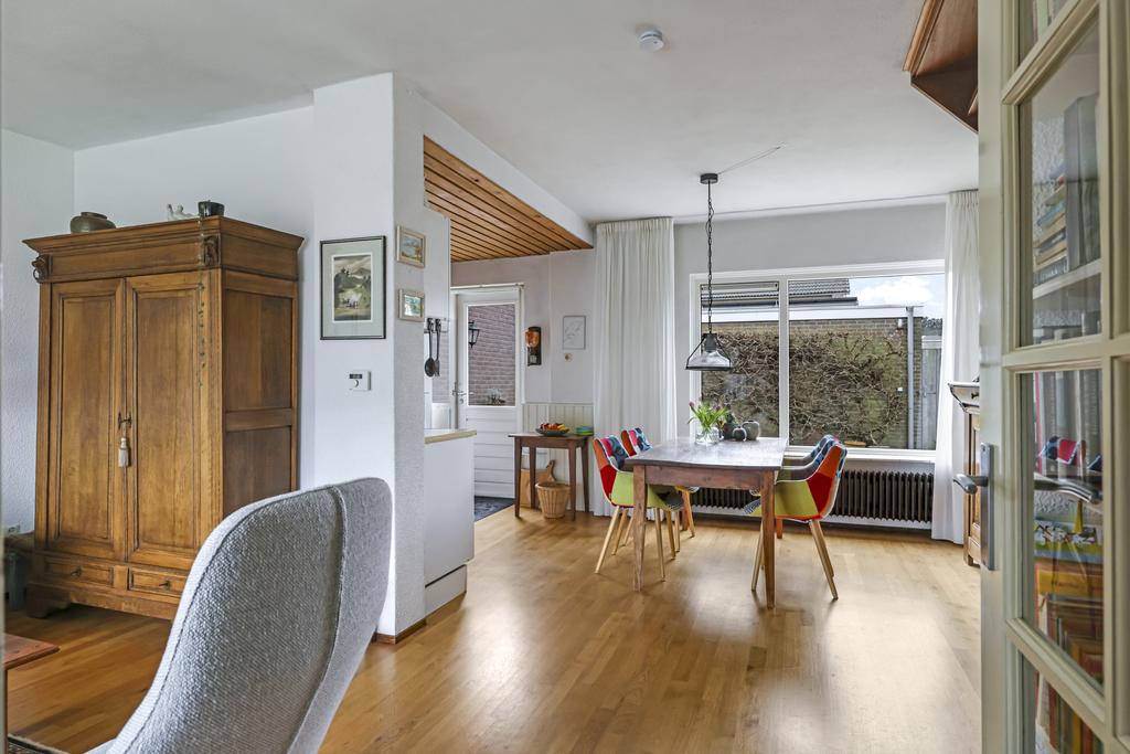 Deze woonkamer straalt veel sfeer uit, dit komt mede door de massief houten vloer en ook de indeling van de ruimte. De woonkamer heeft een Z-indeling wat zorgt dat er een duidelijke verdeling is tussen de zit- en het eetgedeelte waarbij er toch onderling contact is. In de zithoek kan je een lekkere grote hoekbank kwijt en in de eethoek is plaats voor een 4 tot 6 persoons eettafel. Grote ramen in zowel de voor als achtergevel zorgen hierbij voor veel lichtinval. Zonwering is aan de achtergevel geplaatst om op een warme zomer de zon van het glas te kunnen weren.
