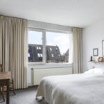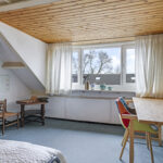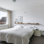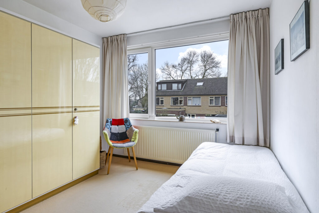 Via de open trapopgang in de kamer bereiken we de 1e verdieping. De trapopgang is aan de bovenzijde afsluitbaar middels een schuifdoor waardoor je de warmte in de woonkamer houdt. Deze overloop schakelt op deze woonlaag 3 slaapkamers en de badkamer aan elkaar. Alle kamers zijn optimaal in te richten vanwege de rechte muren. De slaapkamers zijn respectievelijk 14m², 11m² en 6,5m² groot. Grote raampartijen zorgen hier voor veel lichtinval.