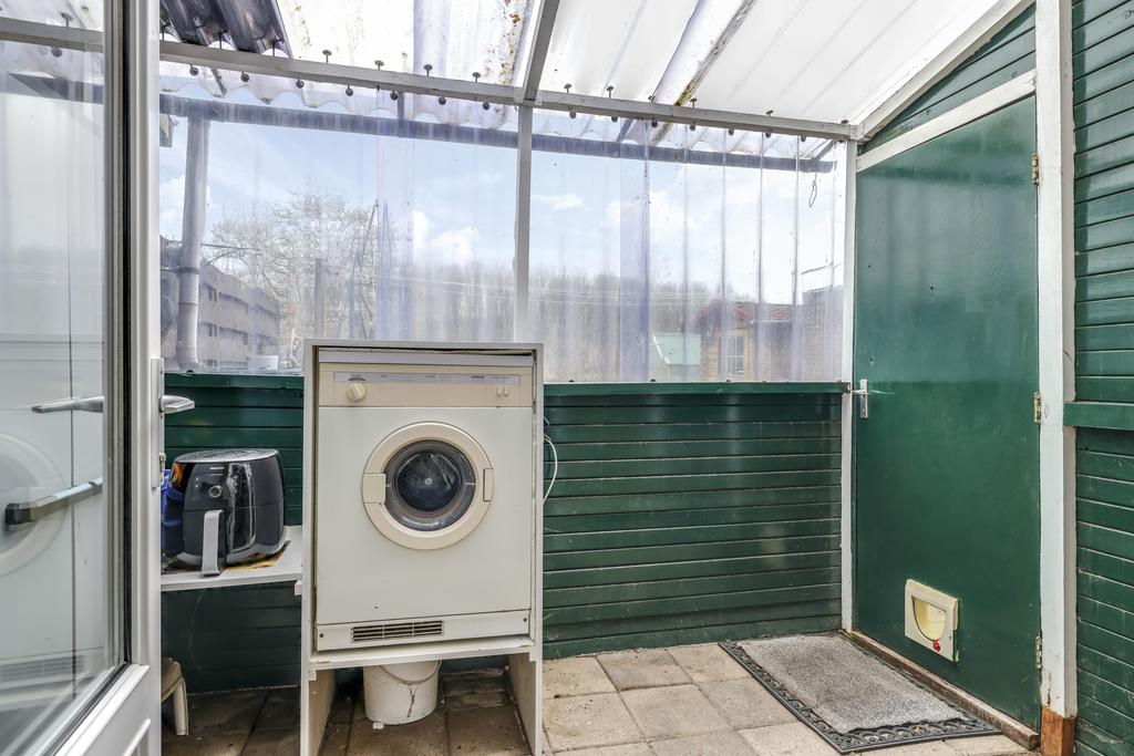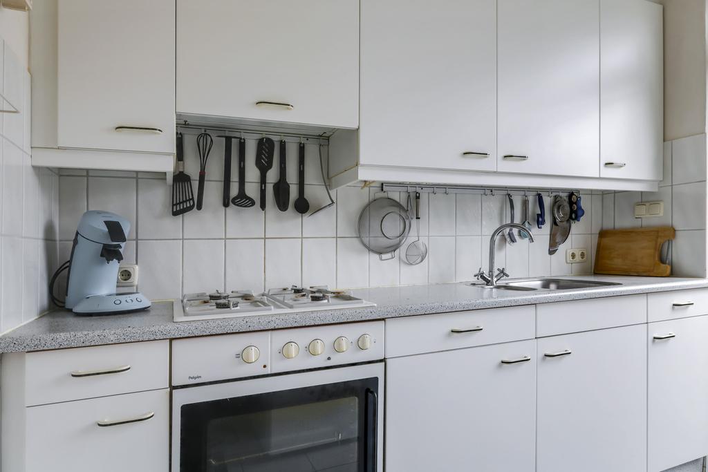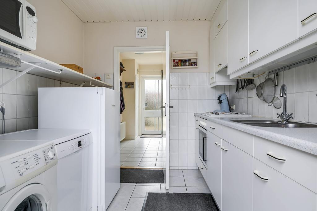 Deze woning heeft de originele dichte keuken. Bij veel van dit type woningen wordt de scheidingwand tussen de keuken en de woonkamer doorgebroken om een open karakter te creëren. Je zou dan ook kunnen kiezen voor bijvoorbeeld een hoekopstelling. Het huidige keukenblok is eenvoudig te noemen waarbij de apparatuur los tegenover het keukenblok is geplaatst. Een tuindeur biedt toegang tot de aangebouwde berging.