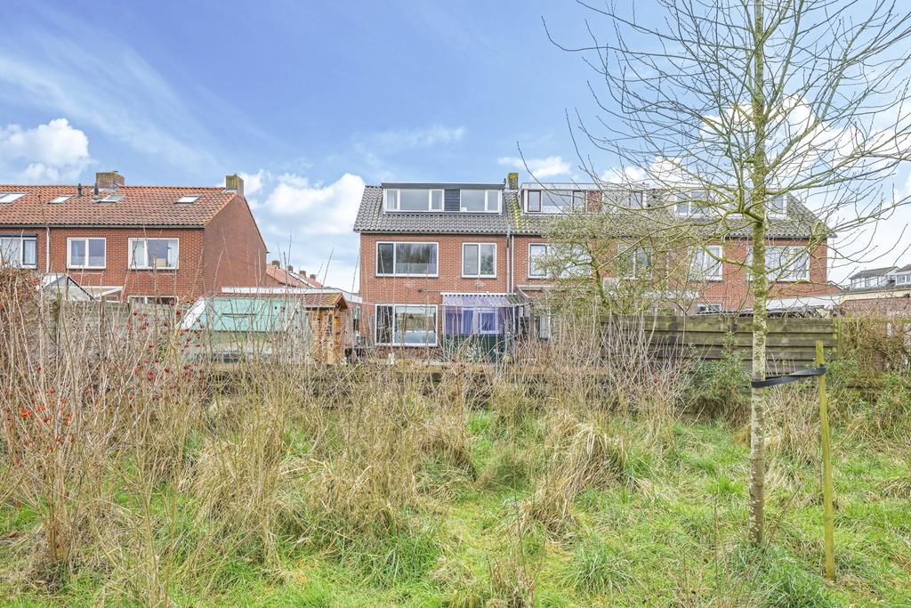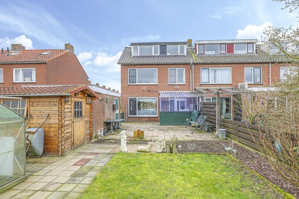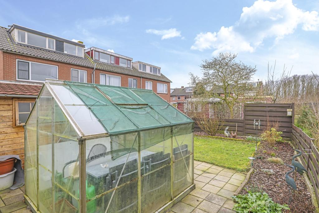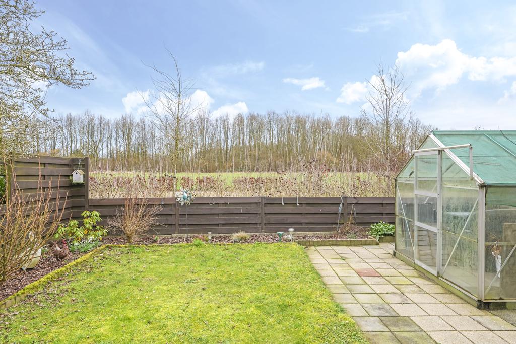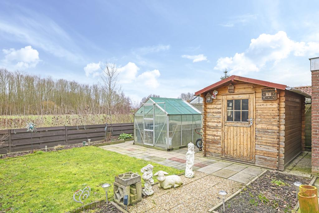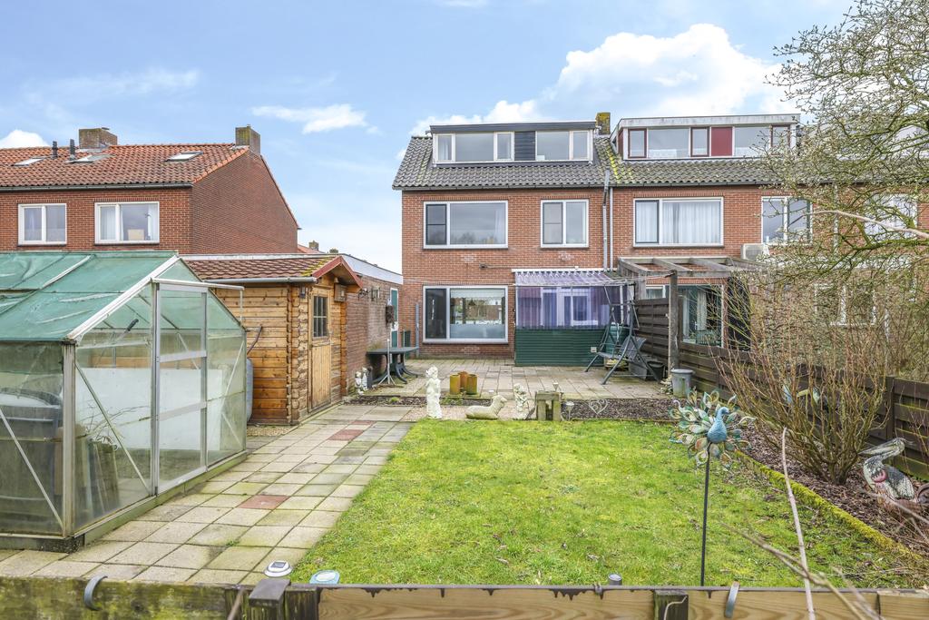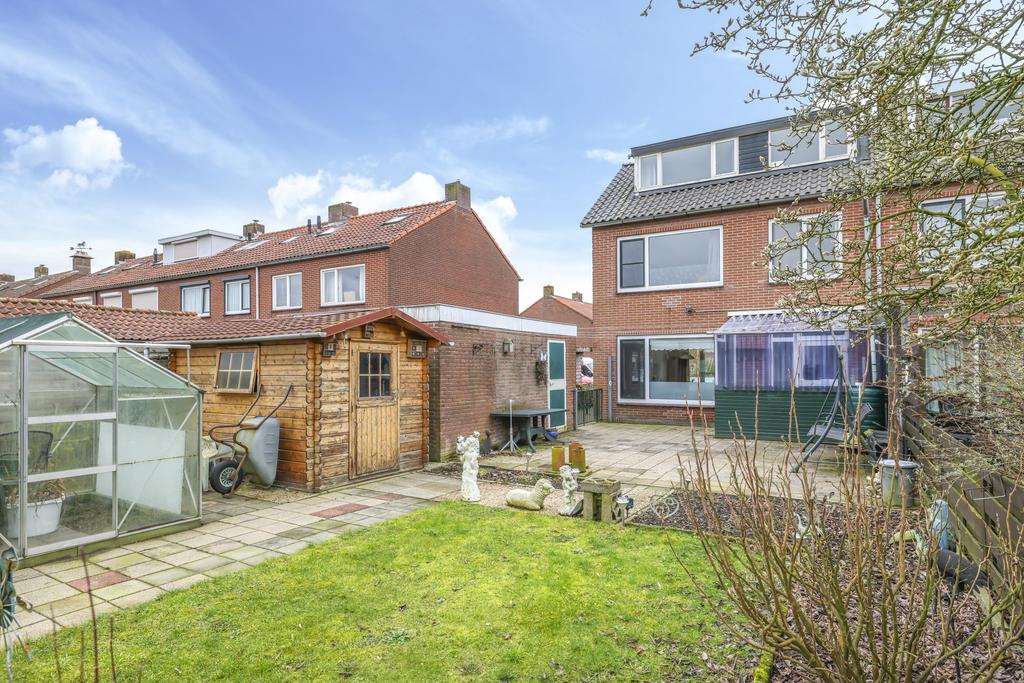 Eén van de grote pluspunten van deze gezinswoning is de achtertuin. Deze ligt niet alleen bijzonder vrij maar heeft ook een mooie diepte (ca. 13m) en is breder (ca. 10m) dan normaal vanwege de hoekligging. Doordat de tuin zo diep is, geniet je er de gehele dag van de zon ondanks de ligging op het noorden. In de tuin staan diverse bijgebouwen, namelijk een stenen garage, een houten schuur en een hobbykas. Houd je van tuinieren dan kan je hier zeker je hart ophalen. Aan opbergruimte geen gebrek en in de hobbykas kweek jij eenvoudig je eigen groente en fruit. Aan de zijkant is de tuin toegankelijk middels een poort welke tussen de woning en de garage in is geplaatst.