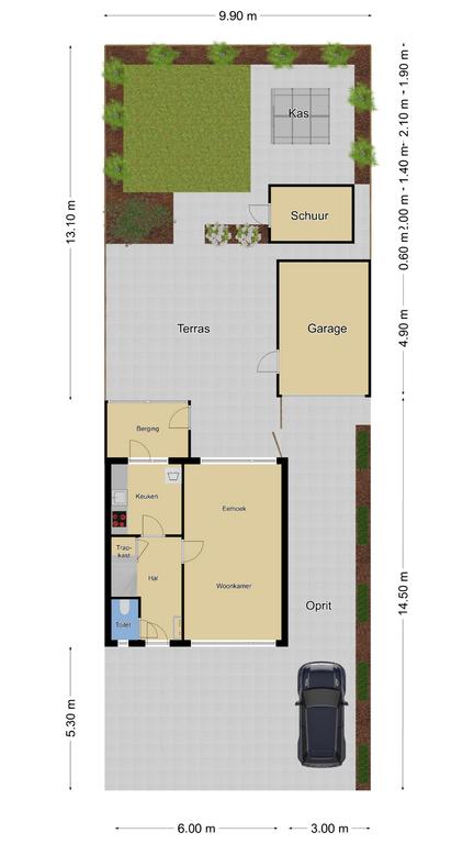 Voor de garage is nog een oprit gelegen. Deze is ca. 14,5m diep waardoor je hier eenvoudig meerdere auto’s achter elkaar kan parkeren. Zo hoef je nooit te zoeken naar een parkeergelegenheid. Overigens heeft de oprit nog geen verlaging van de stoep.