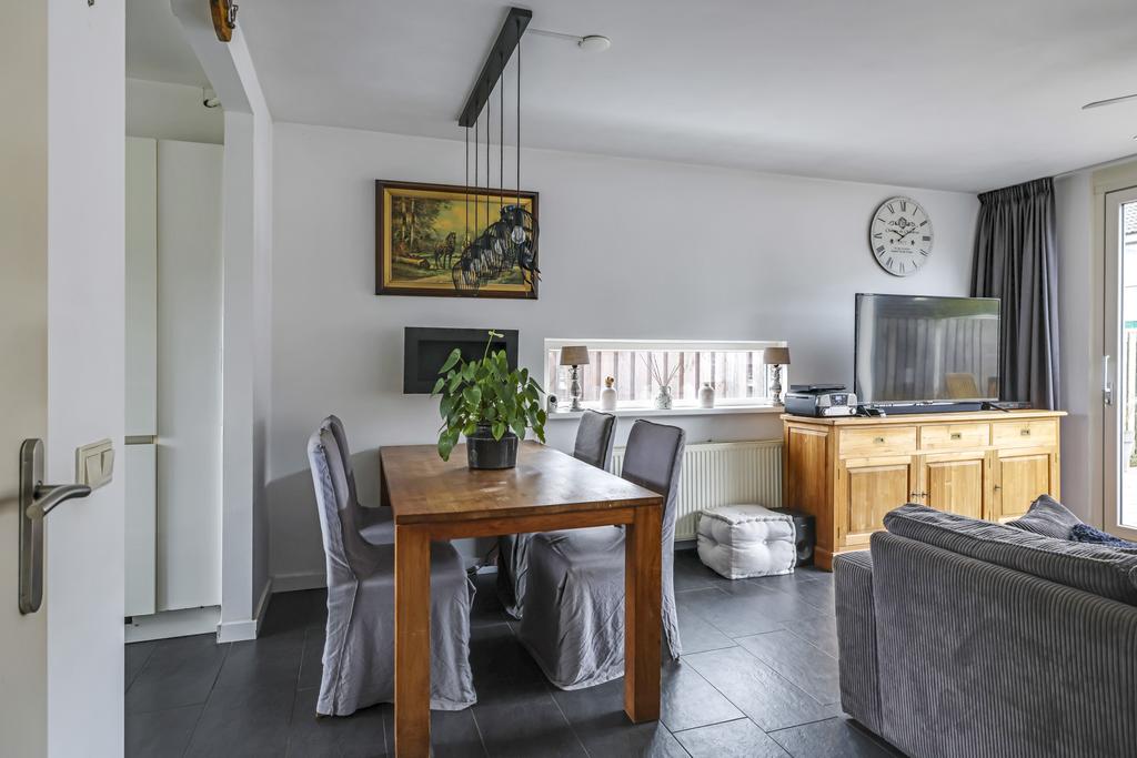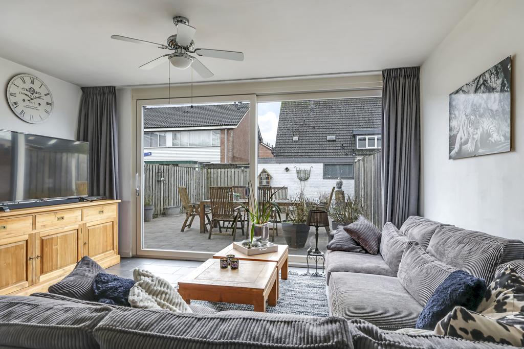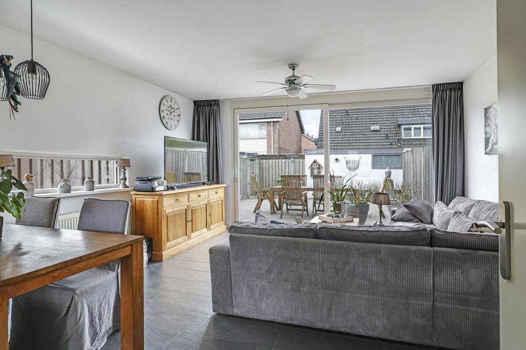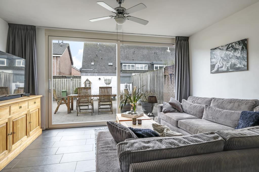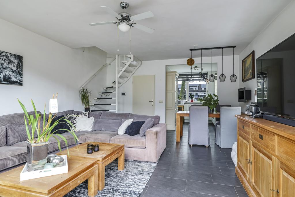 De woonkamer is aan de achterzijde van de woning gelegen en o.a. voorzien van een plavuizen vloer en een schuifpui. Dit zorgt ervoor dat, zeker in de zomerdagen, de woonkamer en de tuin tot één geheel gevormd kunnen worden. Opvallend is het raam in de zijgevel wat voor extra lichtinval en een speels effect zorgt. Ondanks dat de trap zich in de kamer bevindt, is de ruimte praktisch ingedeeld en hoef je niet het gevoel te krijgen dat je door de trap ruimte in moet leveren. De gestucte wanden maken het geheel compleet.