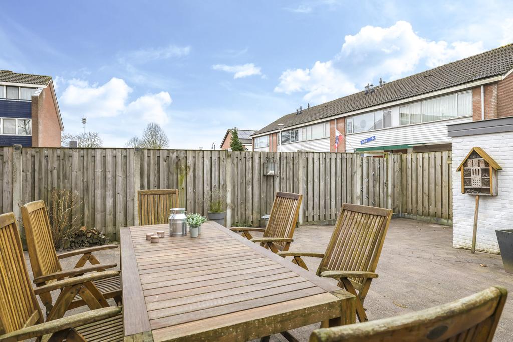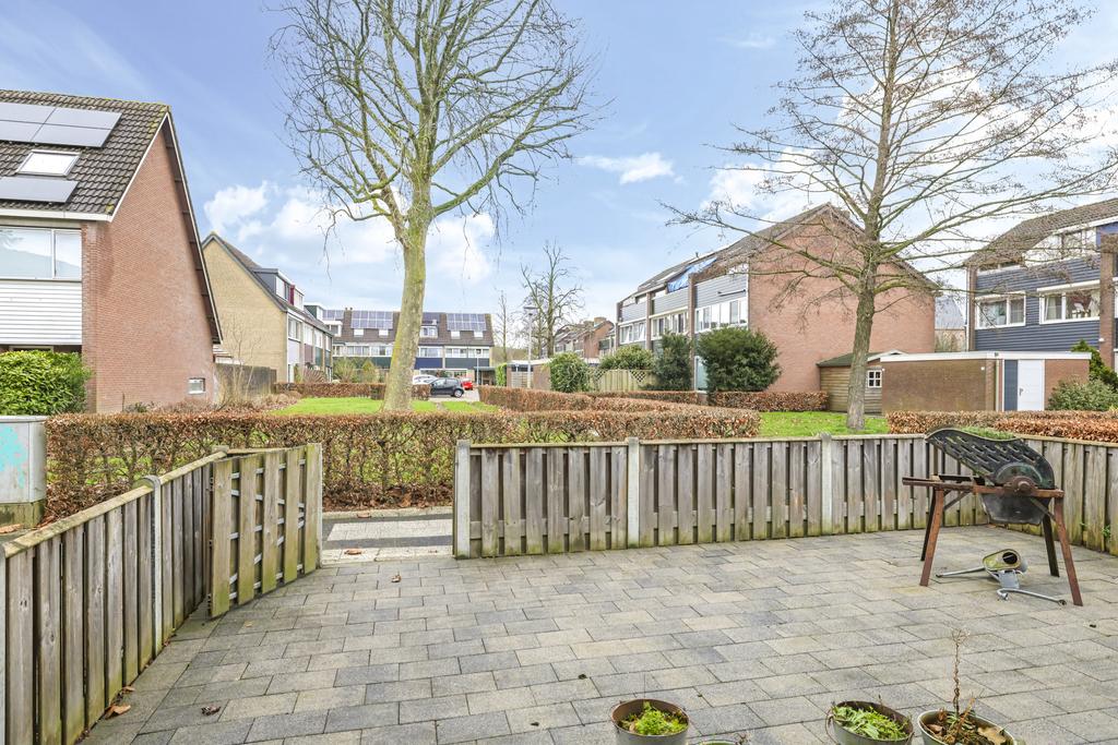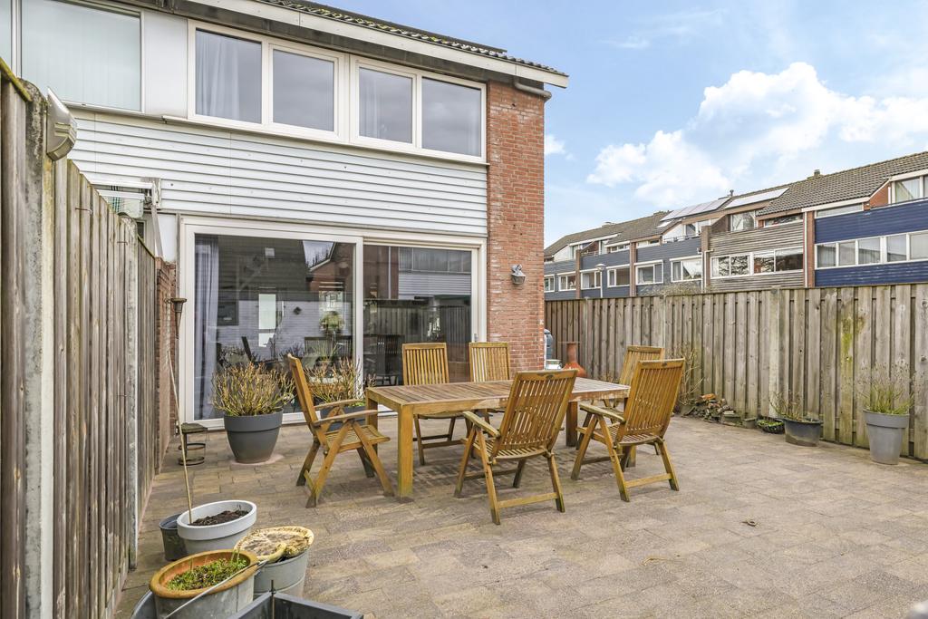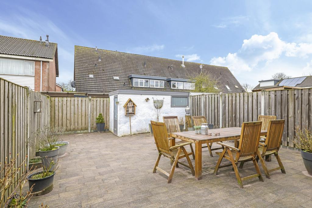 Wanneer we de schuifpui openen, bereiken we de ruime, onderhoudsvriendelijke en zonnige achtertuin op het zuiden. De diepte van de tuin vinden we in de meeste nieuwbouwwijken niet meer; deze is ruim 12m lang. Doordat de woning een hoek betreft is er ook een mooie breedte van 7m. Achter in de tuin is een stenen berging gelegen voorzien van elektra. Via de zijkant van de woning kun je makkelijk met de fiets of met tuingereedschap achter komen.