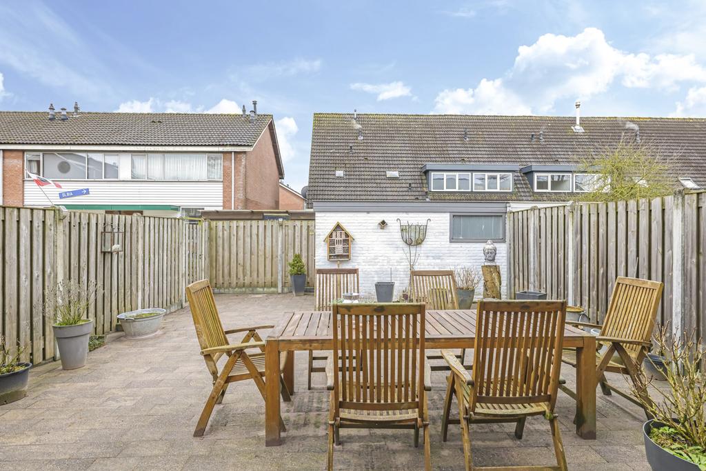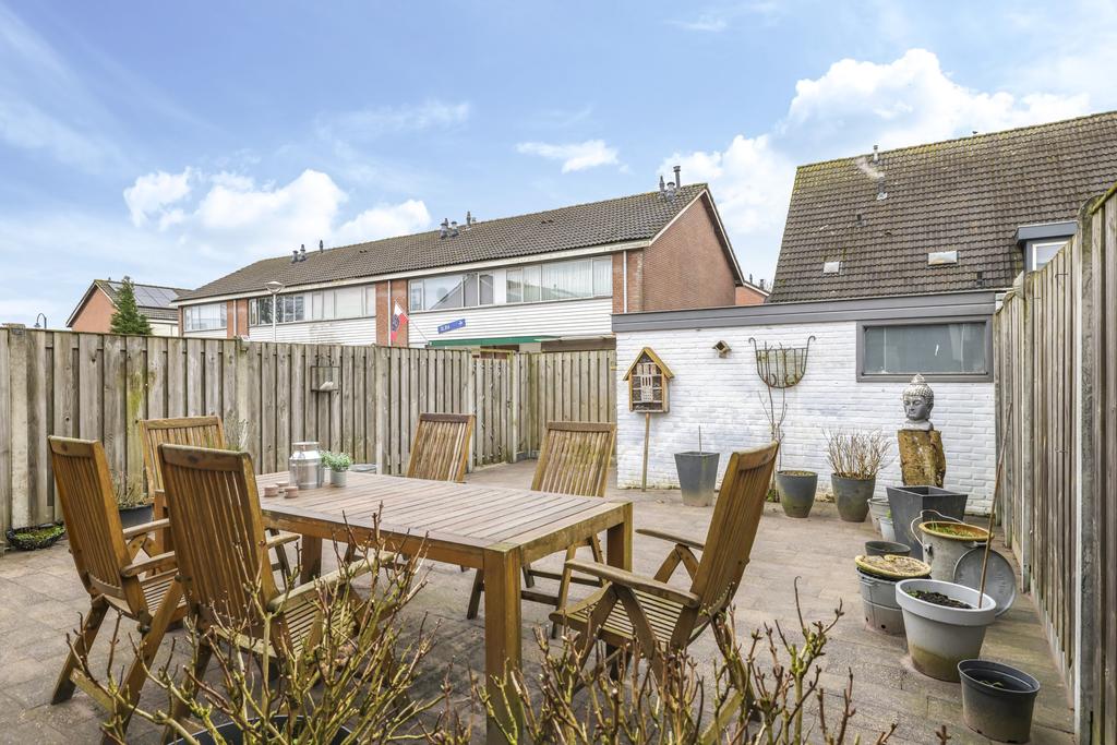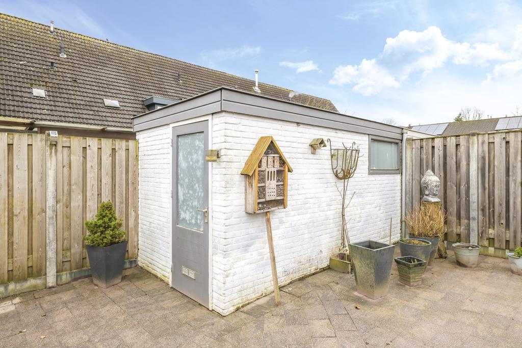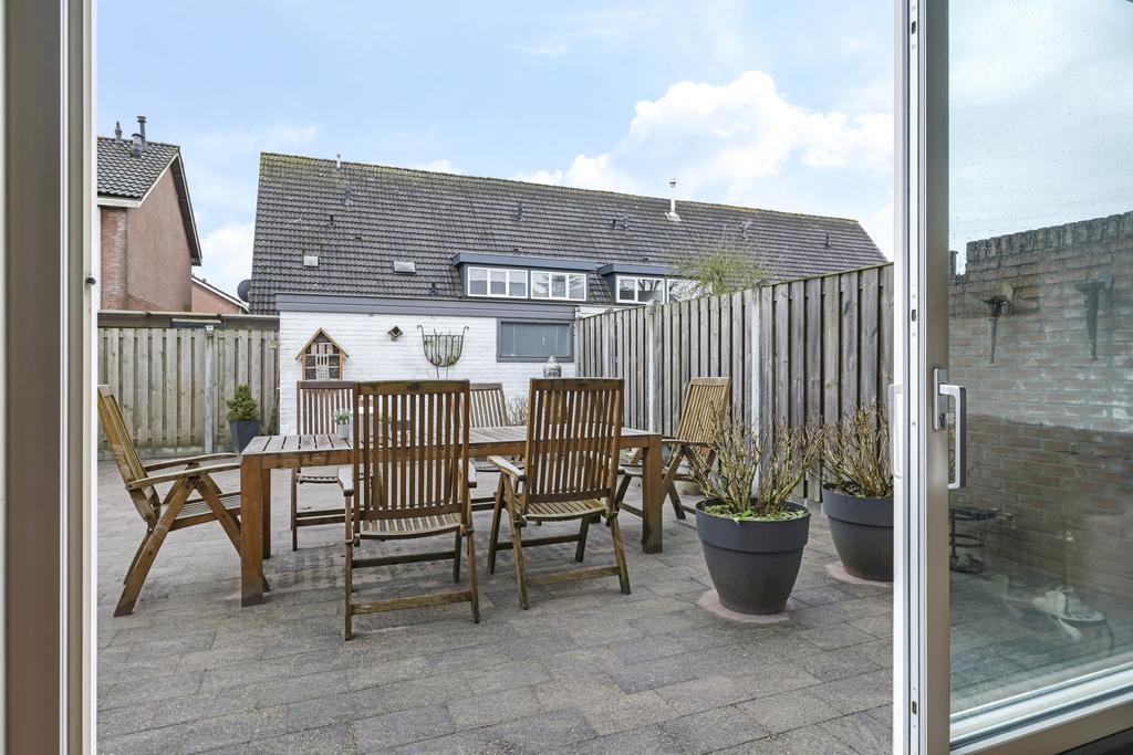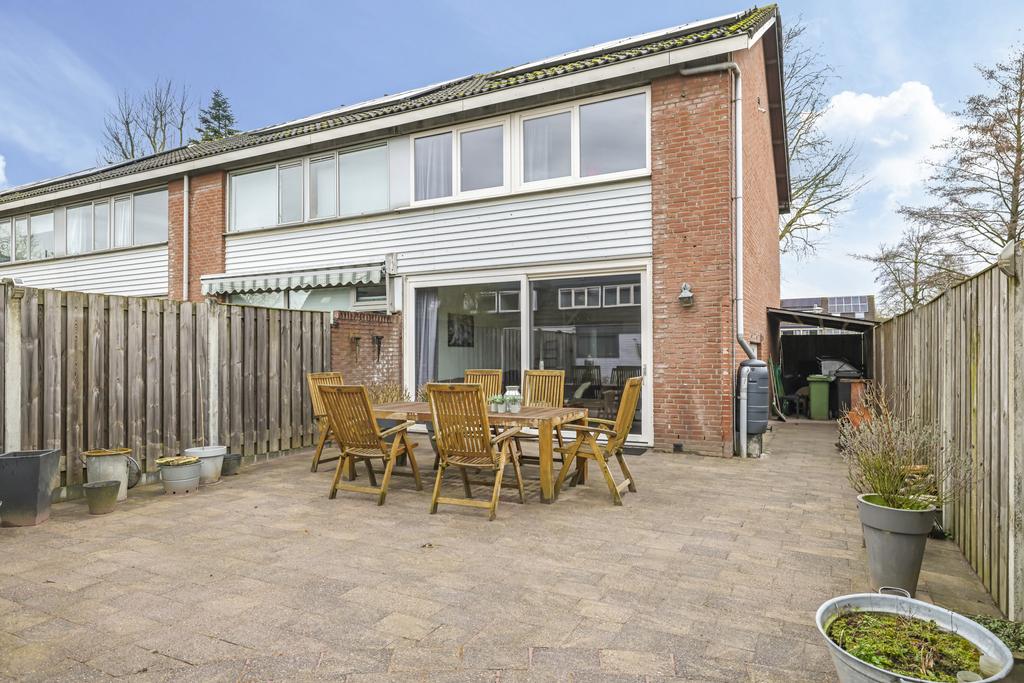 Wanneer we de schuifpui openen, bereiken we de ruime, onderhoudsvriendelijke en zonnige achtertuin op het zuiden. De diepte van de tuin vinden we in de meeste nieuwbouwwijken niet meer; deze is ruim 12m lang. Doordat de woning een hoek betreft is er ook een mooie breedte van 7m. Achter in de tuin is een stenen berging gelegen voorzien van elektra. Via de zijkant van de woning kun je makkelijk met de fiets of met tuingereedschap achter komen.