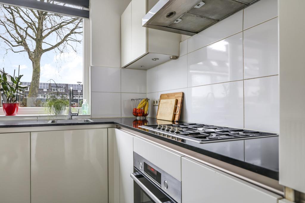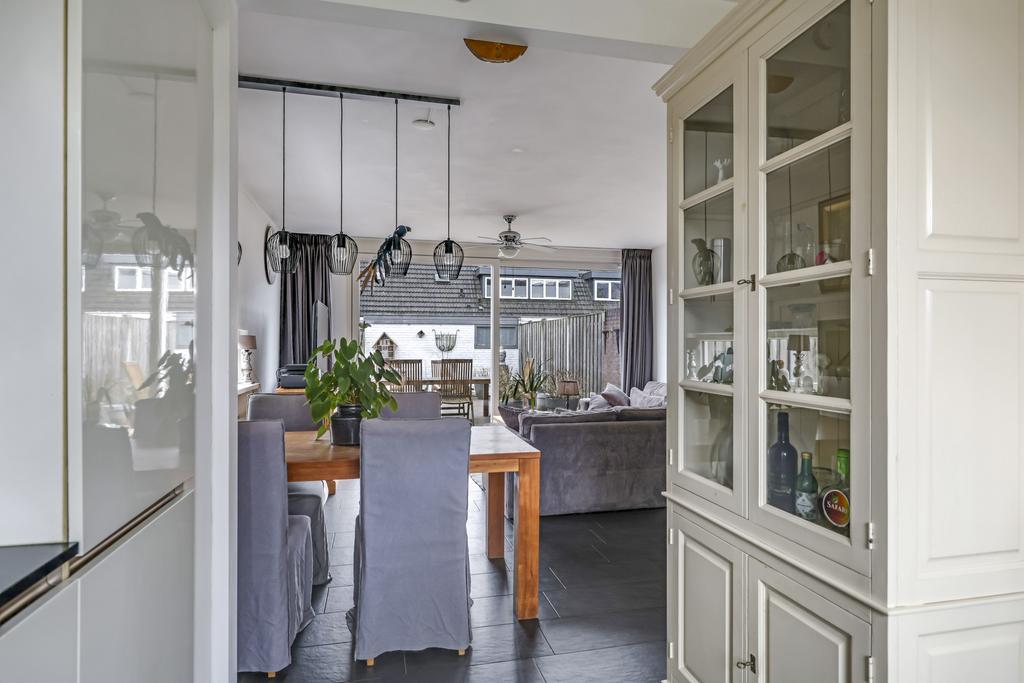 Aan de voorzijde van de woning bevindt zich de keuken met diverse inbouwapparatuur. Zo is er een 5-pits gaskookplaat, afzuigkap, combi-oven/magnetron, een vaatwasser, en een koel/vriescombinatie aanwezig. Ook zijn er voldoende onder- en bovenkastjes met inbouwspots voor het opbergen van keukengerei. De uitstraling van de keuken is modern met greeploze witte fronten en een dun werkblad. Naast het keukenblok is er nog een ruimte vrij voor het plaatsen van een extra losse (wijn)koelkast of voor een extra kastje, handig!