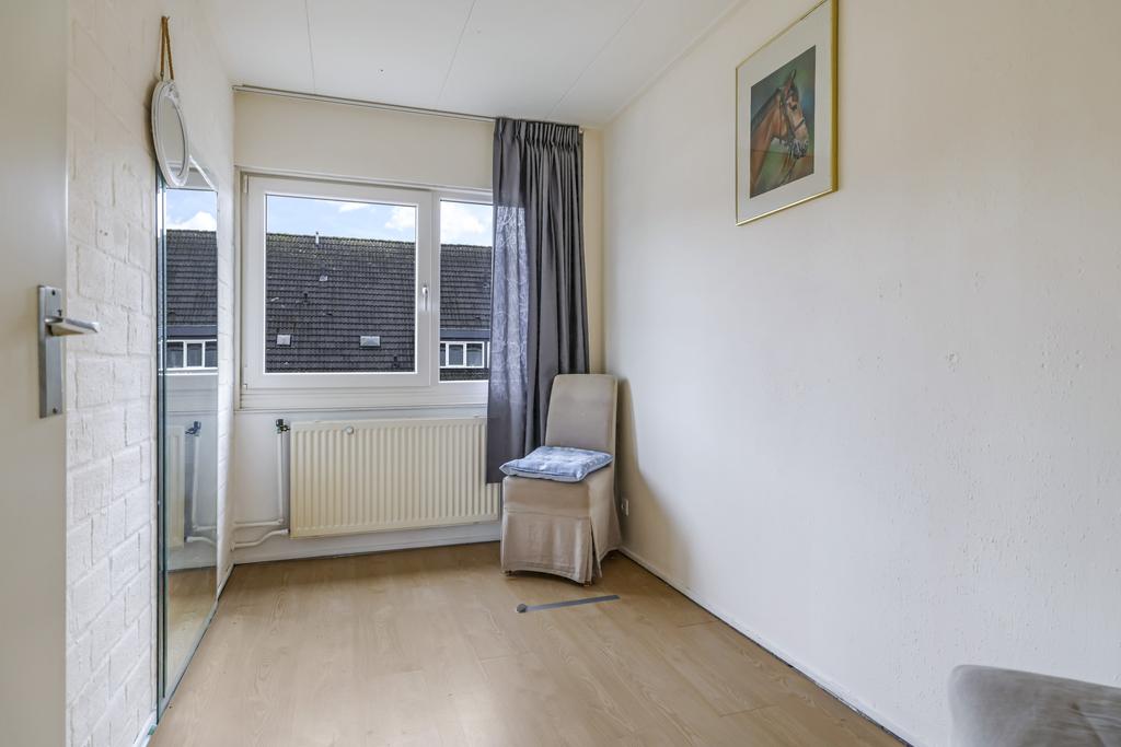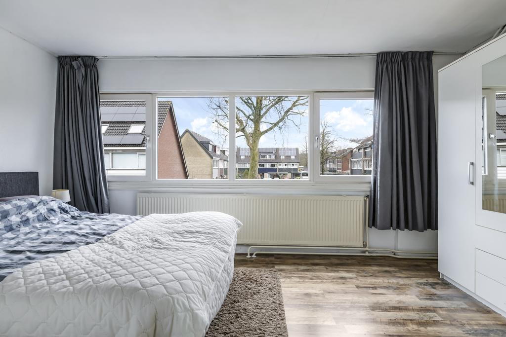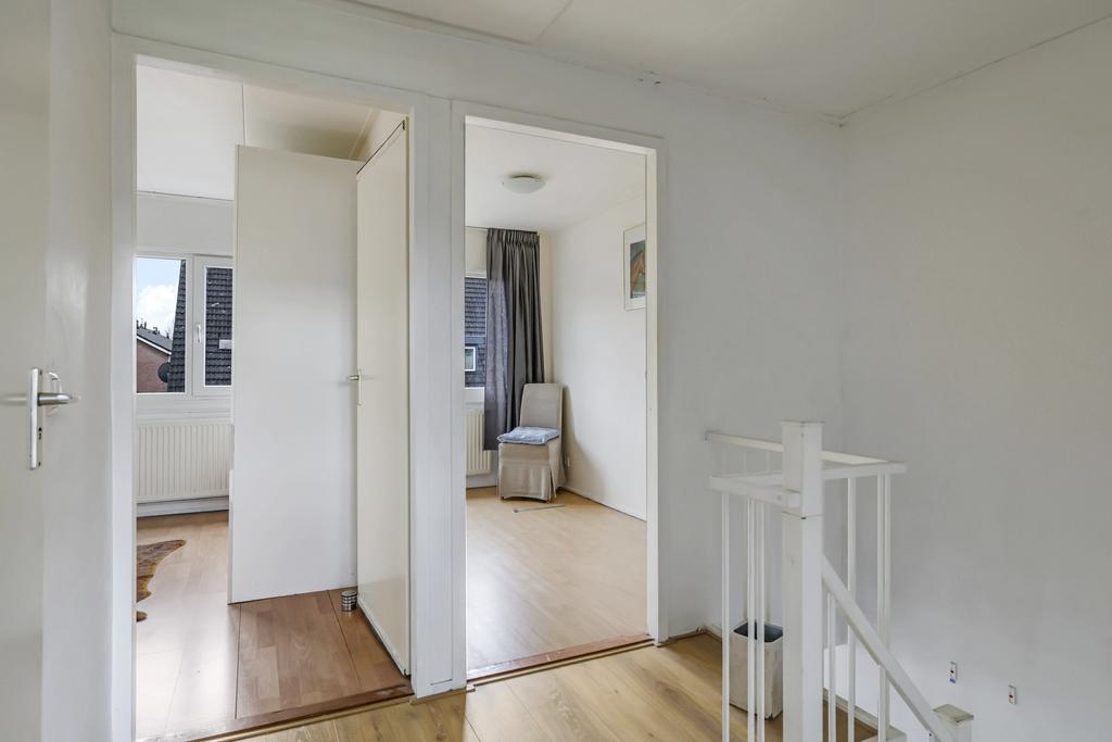 Via de vaste trap in de hal bereiken we de 1e verdieping. Hier bevinden zich de drie slaapkamers van respectievelijk 15m², 9m² en 6,4m². Doordat een slaapkamer over de gehele breedte van de woning is gelegen heeft deze een goed formaat waardoor dit al snel de hoofdslaapkamer zal worden. Alle kamers zijn voorzien van een keurige laminaatvloer en voldoende daglichttoetreding door middel van kunststof draai-/kiepramen.