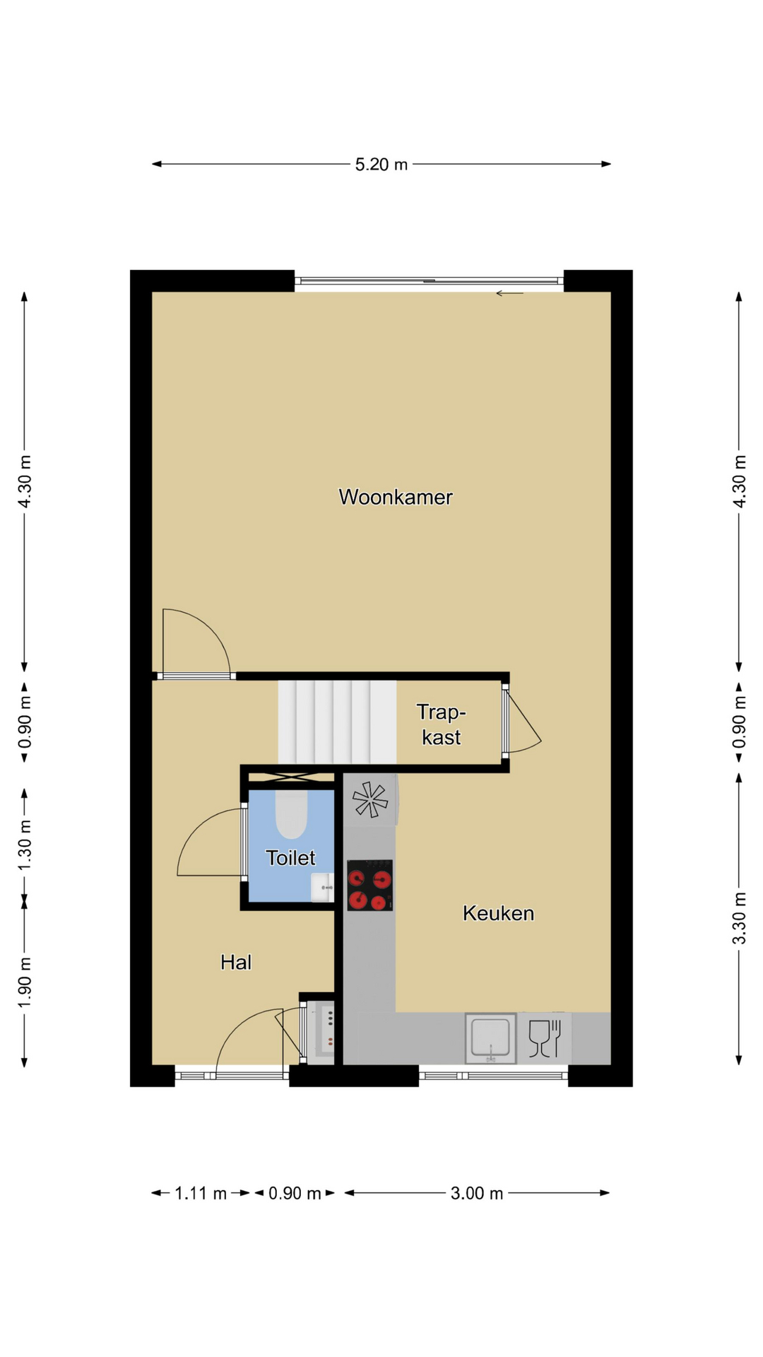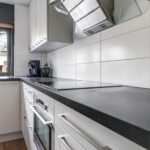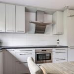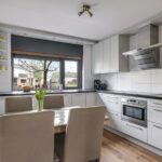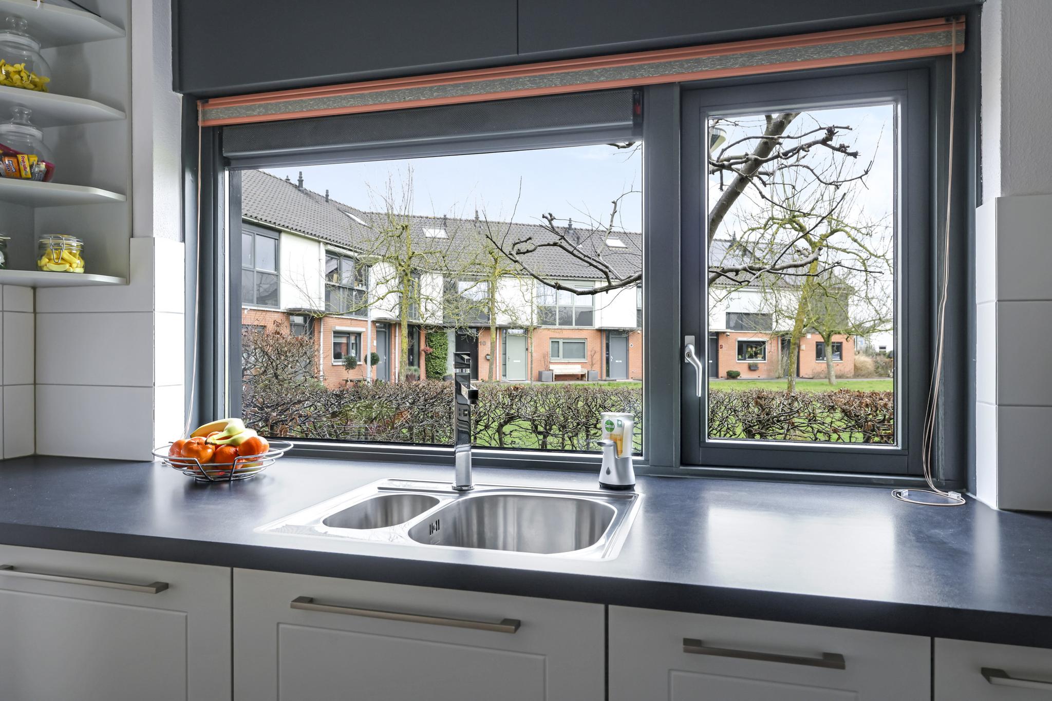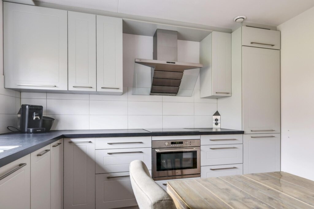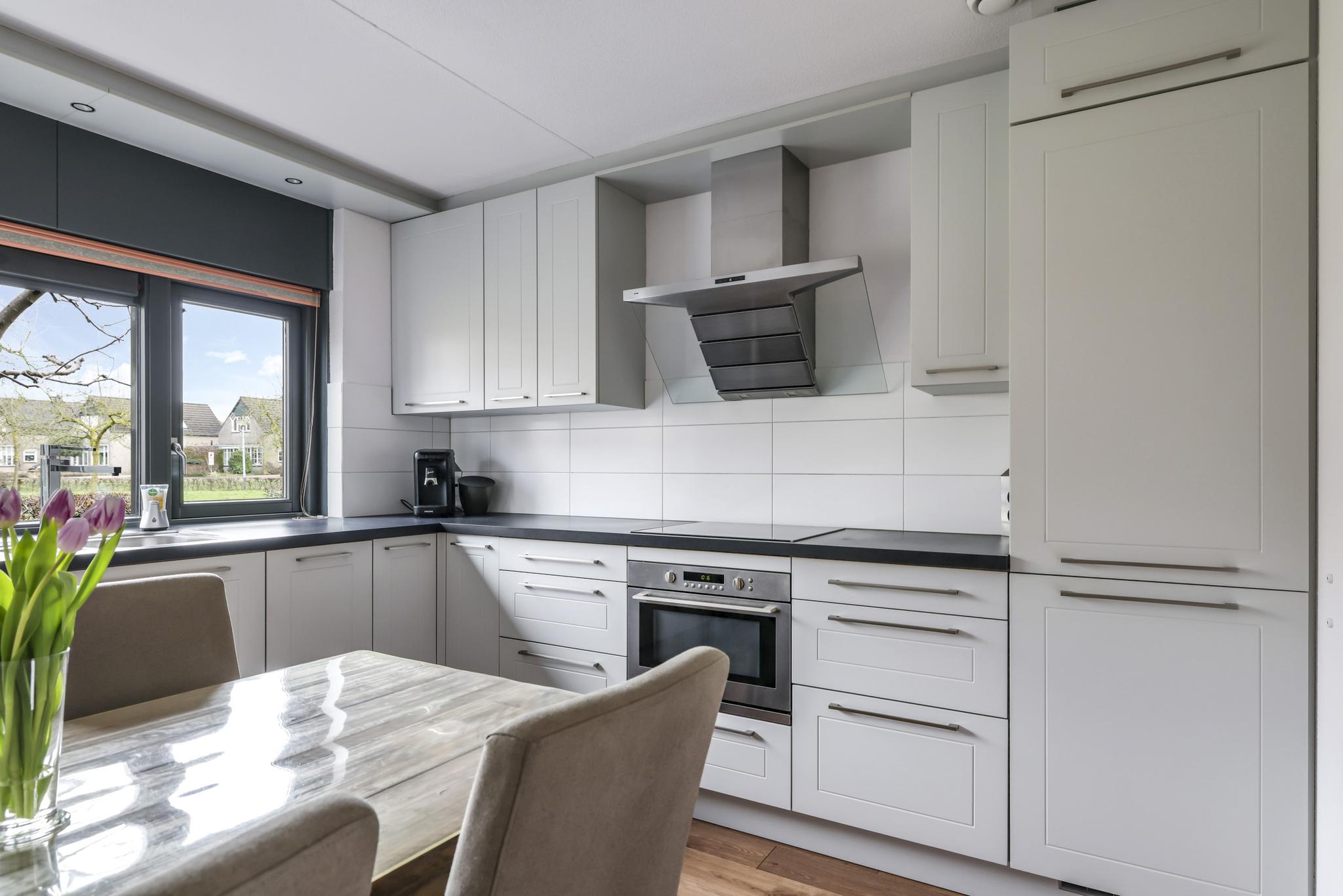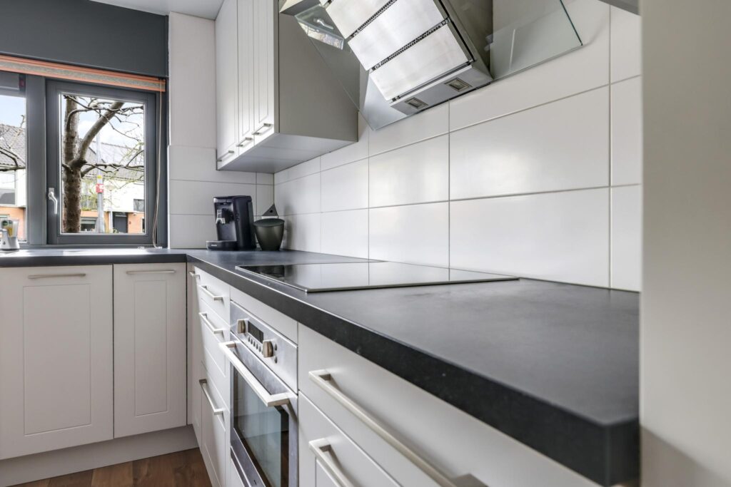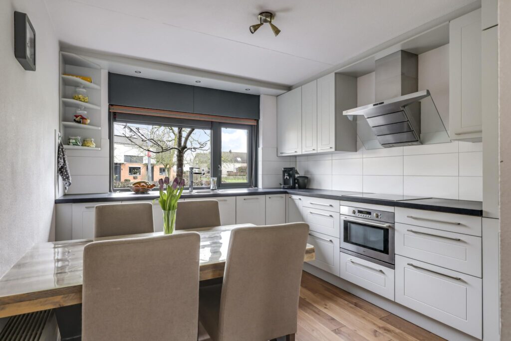 De keuken vinden we terug aan de voorzijde waarbij het een vrij uitzicht heeft op de groenvoorziening tegenover de woning. Er is gekozen voor een hoekopstelling waardoor de ruimte in de keuken maximaal wordt benut. Samen met de bovenkasten heb je hier tevens veel opbergruimte. Ook alle wenselijke inbouwapparatuur is aanwezig, waaronder een koelkast, een inductiekookplaat, een combioven, een afzuigkap en een vaatwasser. Erg praktisch is de trapkast welke direct naast de keuken gelegen is.