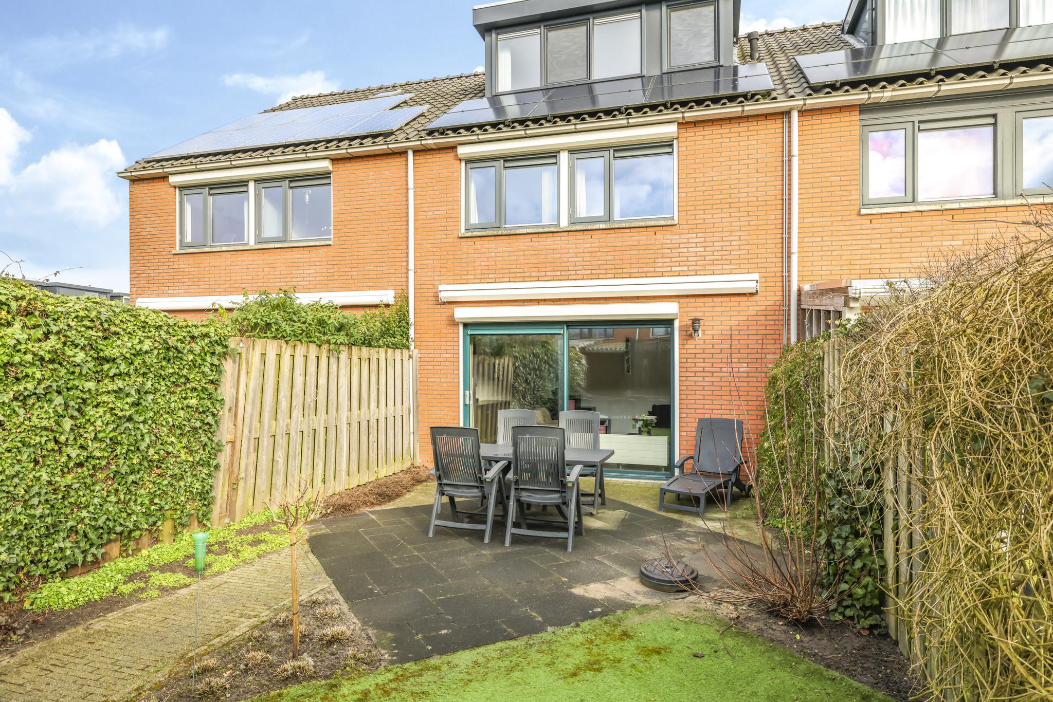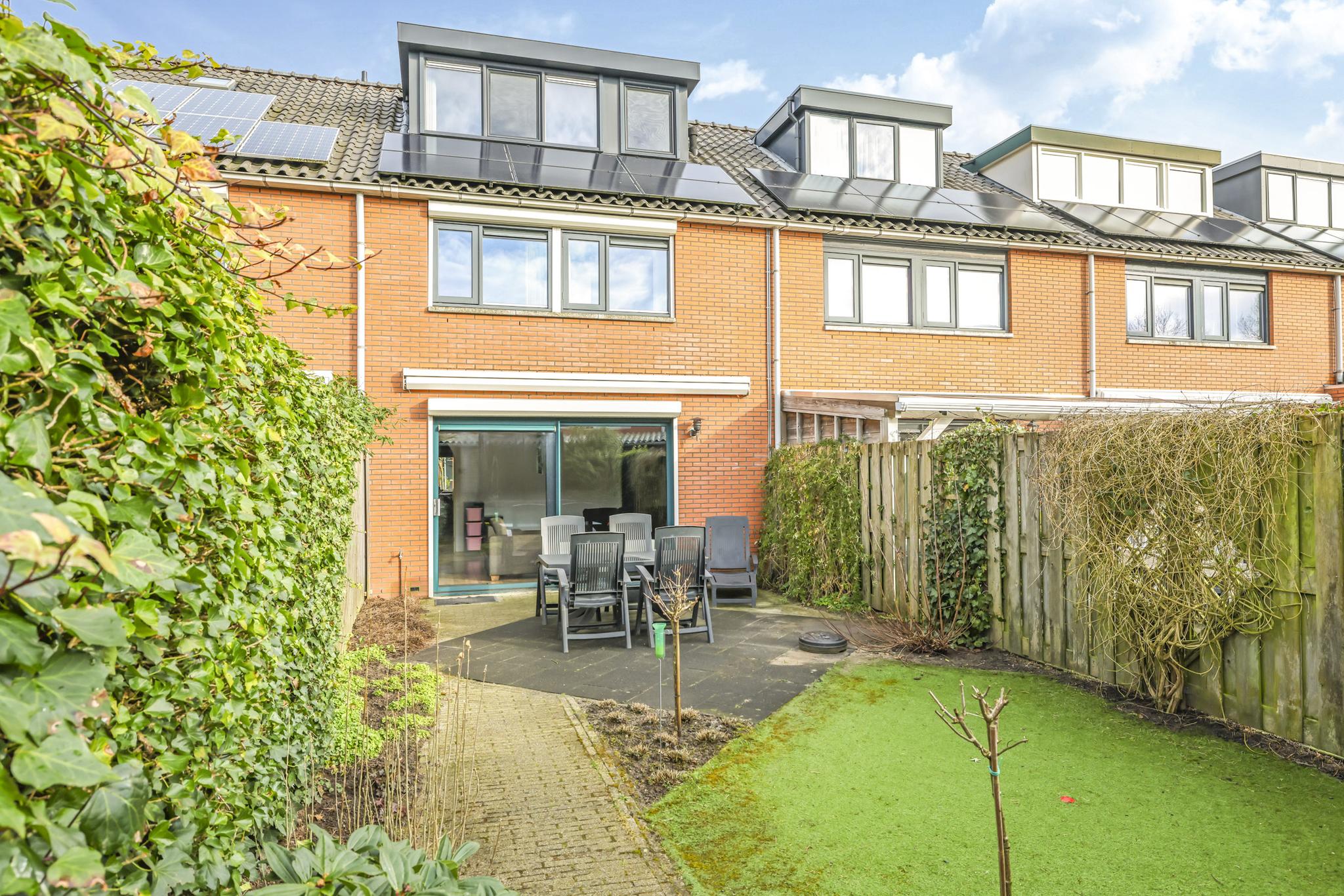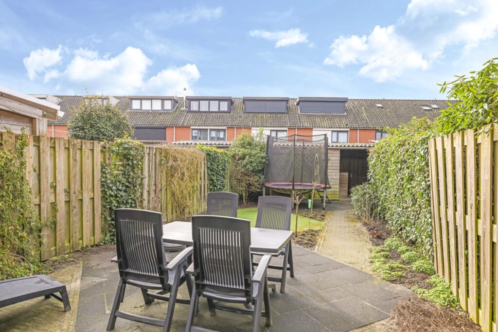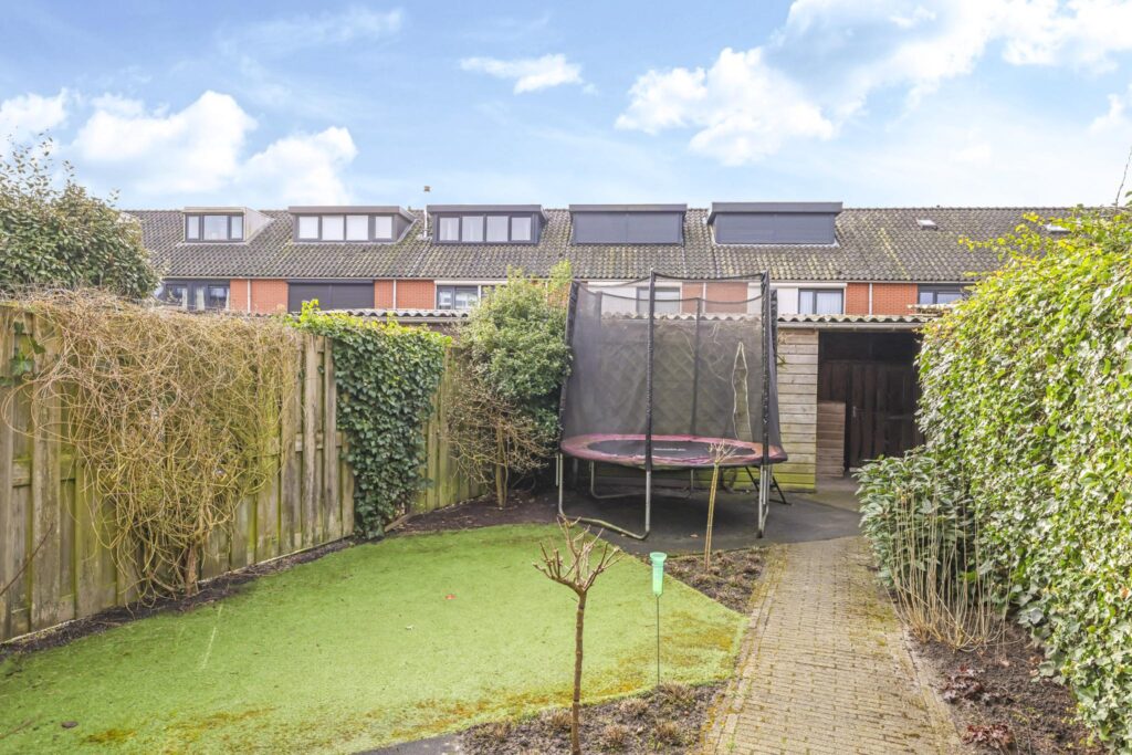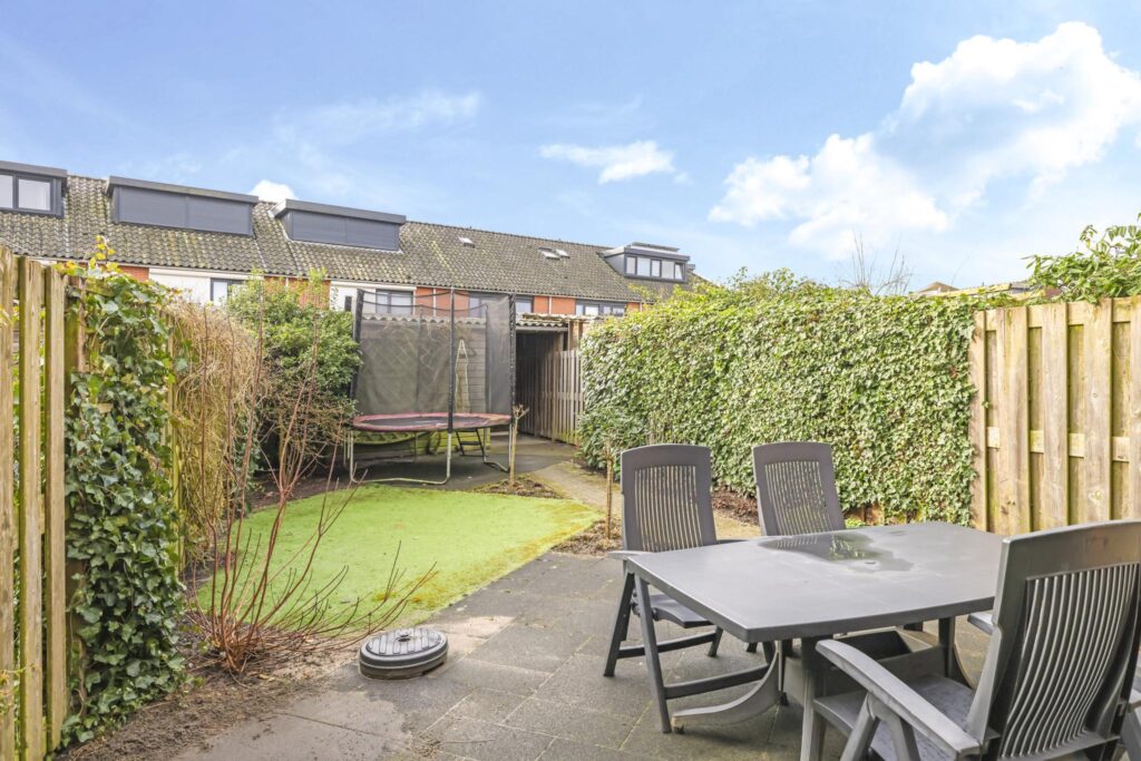 Met ca. 16 meter is deze achtertuin een stuk dieper dan van de meeste woningen in de wijk. De tuin is aangelegd met een combinatie van speels aangelegde terrassen en groenvoorzieningen. Achter in de tuin staat een opvallend grote schuur waar je meerdere fietsen kunt stallen. Naast de schuur is het dak doorgetrokken waardoor er een handige overkapping is ontstaan. Een poort geeft hier toegang tot het achtergelegen pad.