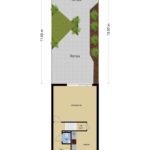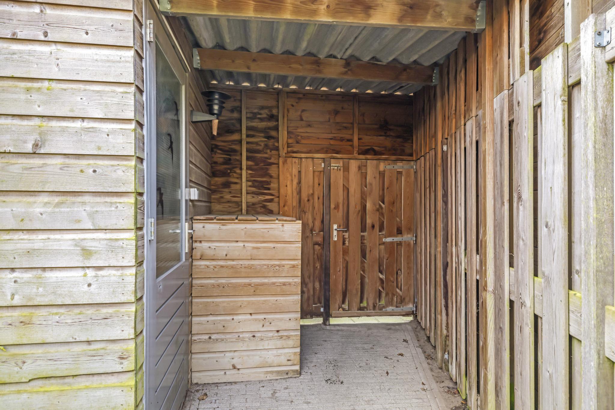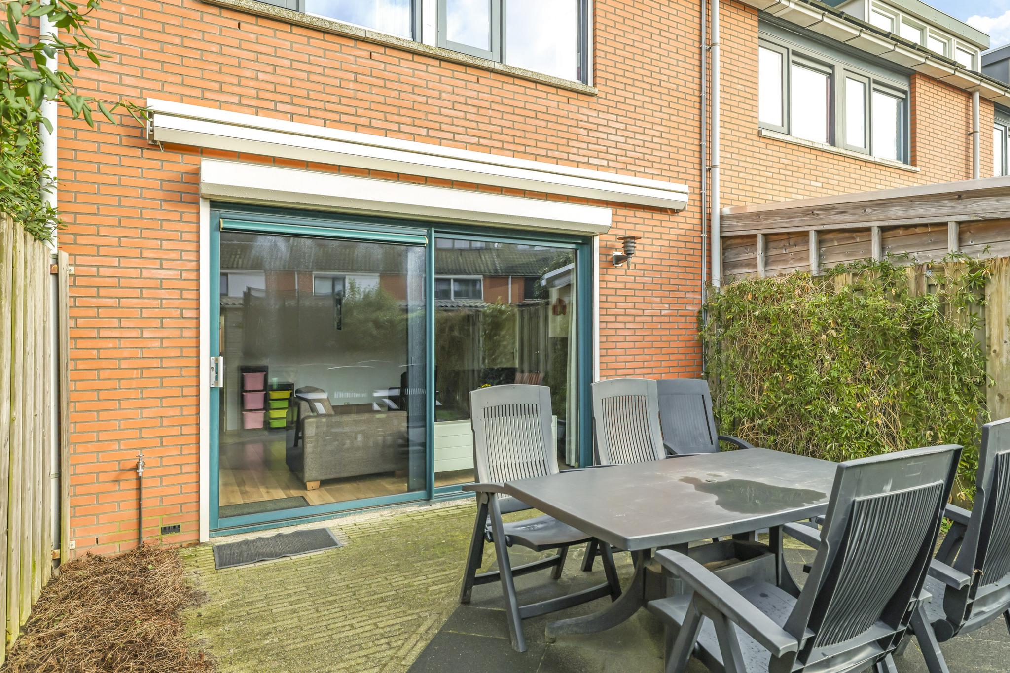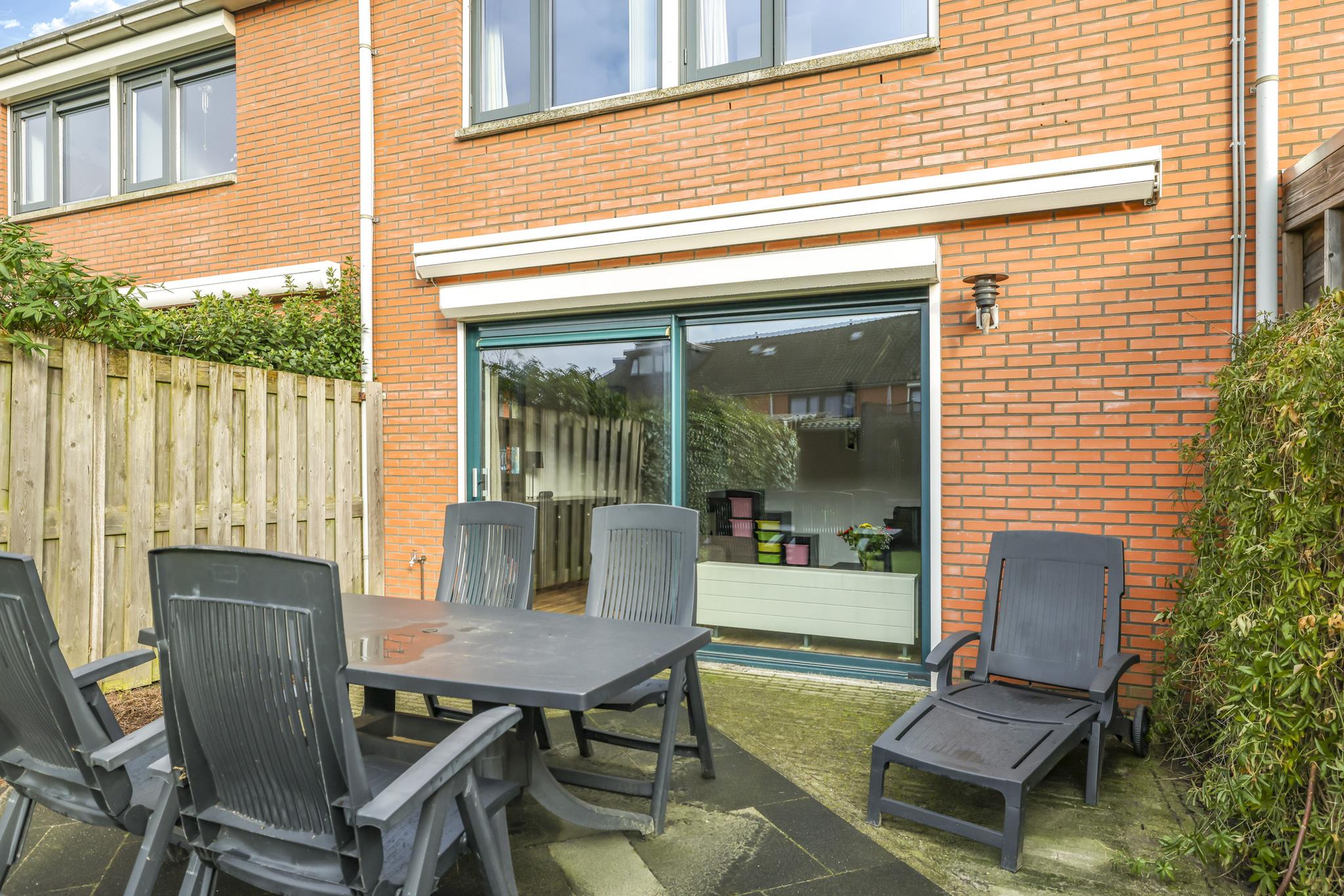 Met ca. 16 meter is deze achtertuin een stuk dieper dan van de meeste woningen in de wijk. De tuin is aangelegd met een combinatie van speels aangelegde terrassen en groenvoorzieningen. Achter in de tuin staat een opvallend grote schuur waar je meerdere fietsen kunt stallen. Naast de schuur is het dak doorgetrokken waardoor er een handige overkapping is ontstaan. Een poort geeft hier toegang tot het achtergelegen pad.