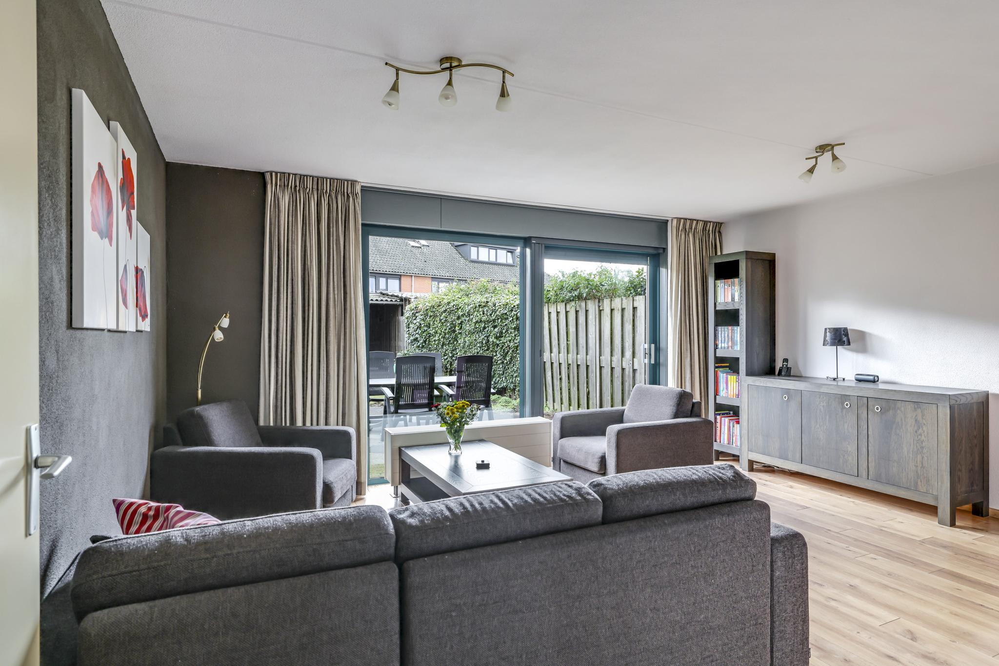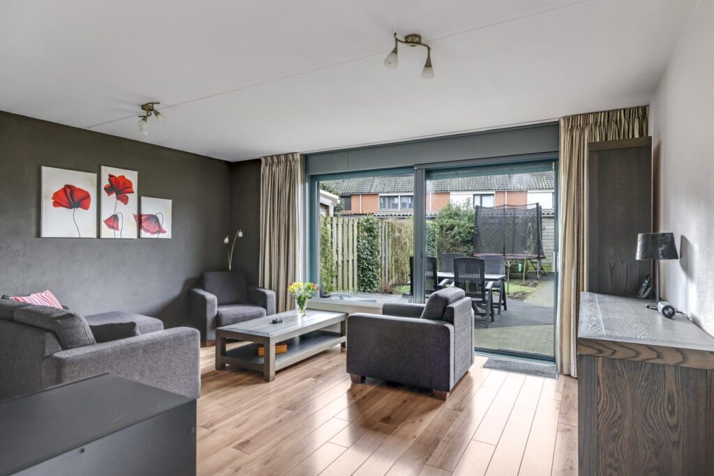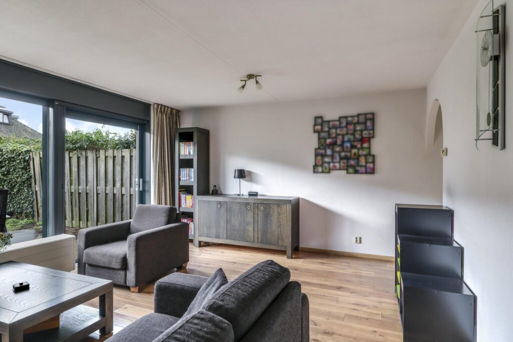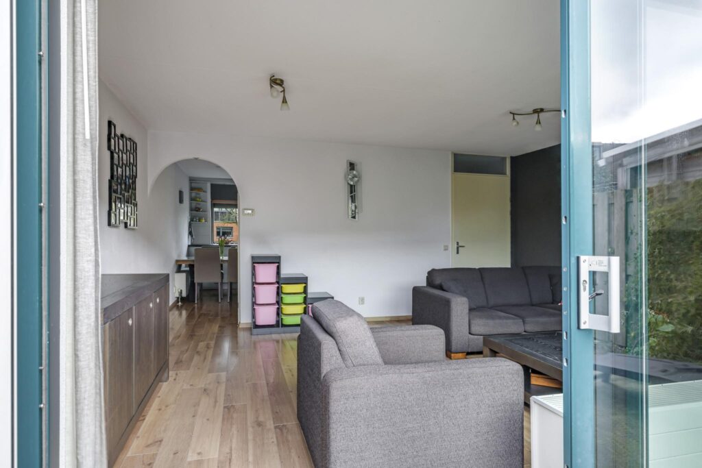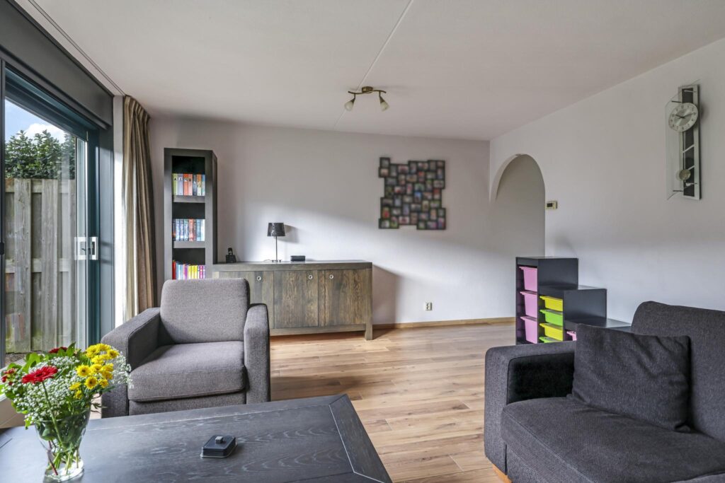 De woonkamer bevindt zicht aan de achterzijde van de woning en is daarmee tuingericht. Opvallend is het grote glasoppervlak tot aan de vloer (met brede schuifpui) in de achtergevel. Hierdoor komt er veel licht naar binnen, ook omdat het zuid-ligging heeft. Om in de zomer de warmte enigszins te kunnen weren, is er een uitvalscherm aanwezig welke elektrisch bedienbaar is. Mocht je de ruimte geheel af willen sluiten dan is er een eveneens elektrisch bedienbaar rolluik aanwezig.