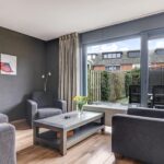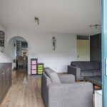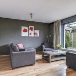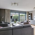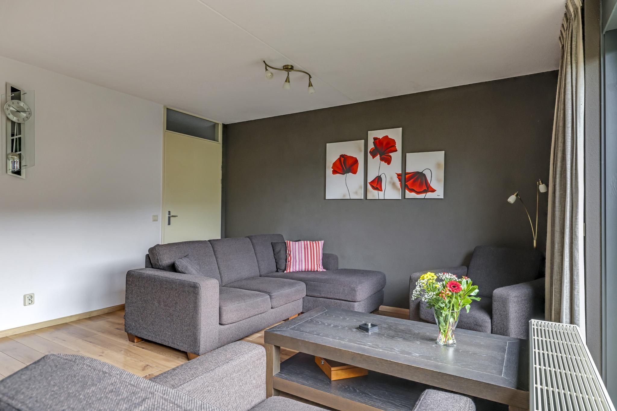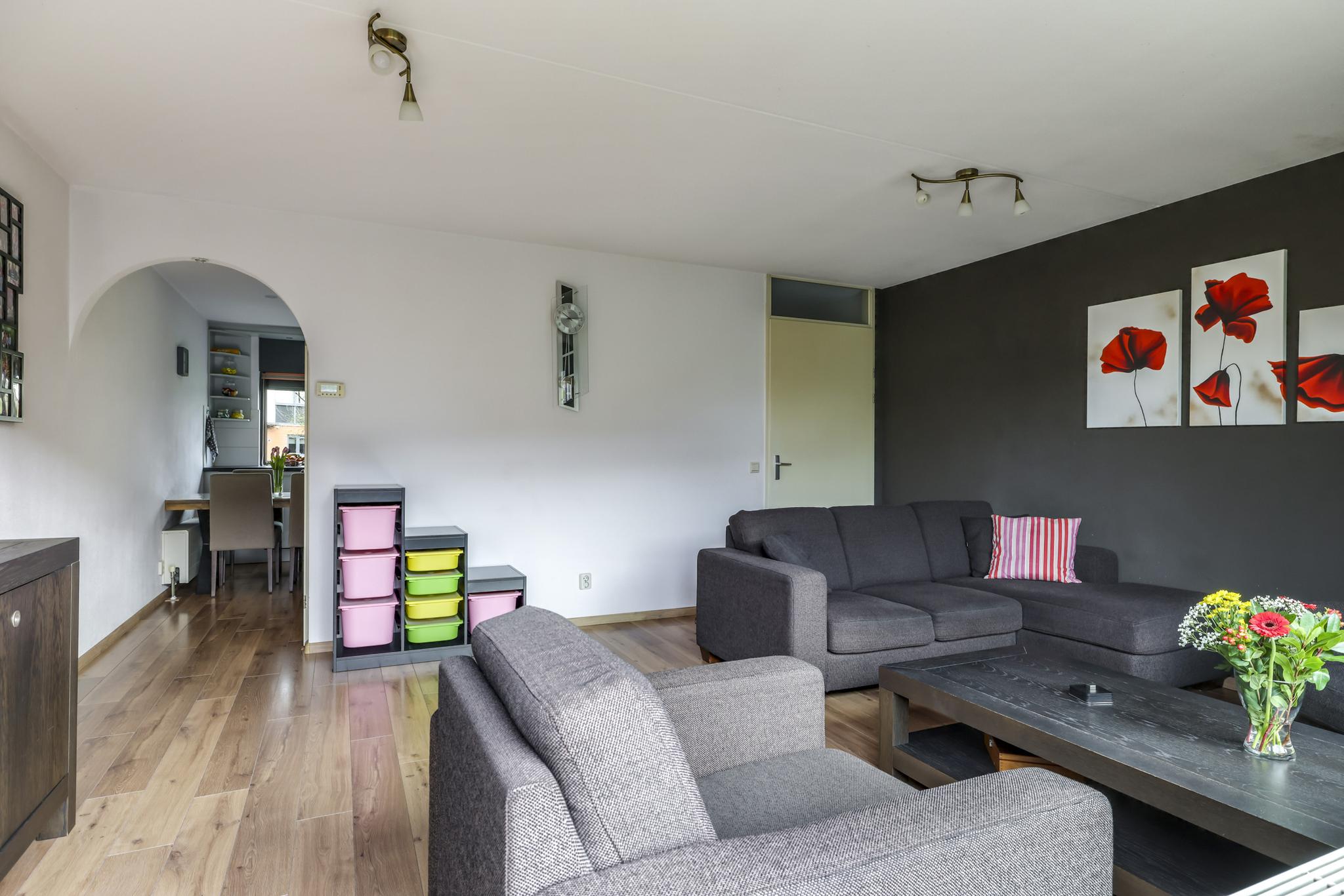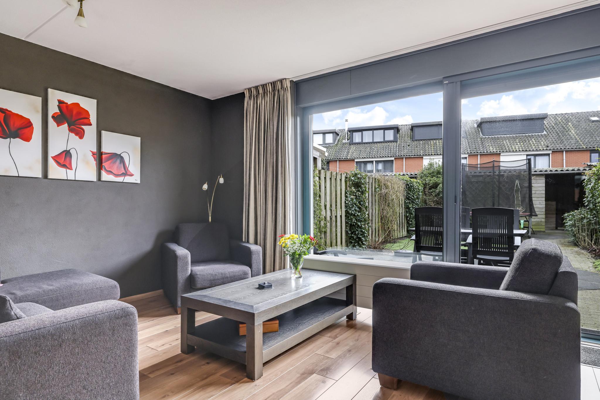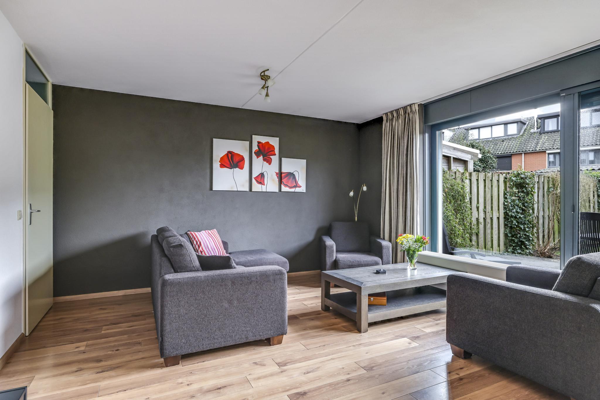 De woonkamer bevindt zicht aan de achterzijde van de woning en is daarmee tuingericht. Opvallend is het grote glasoppervlak tot aan de vloer (met brede schuifpui) in de achtergevel. Hierdoor komt er veel licht naar binnen, ook omdat het zuid-ligging heeft. Om in de zomer de warmte enigszins te kunnen weren, is er een uitvalscherm aanwezig welke elektrisch bedienbaar is. Mocht je de ruimte geheel af willen sluiten dan is er een eveneens elektrisch bedienbaar rolluik aanwezig.