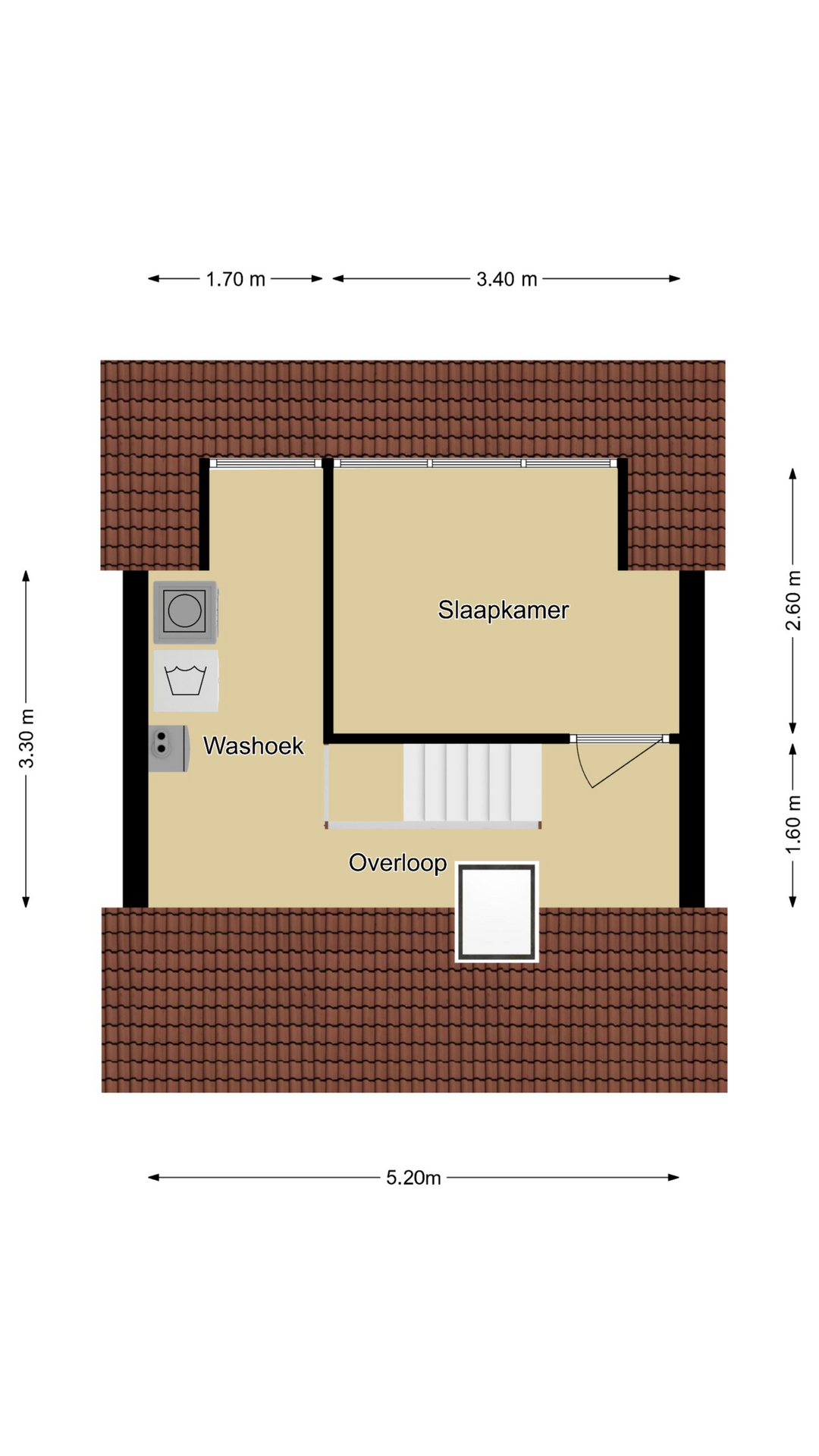 Ondanks dat het de bovenste verdieping is, is deze woonlaag opvallend netjes afgewerkt. De ruimte is aanzienlijk vergroot door de maximaal brede dakkapel (kunststof) voorzien van draai/kiepramen en inzethorren. De dakkapel is afsluitbaar middels een rolluik. Aan de voorzijde van de woning is een extra dakvenster geplaatst met rolhor en verduisteringsscherm.