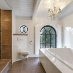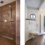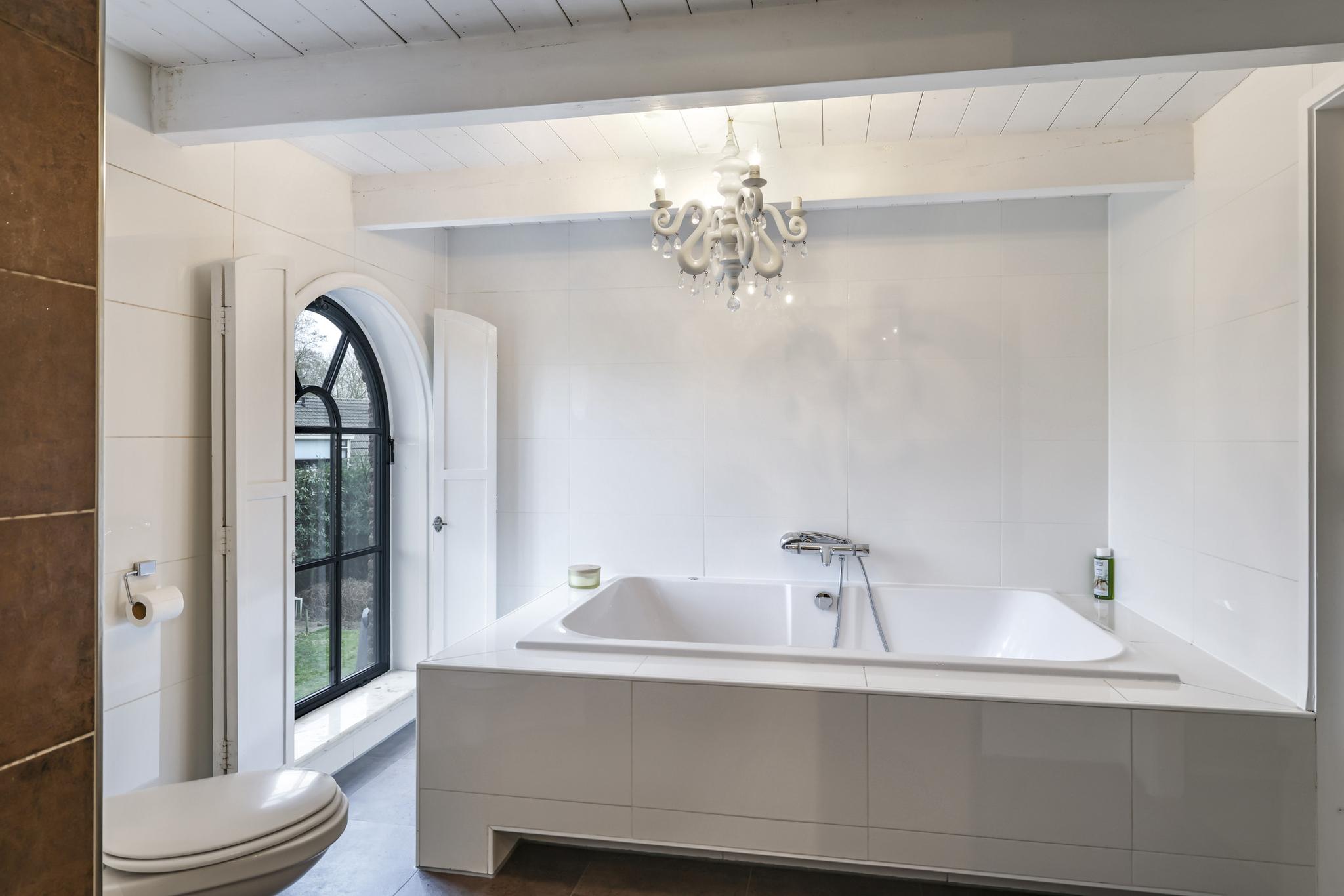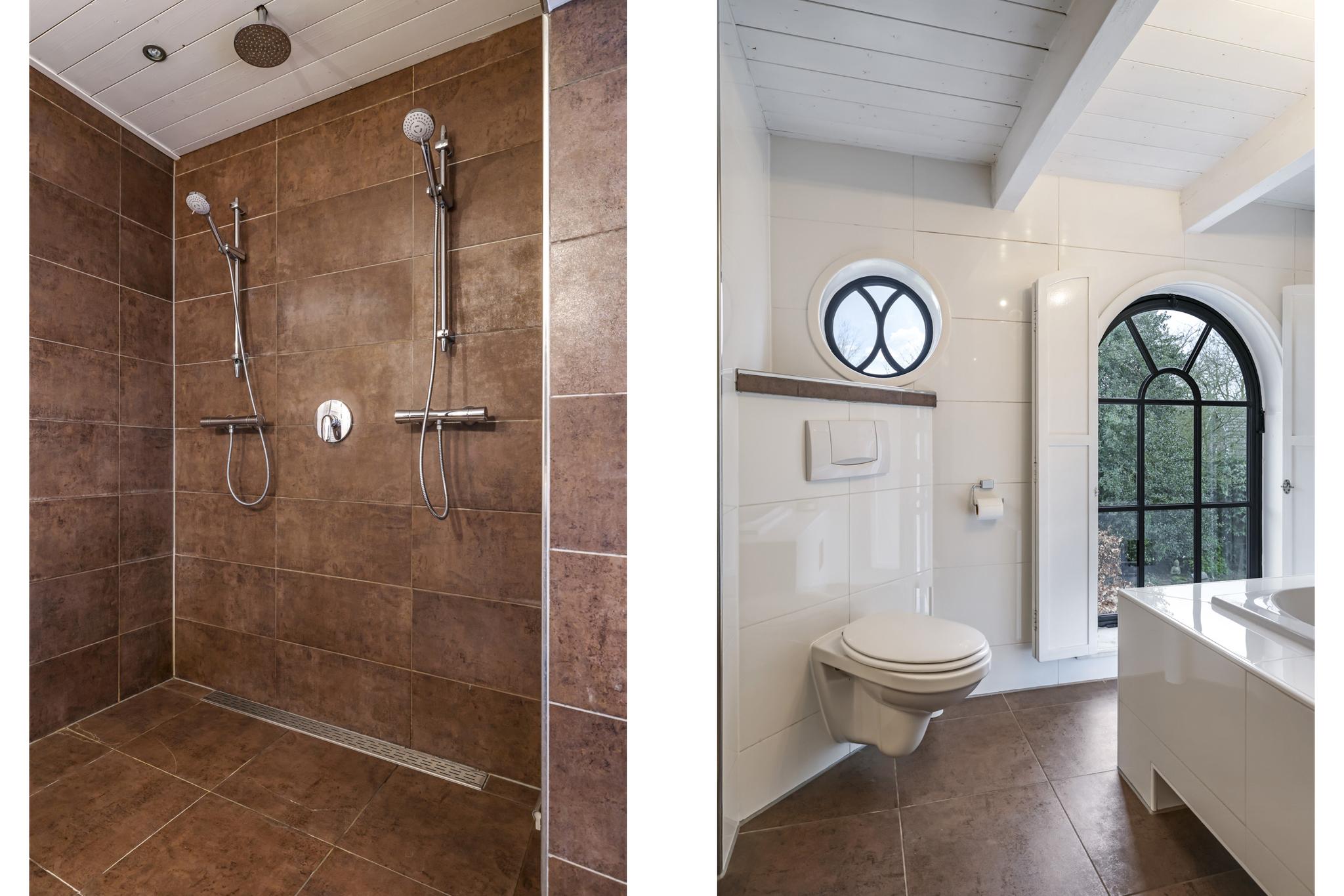 Tussen de slaapkamers in, is de badkamer gelegen. Het zal je niet verbazen dat ook deze ruimte goed bemeten is. Hierdoor kon er ‘out-of-the-box’ gedacht worden en kunnen we gerust stellen dat deze badkamer luxer is dan gemiddeld. Denk daarbij aan een dubbele douche met handdouches en een rainshower uit het plafond. Het whirlpool ligbad is zelfs zo groot dat je er met gemak met 2 personen in kunt liggen. En dat terwijl je door het nieuwe toograam vrij weg naar buiten kijkt. Aan de andere zijde is een breed 2-persoons wastafelmeubel met grote waskommen geplaatst. Een 2e wandcloset, een grote spiegelwand en een handdoekradiator maken deze badkamer compleet.