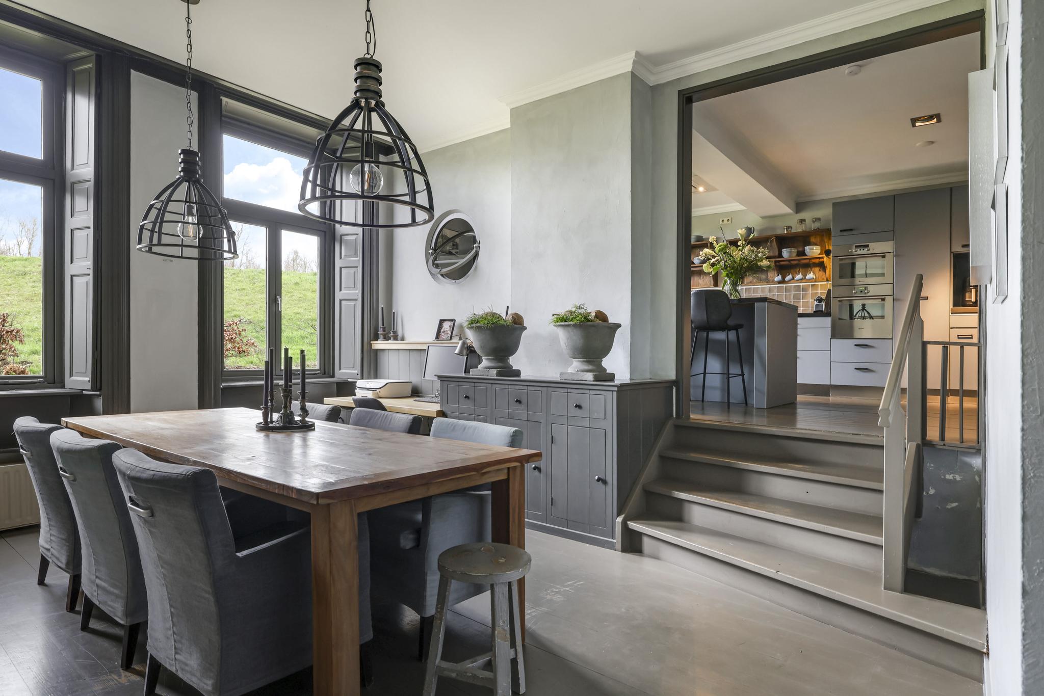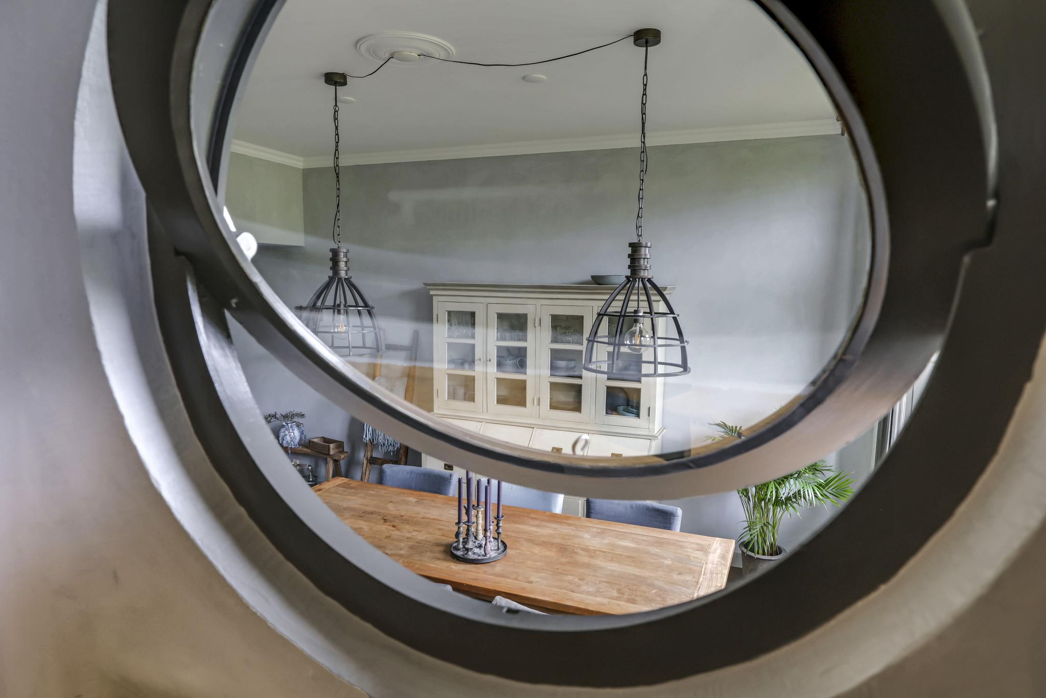 Grenzend aan de keuken is (weer enkele treden lager) een eetkamer gelegen. Dit is een op zichzelf staande ruimte met grote raampartijen met vrij zicht op de dijk. Hier kun je met gemak een 6- tot 8-persoons eettafel kwijt. Leuke details zijn de doorkijkjes van het ronde raam met de keuken en het raam naar de hal. En niet te vergeten de authentieke binnenluiken (ook in de keuken) waarbij in de eetkamer zelfs de sierlijke ‘zitvensterbanken’ nog behouden zijn gebleven. Meerdere grote inbouwkasten bieden je meer dan voldoende opbergmogelijkheden voor een uitgebreid servies.