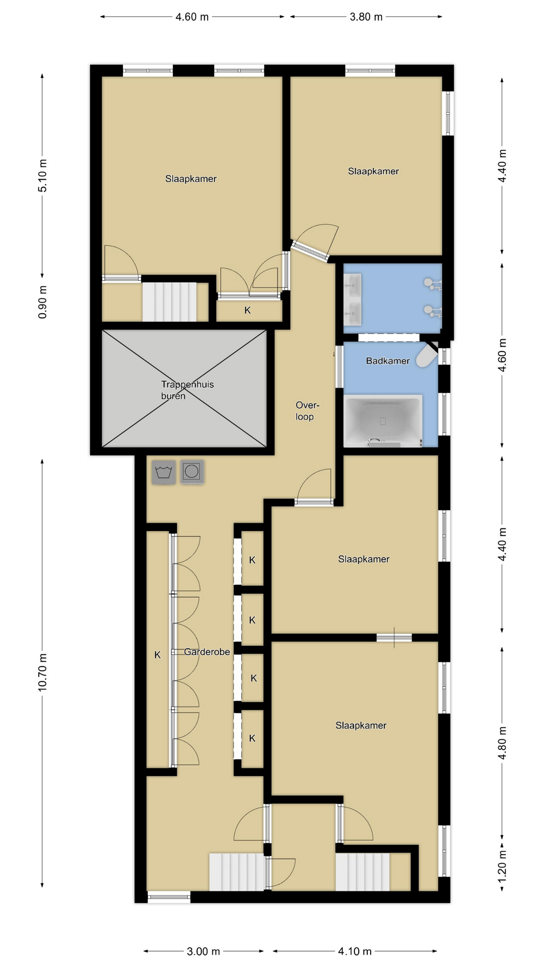 Een ruimte die we zeker niet mogen vergeten is het verlengde van de overloop. Het voelt bijna als een aparte kamer omdat het zelfs groter is dan de ouderslaapkamer. Zie het als een walk-in-closet aangezien er aan weerszijden vaste inbouwkasten zijn gemaakt. Het biedt zelfs zoveel ruimte dat de volledige garderobe van een geheel gezin hierin zou passen. Hoe comfortabel is het dat je hier ook de wasmanden kunt zetten en de wasjes kunt draaien. Hier vinden we namelijk ook de wasmachine- en wasdrogeraansluitingen terug.