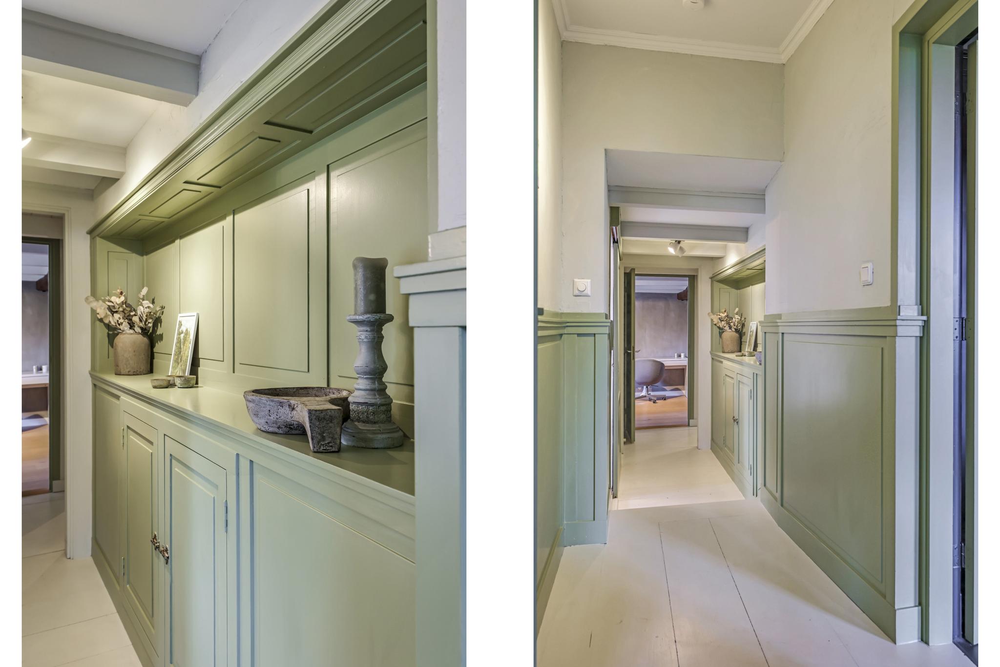 Er is goed nagedacht over de aankleding en styling hetgeen naadloos op elkaar is afgestemd. Mooie voorbeelden hiervan zijn de wandafwerking in verschillende kalkverftinten, de prachtige houten vloer in de living, de stijlvol en breed ingestucte gashaard alsmede de romantische toogramen met raamverdeling die je in verschillende leefruimtes tegen komt.
