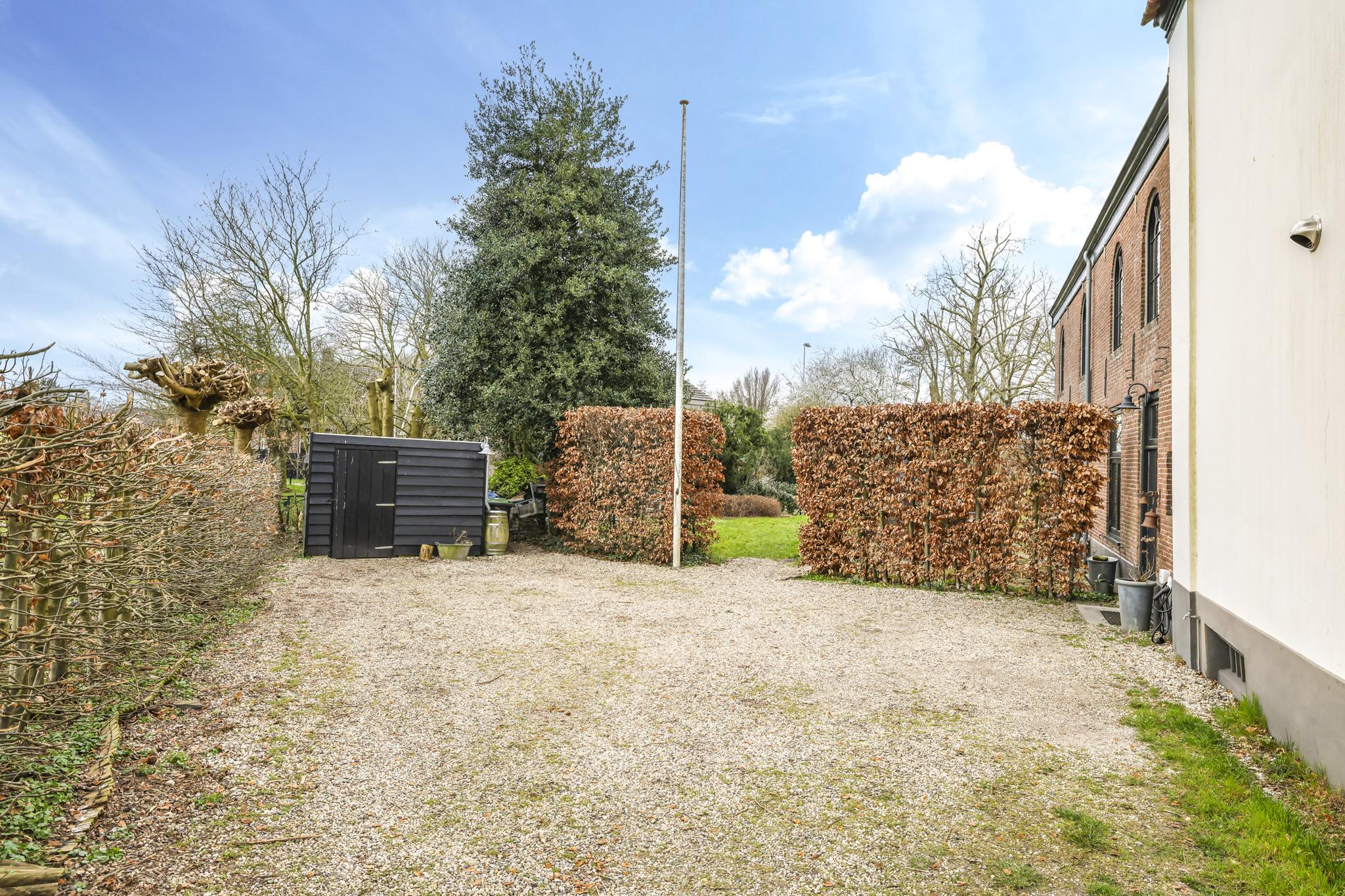 Deze woning staat ook in het teken van het buitenleven. Het begint eigenlijk al wanneer je vanaf het dijkvlak naar beneden loopt of met de auto tussen de hagen het onverharde pad naar de woning oprijdt. Een monumentale boom (een Libanese ceder) heet je van harte welkom en geeft het gevoel dat je op het Franse platteland bent. De parkeerplaats biedt vervolgens plek aan meerdere auto’s op eigen terrein. Tevens staat hier een houten schuur waar je bijvoorbeeld (elektrische) fietsen kunt stallen.