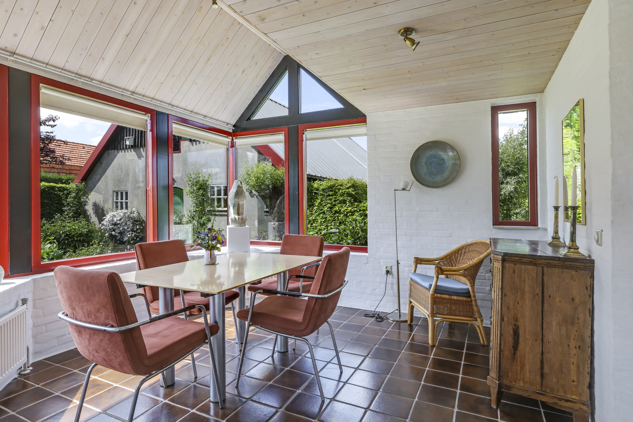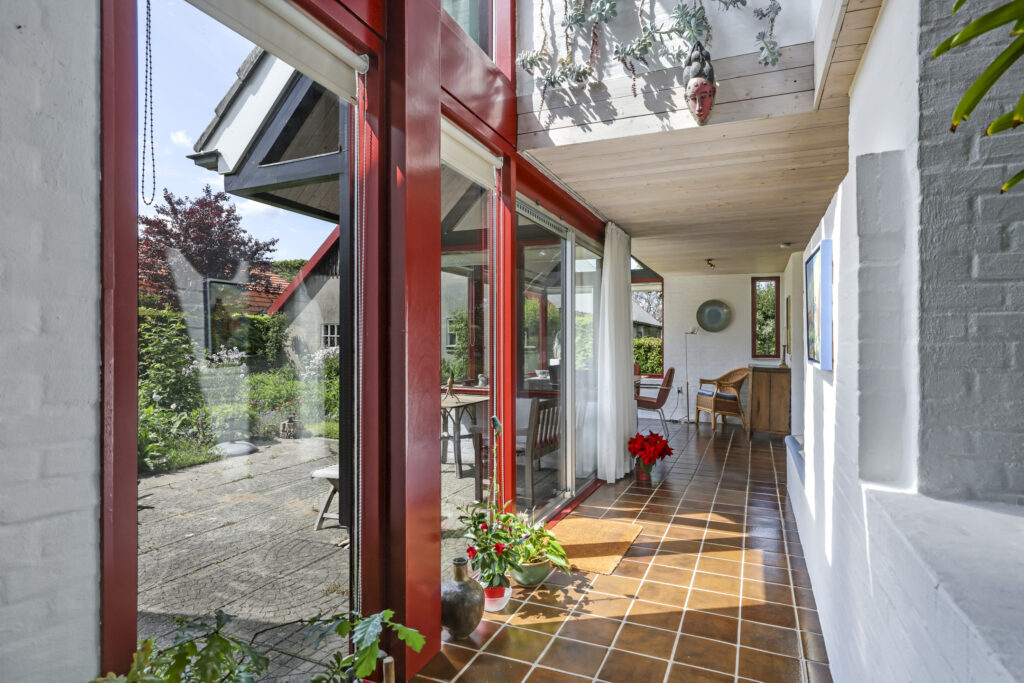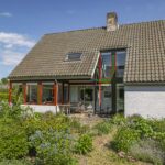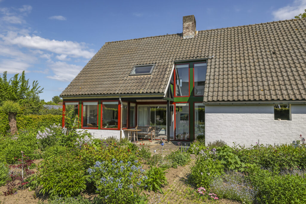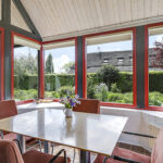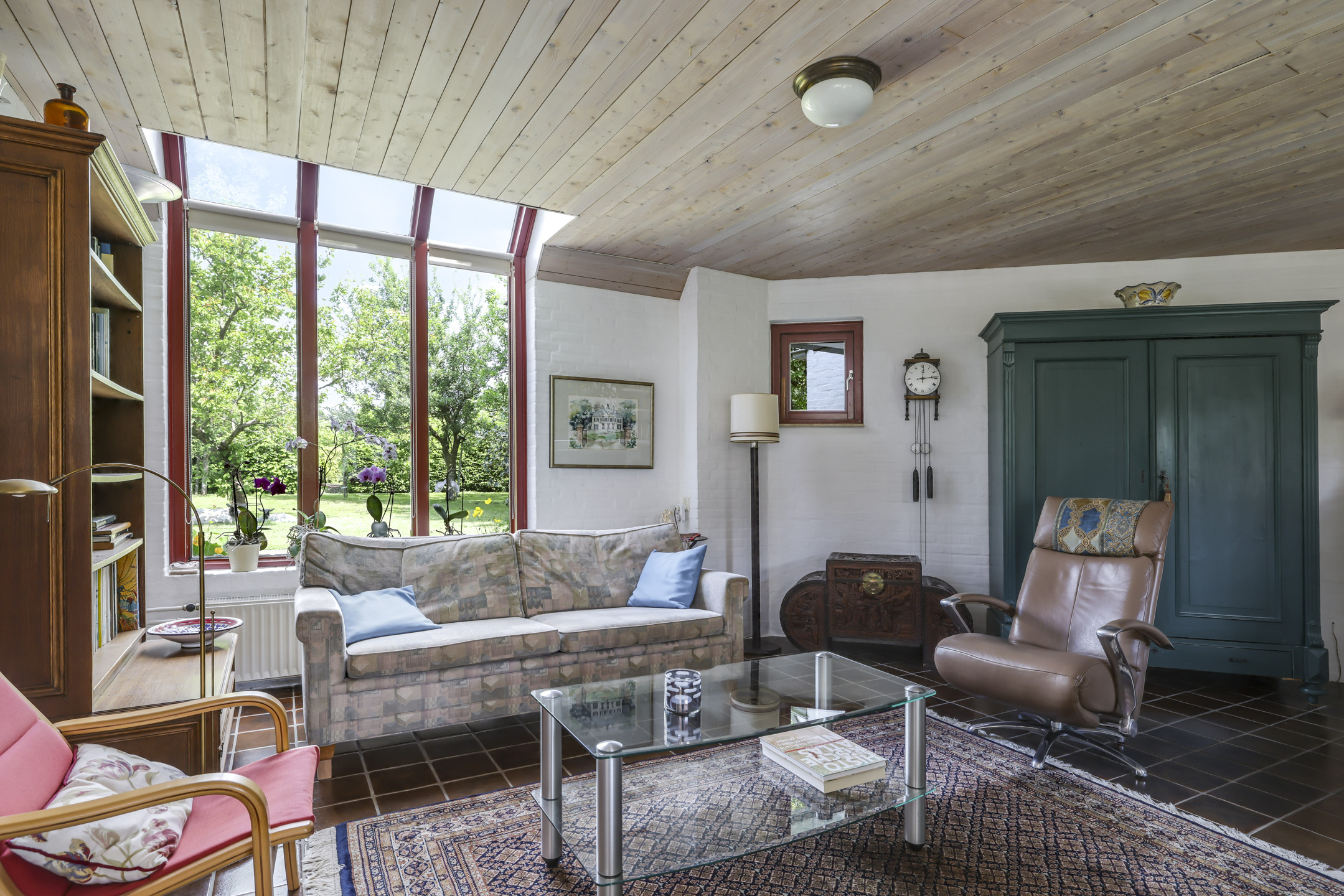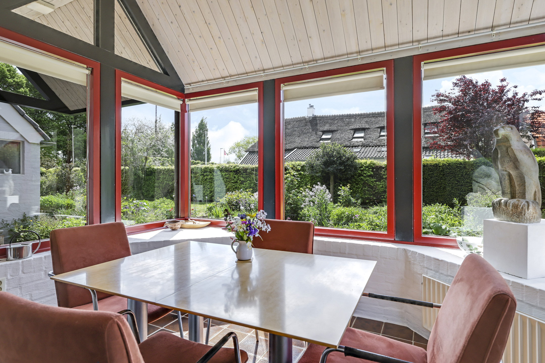 Een andere zithoek is de ‘serre’ waarbij 3 zijden uit glas bestaat. Het vele glasoppervlak zorgt hier voor veel lichtinval waarbij de zon gedurende de dag tot zonsondergang naar binnen schijnt. Ook zit je hier voor je gevoel al bijna in de tuin terwijl je aan de achterzijde een landelijk uitzicht hebt. Speels detail is de hoge nok hetgeen we ook in de hal/entree al hadden gezien. Dit geeft deze zithoek een bijzonder ruimtelijk gevoel. En omdat deze ruimte aan de keuken grenst, is het de ideale ruimte voor een eettafel. Een schuifpui biedt direct toegang tot het (deels) overdekte buitenterras.