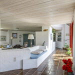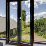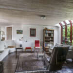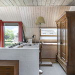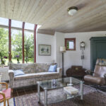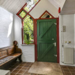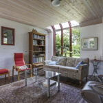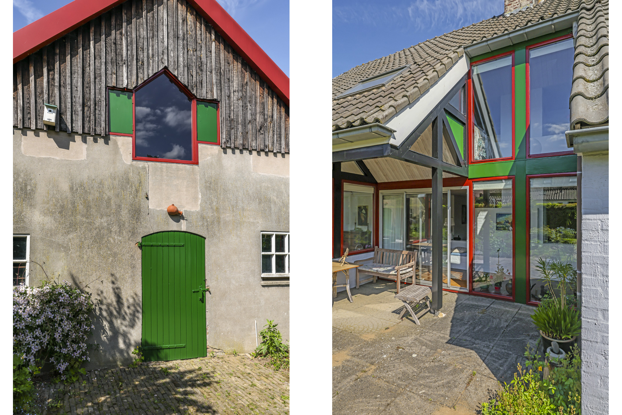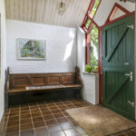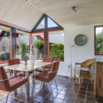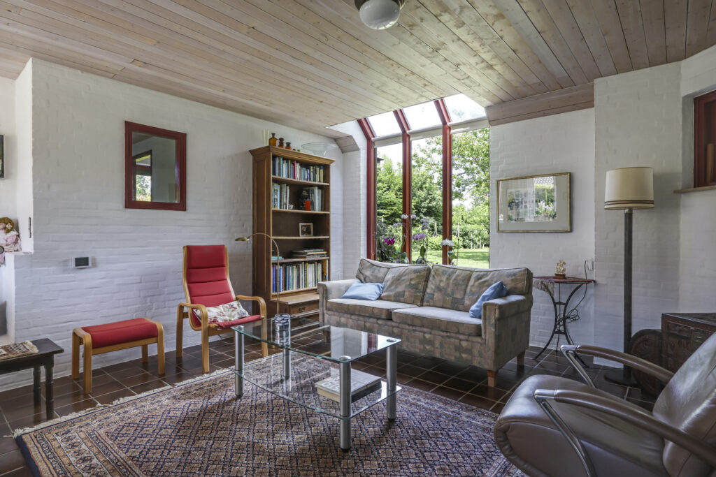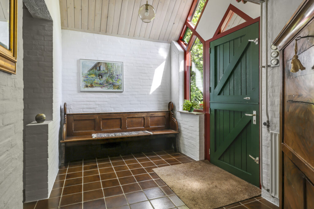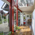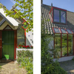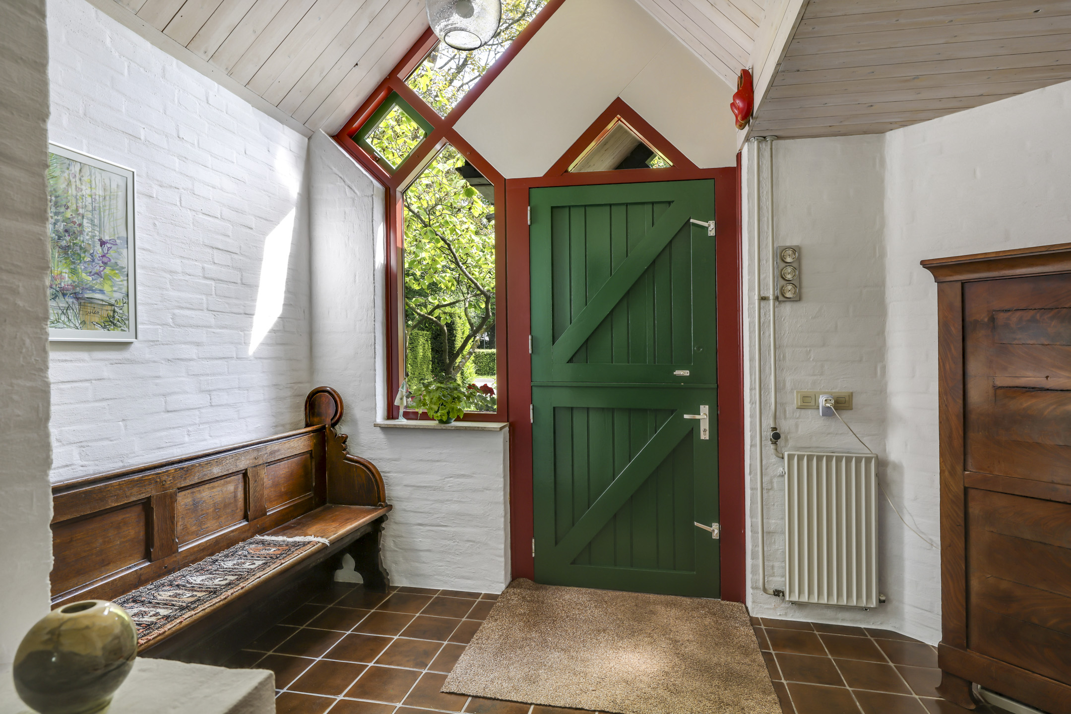 Een andere zithoek is de ‘serre’ waarbij 3 zijden uit glas bestaat. Het vele glasoppervlak zorgt hier voor veel lichtinval waarbij de zon gedurende de dag tot zonsondergang naar binnen schijnt. Ook zit je hier voor je gevoel al bijna in de tuin terwijl je aan de achterzijde een landelijk uitzicht hebt. Speels detail is de hoge nok hetgeen we ook in de hal/entree al hadden gezien. Dit geeft deze zithoek een bijzonder ruimtelijk gevoel. En omdat deze ruimte aan de keuken grenst, is het de ideale ruimte voor een eettafel. Een schuifpui biedt direct toegang tot het (deels) overdekte buitenterras.