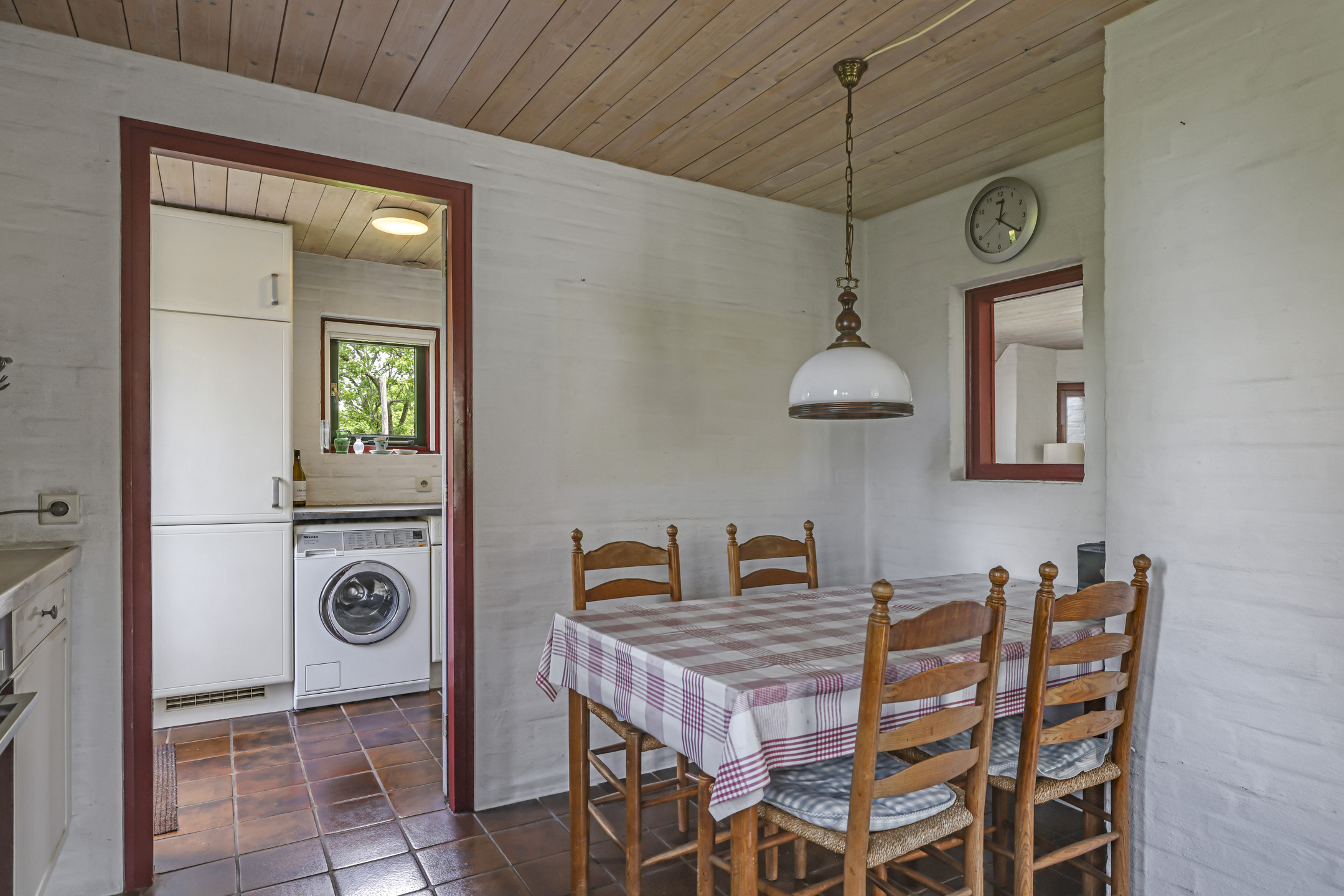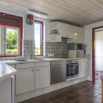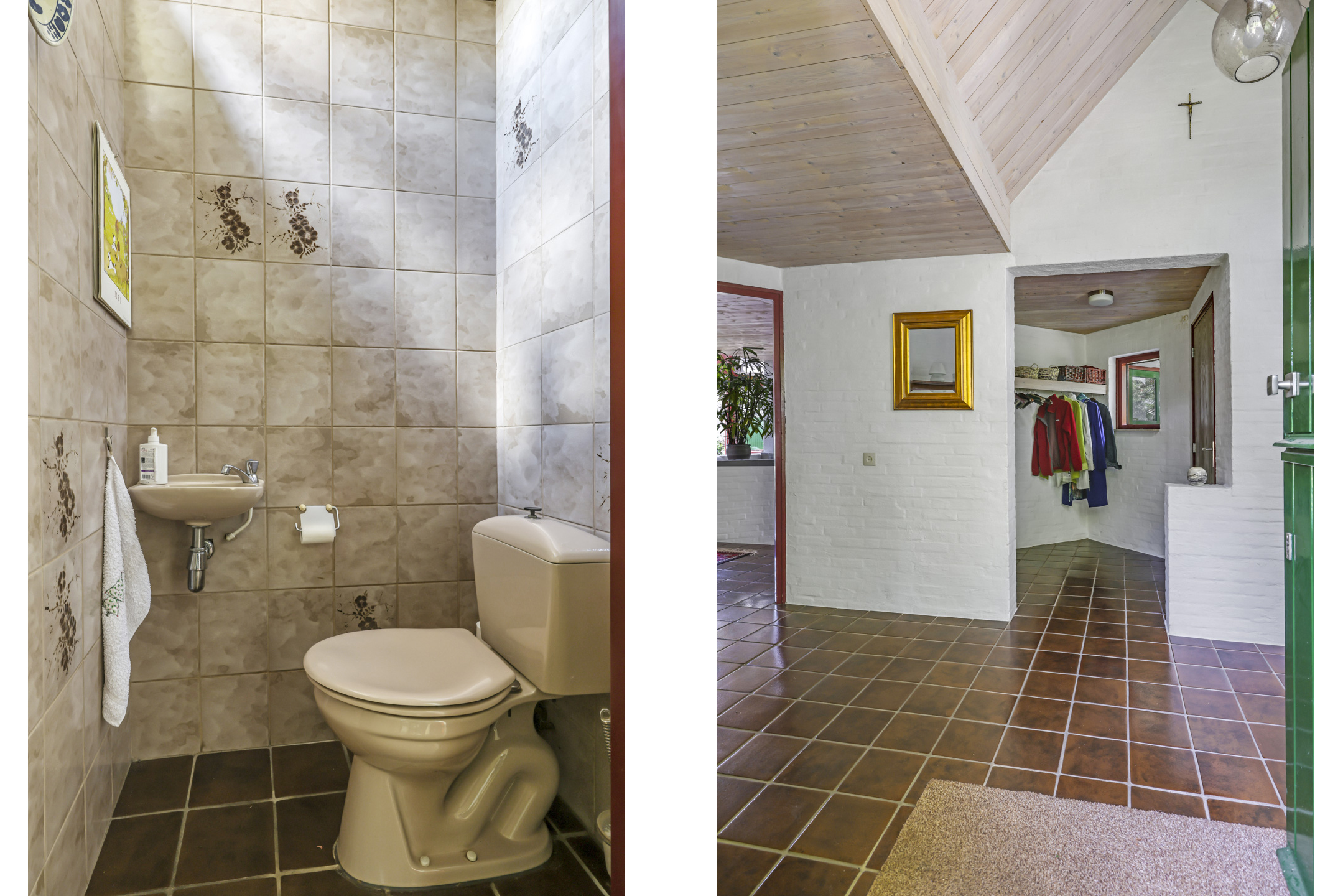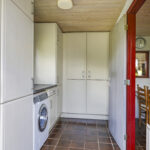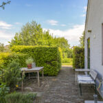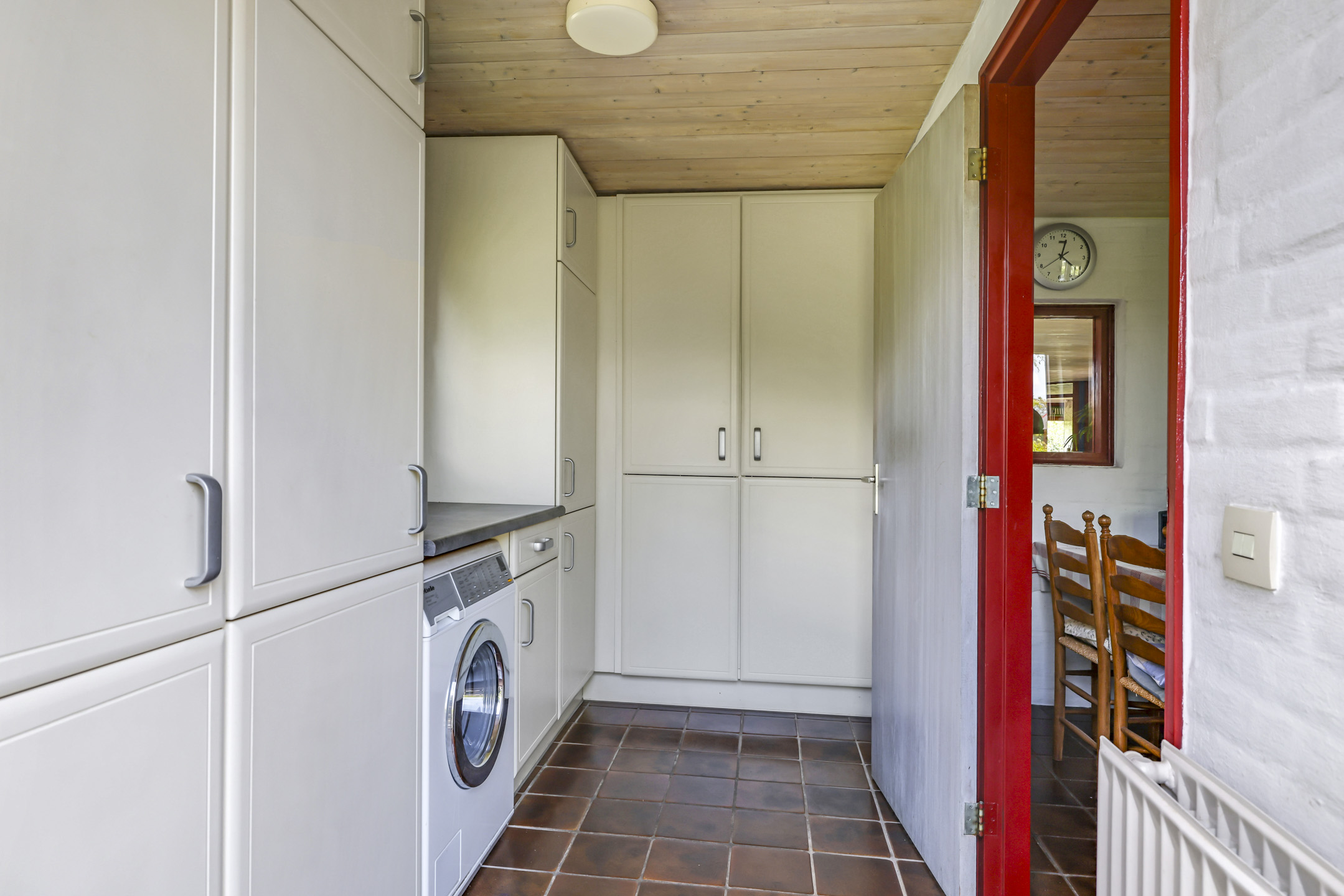 Direct naast de keuken vinden we de bijkeuken. Dit is met name een praktische ruimte waar je een 2e keukenopstelling vindt. Hier is veel ruimte voor het opbergen van bijvoorbeeld keukenmachines en voorraad. Tevens is hier een vriezer met 6 lades ingebouwd en kun je hier de wasmachine plaatsen. De aanwezige tuindeur is dan ook ideaal voor wanneer je de was buiten wil laten drogen. Bovendien is ook aan deze zijde van de woning een knus terras aangelegd.