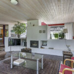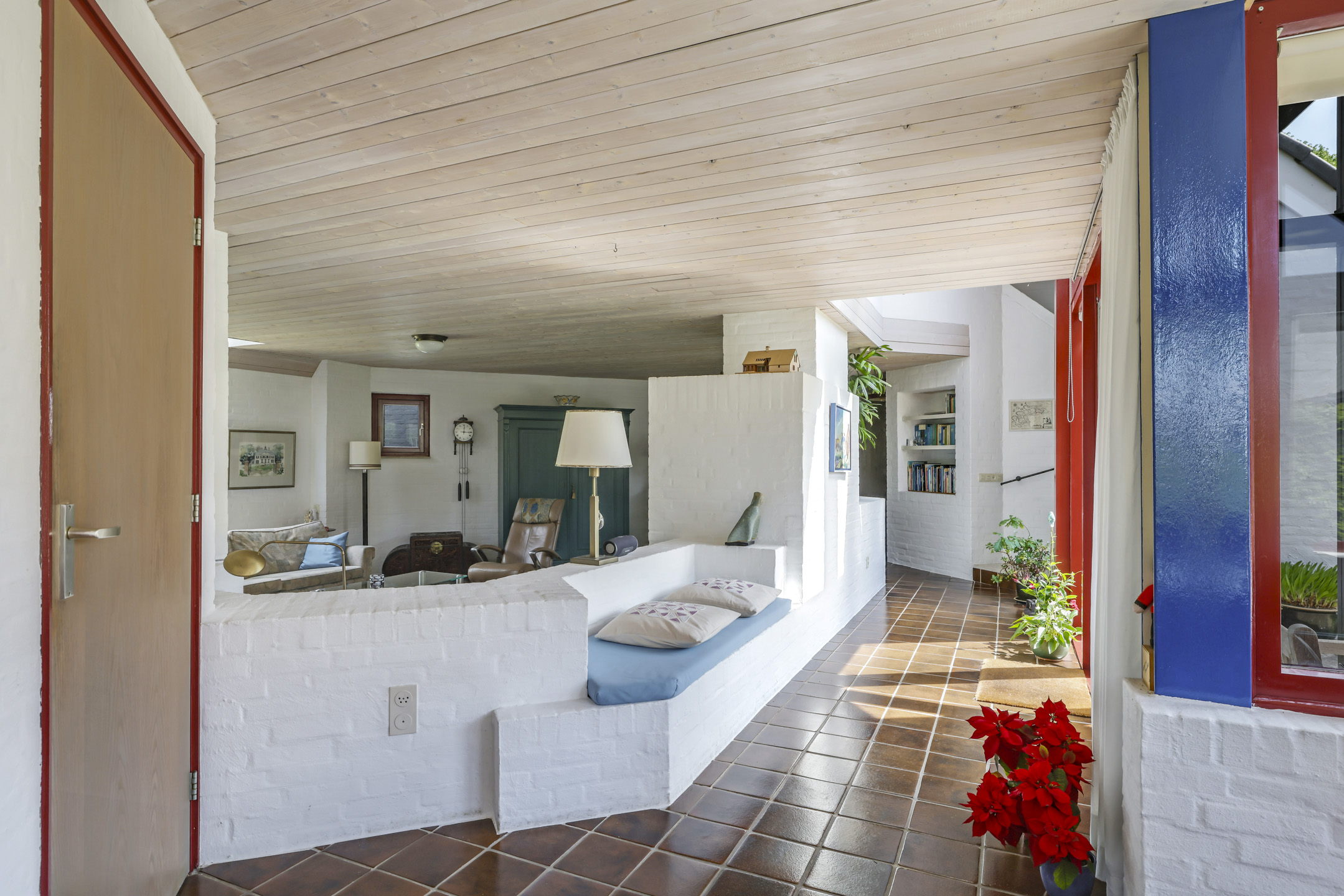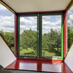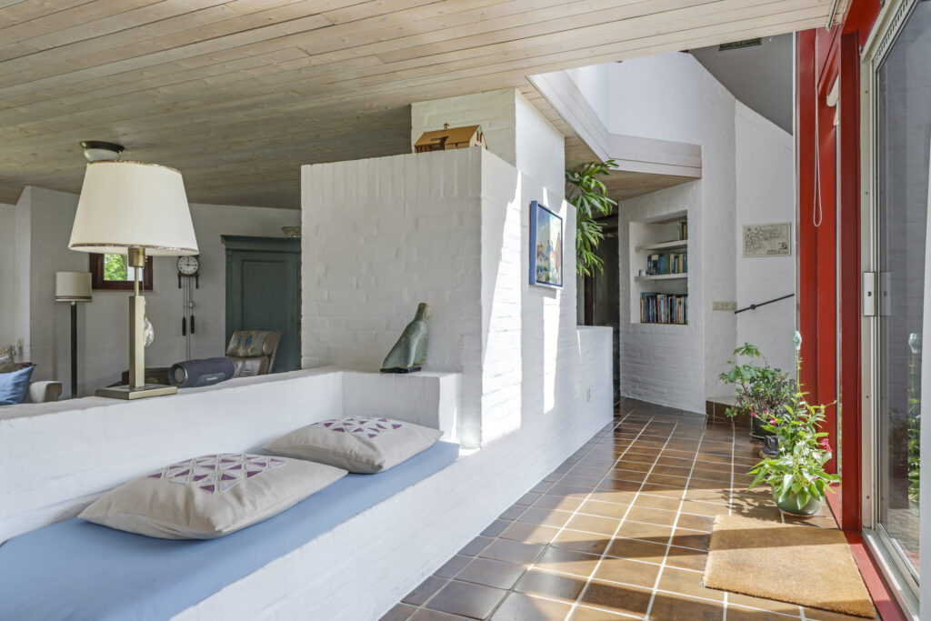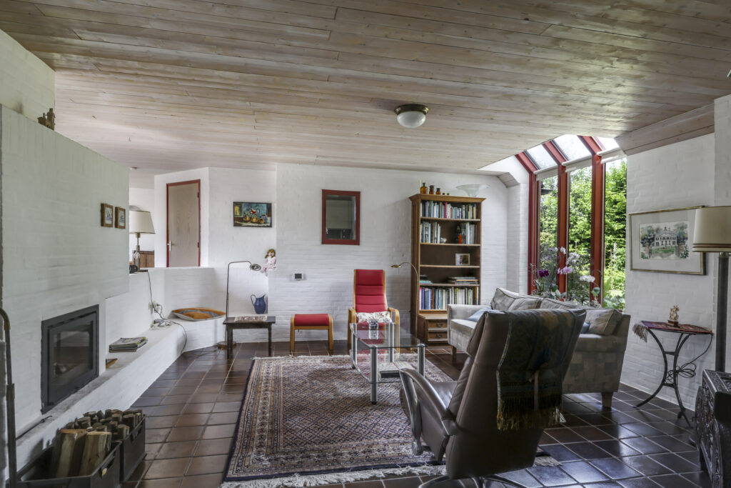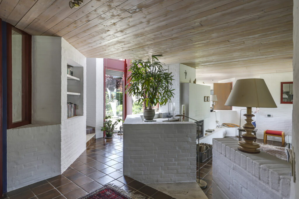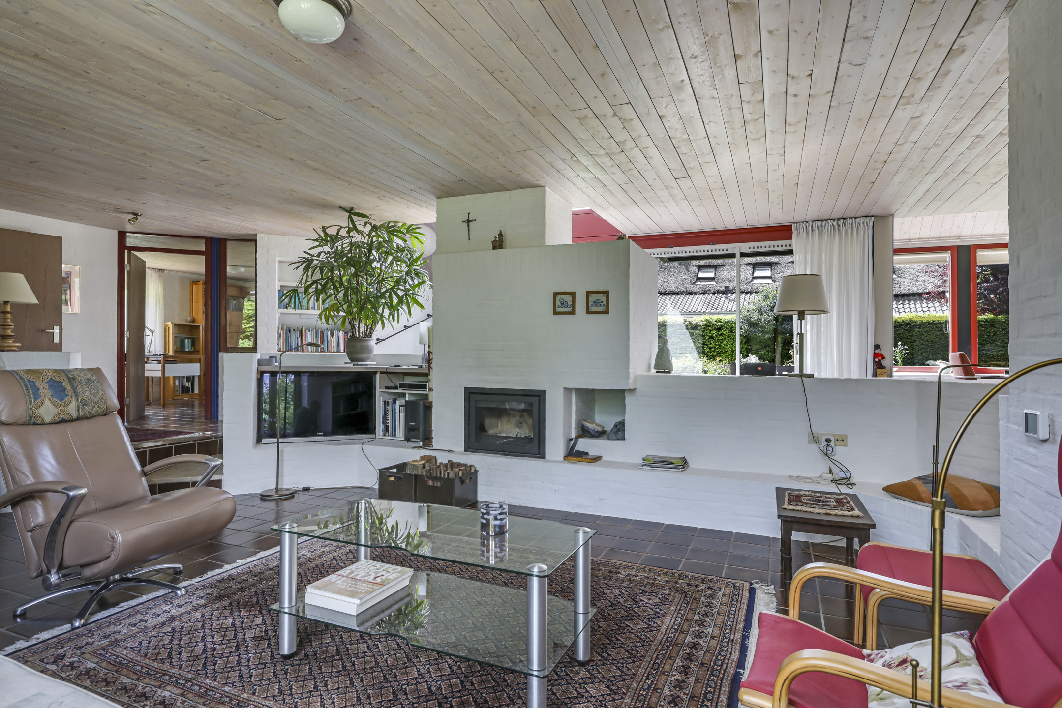 De woonkamer is in een soort ‘zitkuil’ gelegen (2 treden lager) hetgeen voor een unieke woonbeleving zorgt. Zo kun je hier een lekkere hoekbank kwijt terwijl je de TV op een plateau naast de houtkachel kunt plaatsen. Een ander opvallend element zijn de ramen die doorlopen tot in het schuine dakvlak. Dit zorgt niet alleen voor een speelse lichtinval, maar ook voor een fraai uitzicht de groene tuin in.
