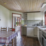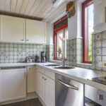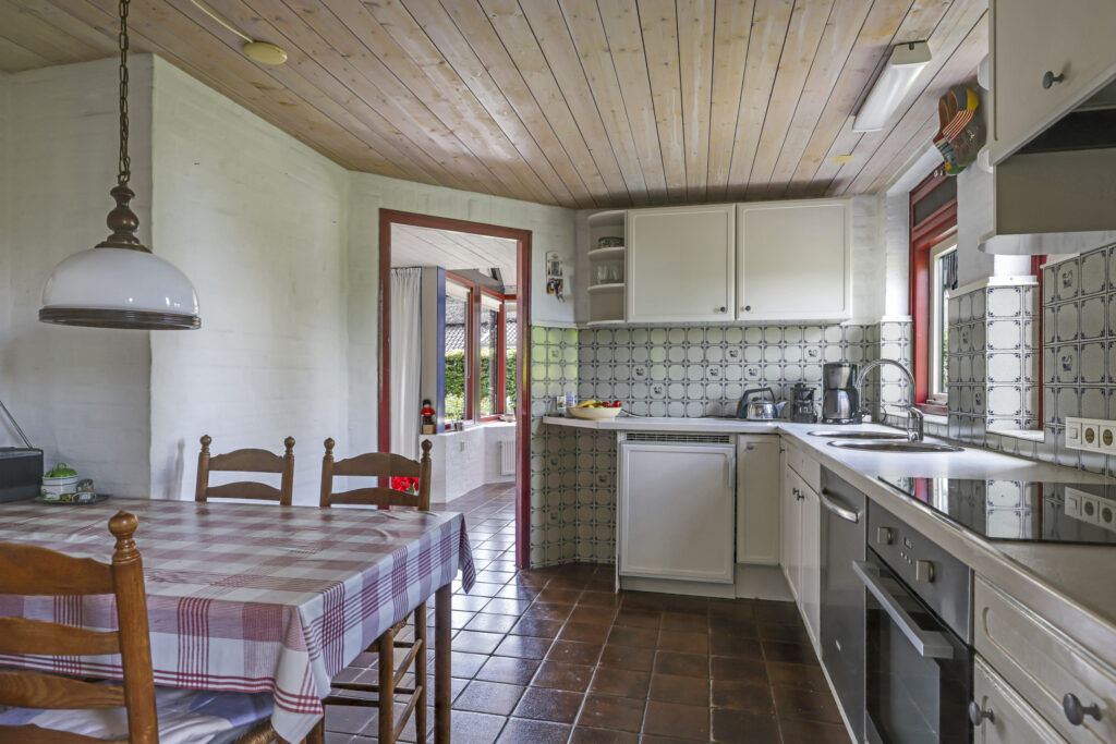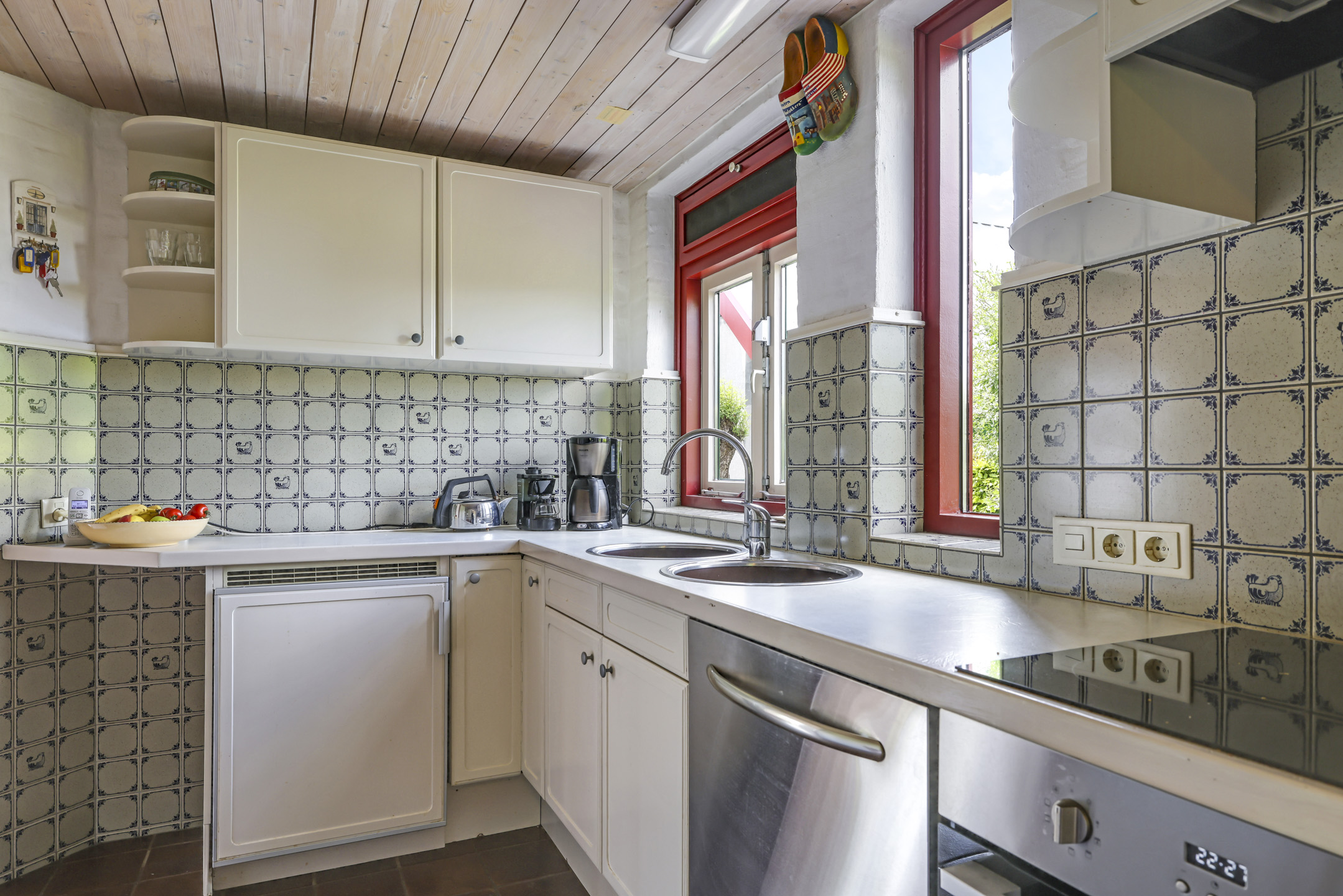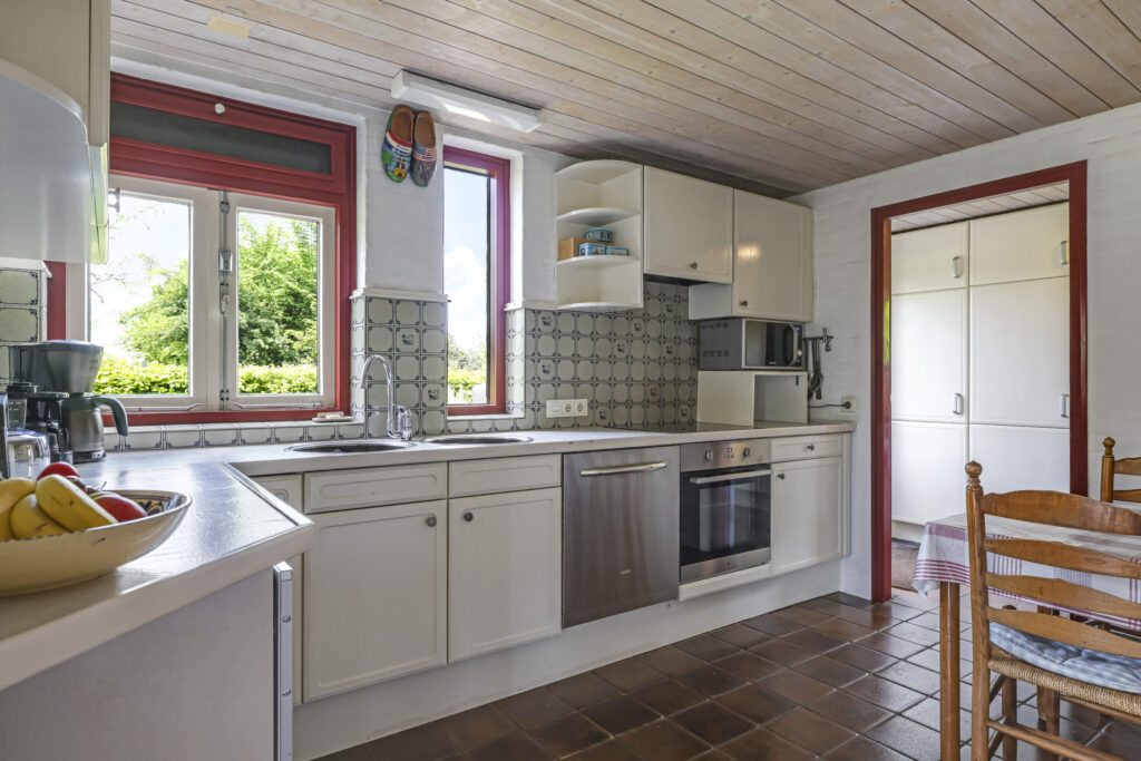 De keuken is aan de achterzijde van de woning gelegen en heeft daardoor een vrij zicht in de achtertuin. De keuken is ‘gesloten’ van de eetkamer, maar wellicht zou je de tussenwand eruit kunnen breken voor meer ruimte en een trendy (schiereiland)opstelling. Overigens is de keuken al ruim genoeg om er een eettafel kwijt te kunnen. De keukenopstelling is niet de nieuwste meer, maar wel voorzien van de gebruikelijke 5 inbouwapparaten: vaatwasser, koelkast, oven, een 4-pits keramische kookplaat en een afzuiger.