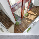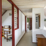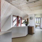 Verkeersruimte met vide, trapopgang (bordestrap) en brede schuifpui naar buitenterras.