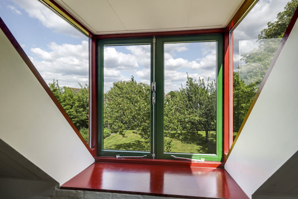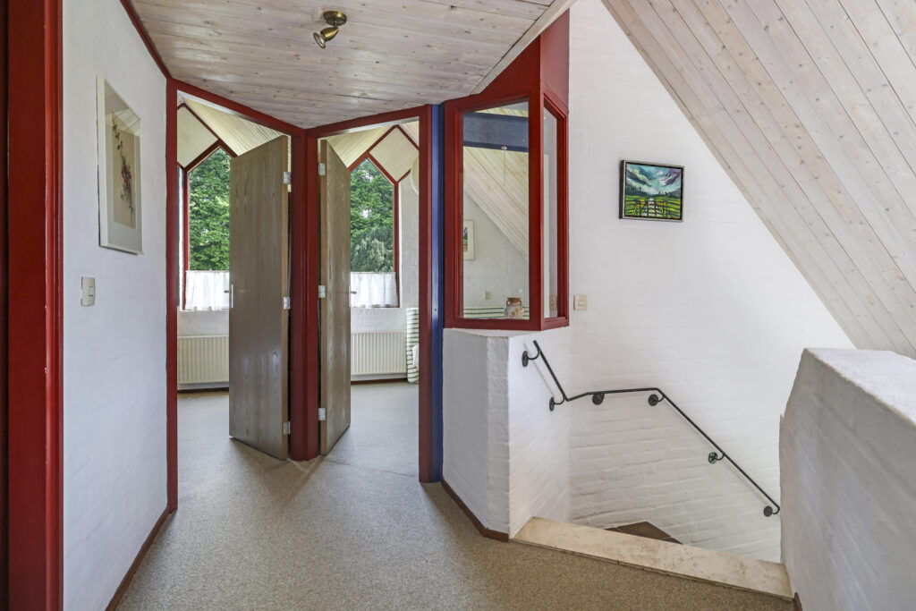 Wanneer je hier in de hal naar binnen loopt, wordt je al meteen duidelijk dat hier is nagedacht over de ruimtelijke beleving. De architect is creatief geweest met schuine binnenwanden, een hoogteverschil in de vloer (living), verschillende doorkijkjes en nisjes en de plafonds die hier en daar tot in de nok doorlopen. In de woning is bijna geen raampartij hetzelfde waardoor het speelse karakter extra wordt versterkt. Bovendien zorgt het voor een fijne lichtinval, bijvoorbeeld bij de hoge glaspui van de vide die tot op de verdieping doorloopt. Ook zijn de ramen in de woonkamer op z’n minst opvallend te noemen en bieden de ramen van de eethoek (3 zijden) bijzonder veel lichtinval alsof je in een serre zit.