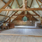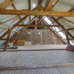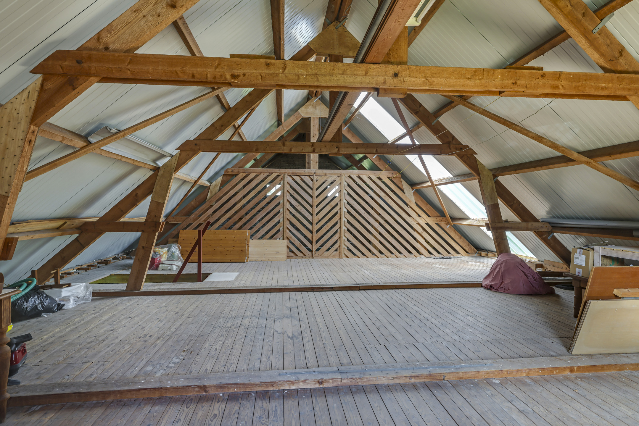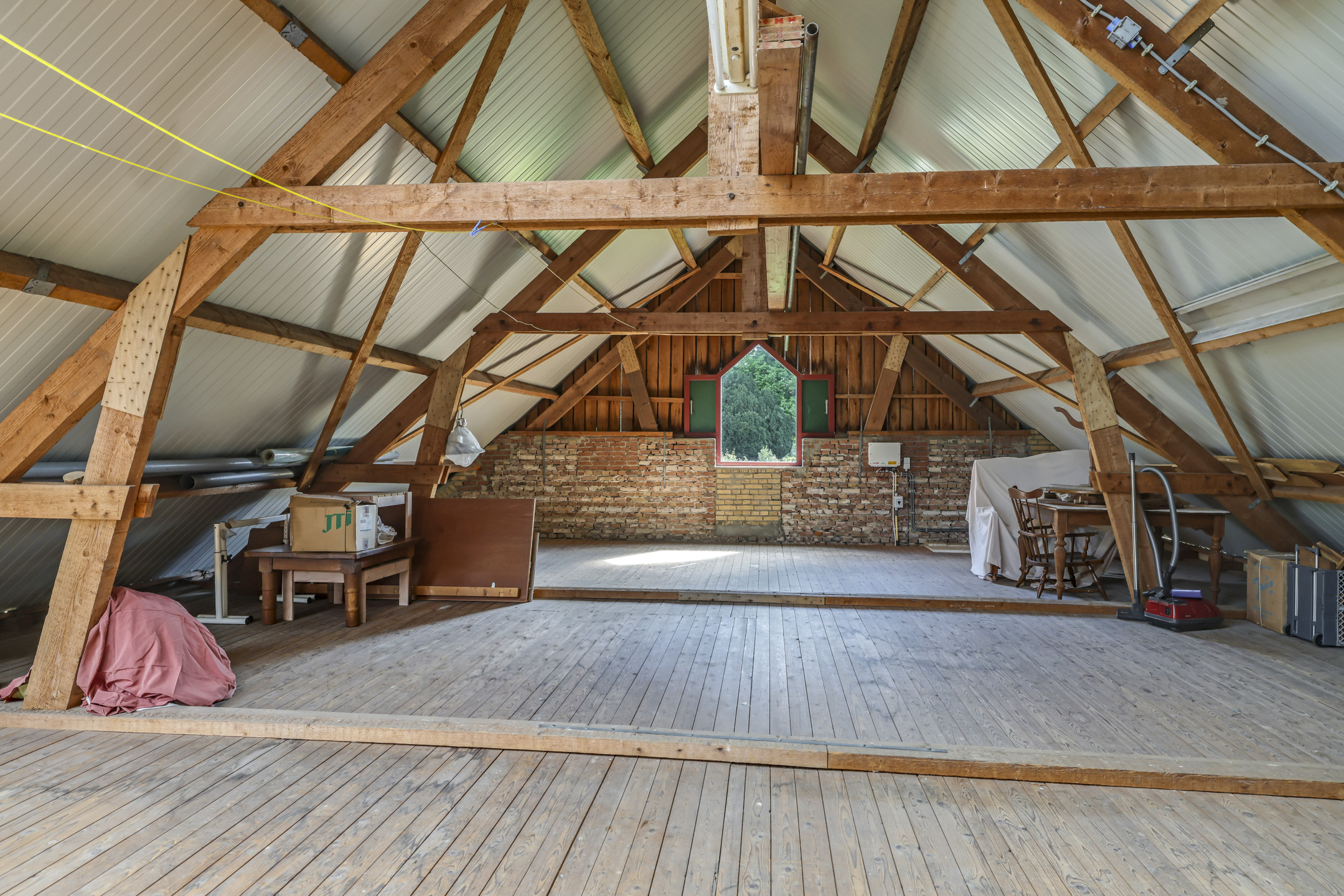 Deze degelijke schuur is met massieve, steensmuren opgetrokken waarbij de gevels zijn voorzien van diverse stalraampjes die voor daglicht zorgen. De asbestdaken zijn gesaneerd en medio 2017 is het dak voorzien van nieuw, fraai spantwerk en geïsoleerde sandwichpanelen (Falk). De nok op de verdieping ligt op maar liefst 4,5 meter hoogte hetgeen nog eens ca. 66m2 extra gebruiksoppervlak oplevert (gemeten vanaf 1,5m hoogte). Deze verdieping is met een vaste trap toegankelijk en biedt enorm veel ruimte en mogelijkheden. De ‘lichtstraat’ in de kapconstructie versterkte daarbij nog eens het ruimtelijke gevoel.