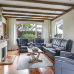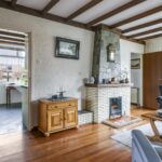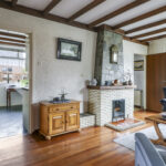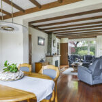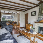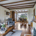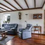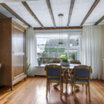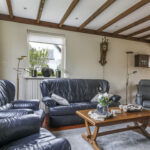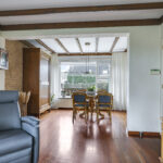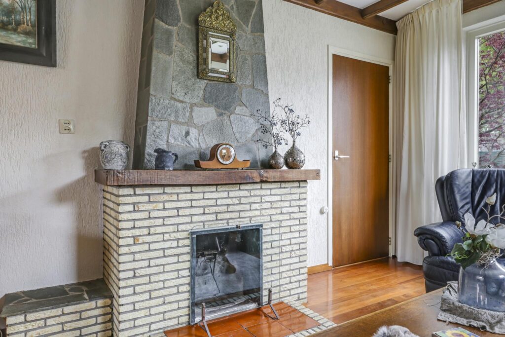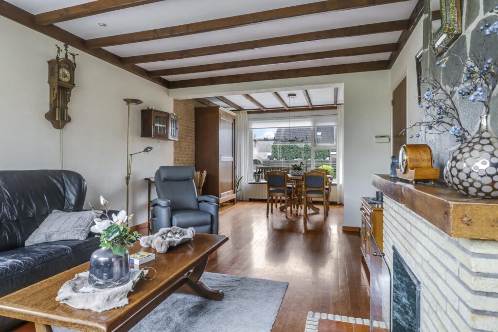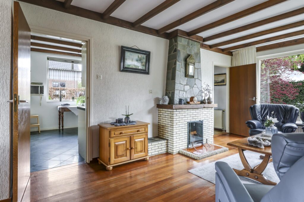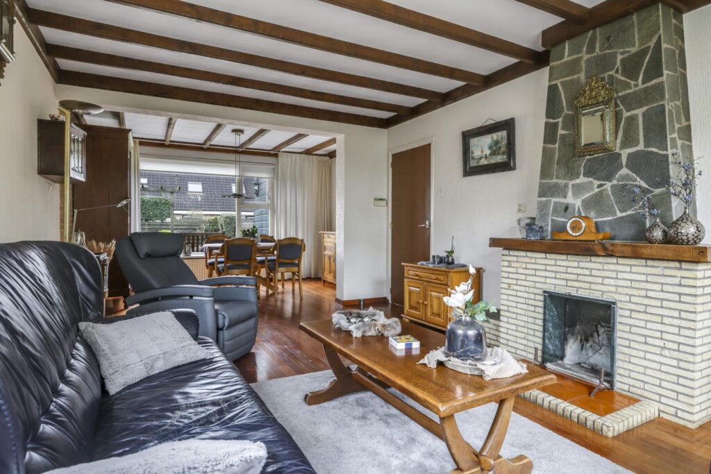 De woonkamer is heerlijk licht dankzij de grote raampartijen aan 3 zijden van de ruimte. De houten vloer en het balkenplafond zorgen voor karakter en warmte. De woonkamer is aan de achterzijde uitgebouwd en biedt daardoor volop leefruimte. De gezellige zithoek vloeit naadloos over in de eethoek met zicht op de tuin. De zithoek aan de voorzijde biedt uitzicht op de voortuin, terwijl je aan de achterzijde via de eethoek zicht hebt op het terras en het groen daarachter. De open haard vormt een sfeervol middelpunt van de ruimte.