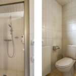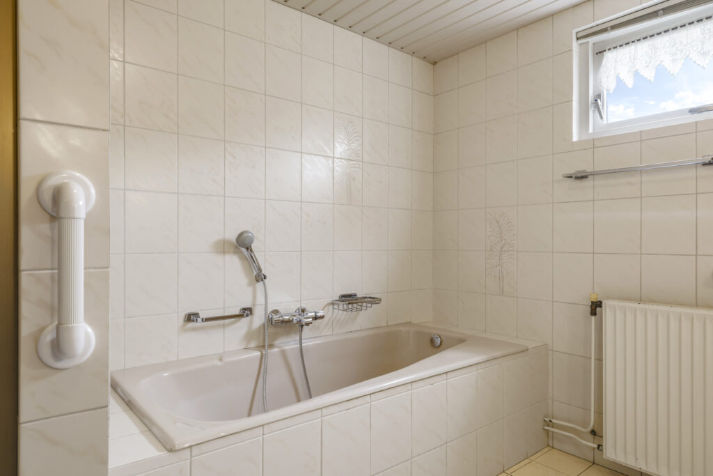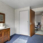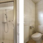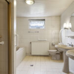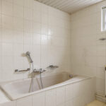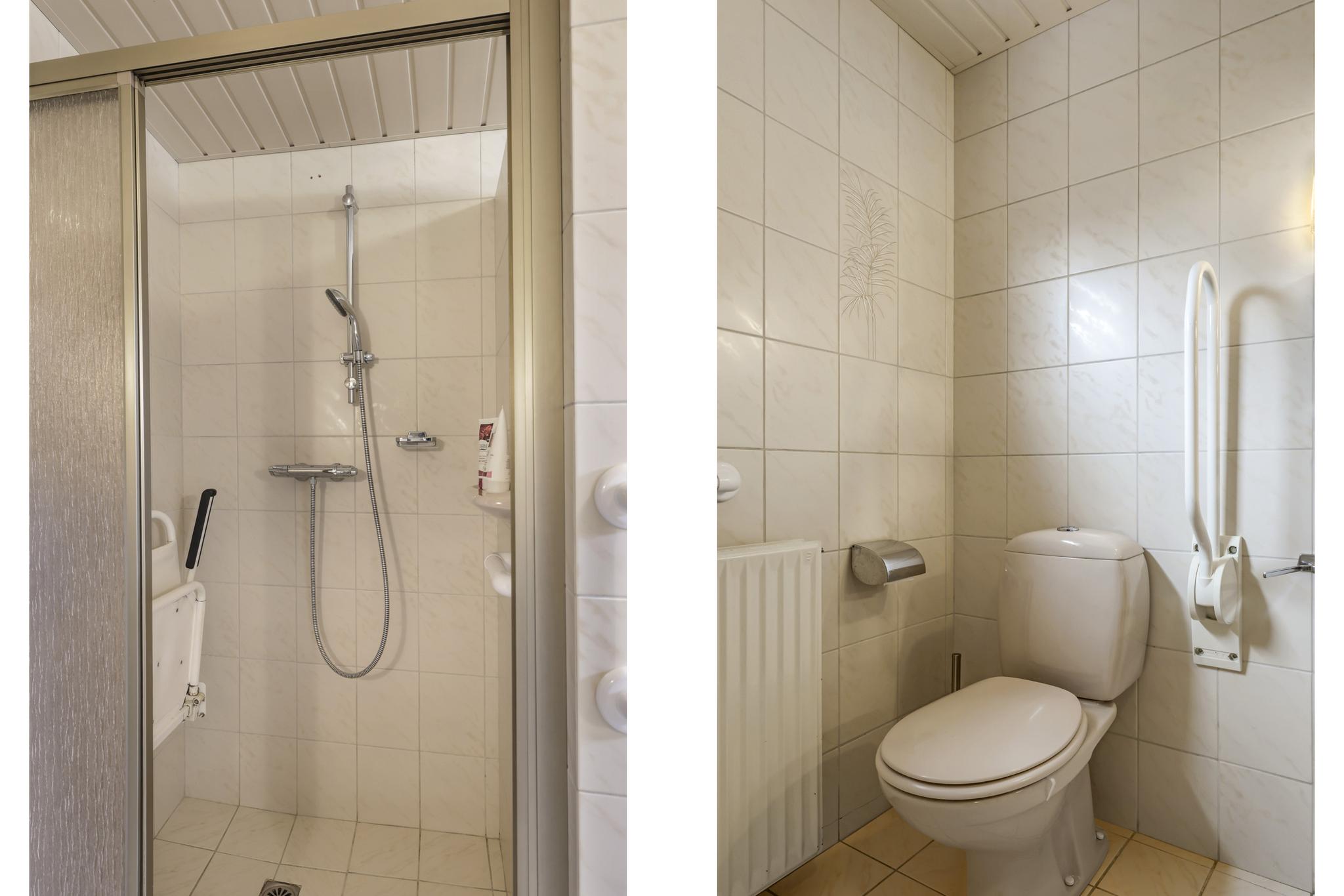 De badkamer is op de begane grond gelegen en is daardoor groter dan gemiddeld. De ruimte is dan ook praktisch en compleet ingedeeld met alle wenselijke sanitair. Denk daarbij aan een comfortabel ligbad voor ontspannen momenten, een aparte inloopdouche en twee wastafels met een planchet en spiegel erboven. Het hooggeplaatste raam zorgt voor natuurlijke ventilatie en een prettige lichtinval.