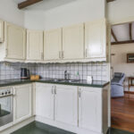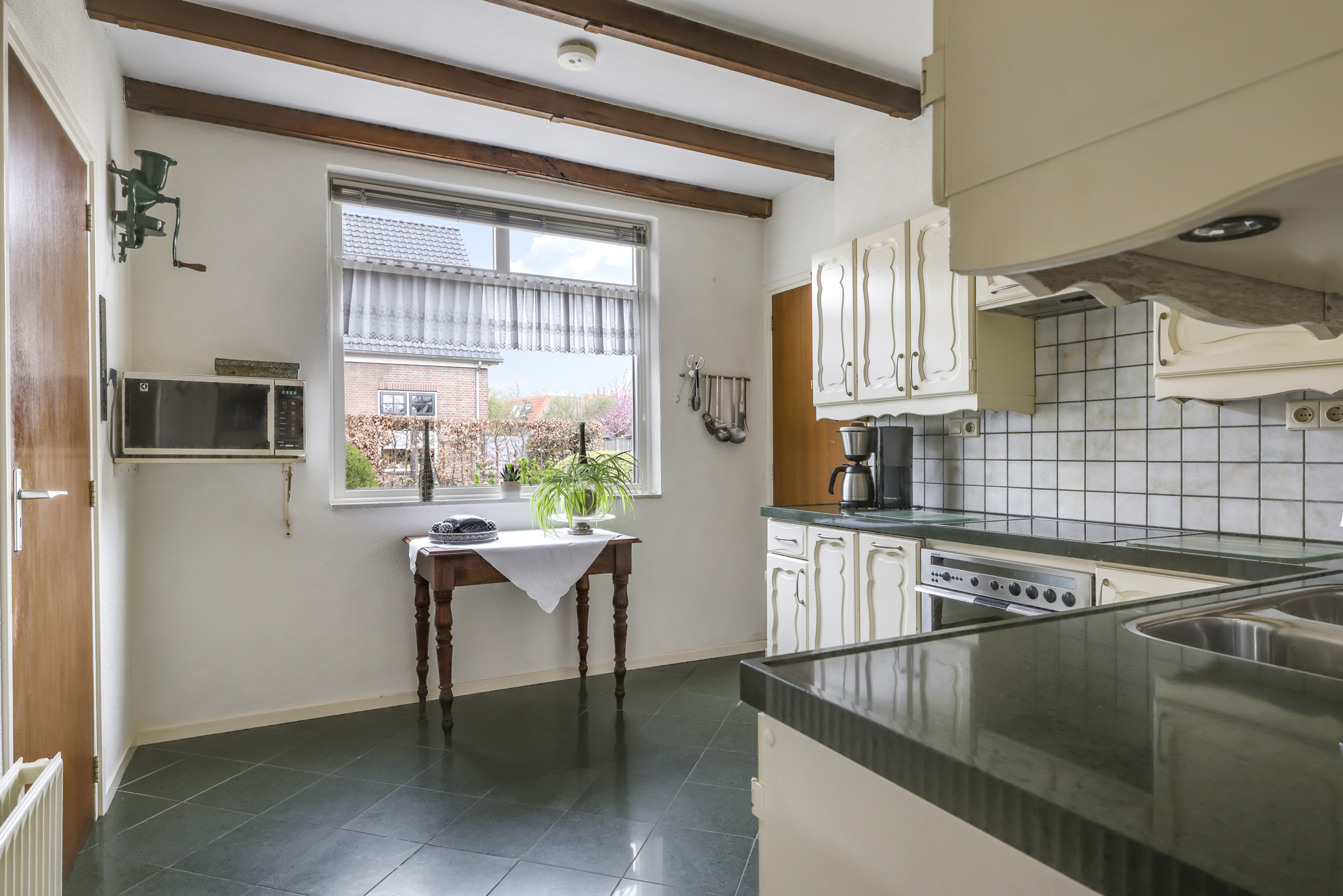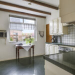 De keuken grenst direct aan de woonkamer en is ingericht in een hoekopstelling. De keuken is voorzien van een keramische kookplaat, een afzuiger, een combi-oven/magnetron, een inbouwkoelkast, veel lades en praktische werkruimte. Het natuurstenen werkblad geeft de keuken een luxe uitstraling. In de keuken heb je tevens nog ruimte voor bijvoorbeeld een ontbijtbar. De keuken biedt direct toegang tot de hal richting badkamer, garage en het achtererf.