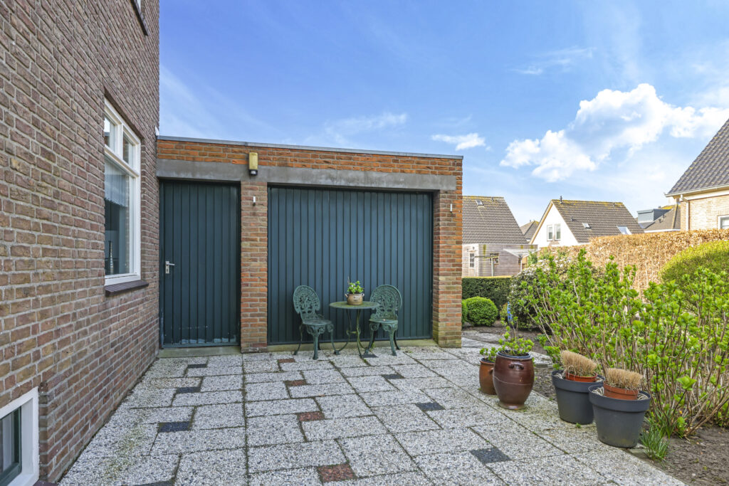 Binnenin is de garage voorzien van elektra en verwarming, wat het werken of klussen in de winter een stuk aangenamer maakt. Dankzij de witgoedaansluitingen kun je hier bovendien de wasmachine en droger kwijt, zonder dat je daar binnenruimte voor hoeft in te leveren. Twee grote ramen zorgen voor prettig daglicht en maken van de garage een lichte en functionele ruimte. Ook een tuindeur naar de achtertuin ontbreekt niet, wat het geheel nog praktischer maakt.