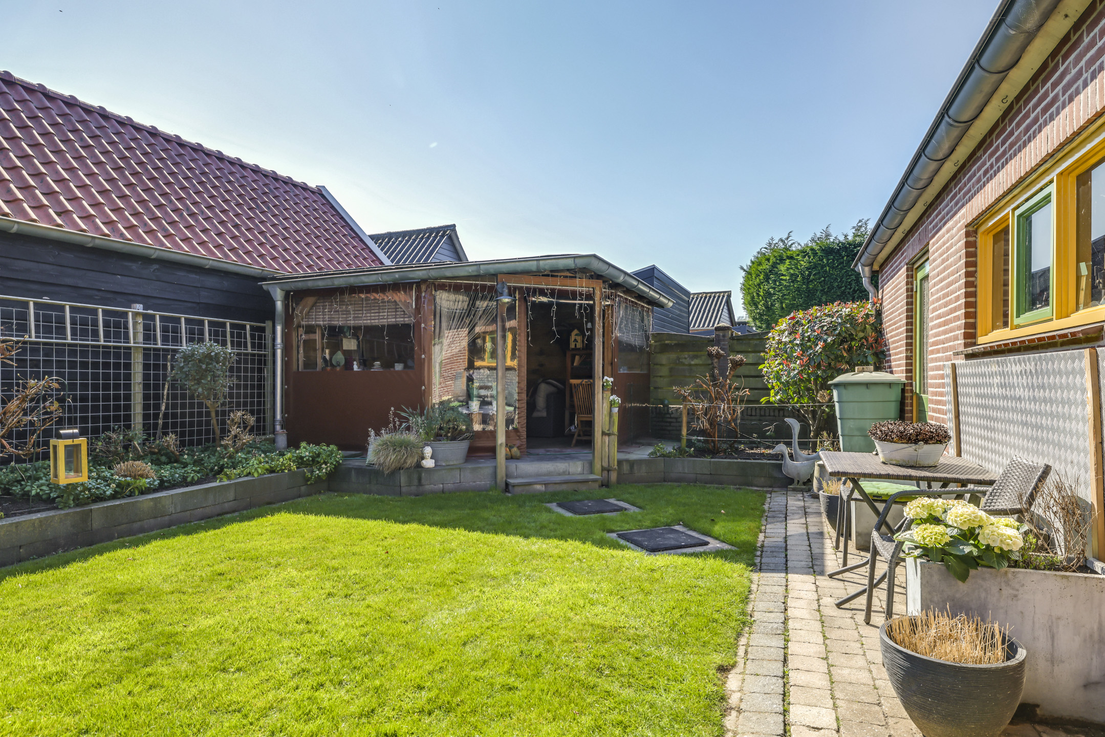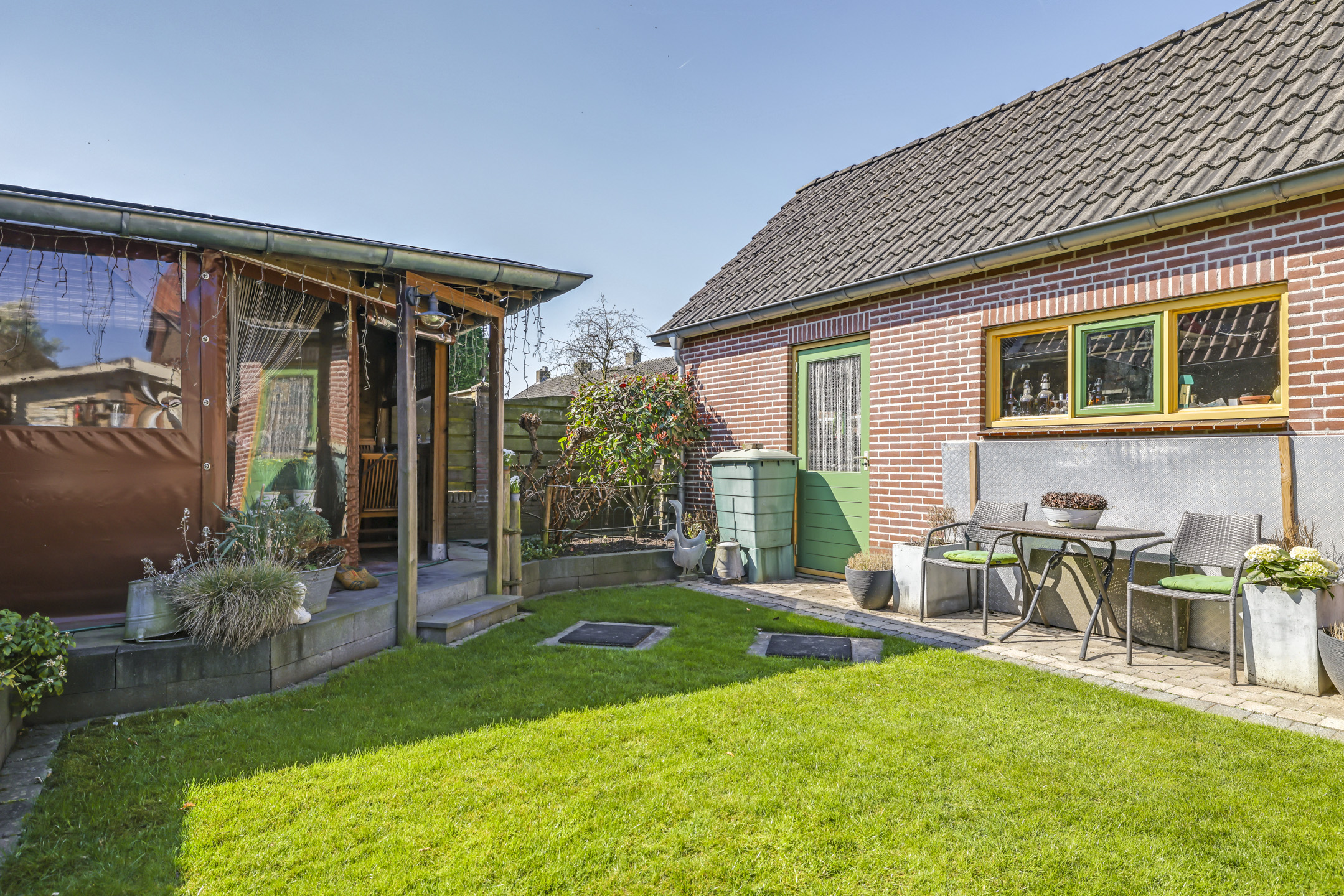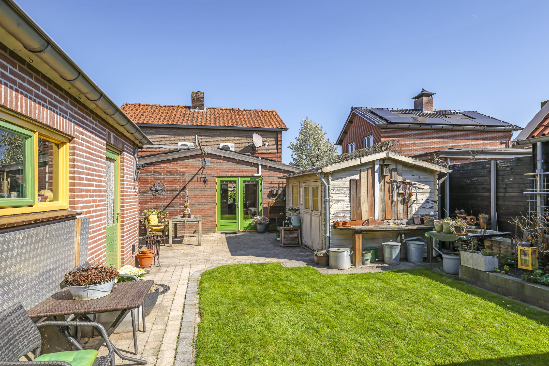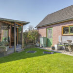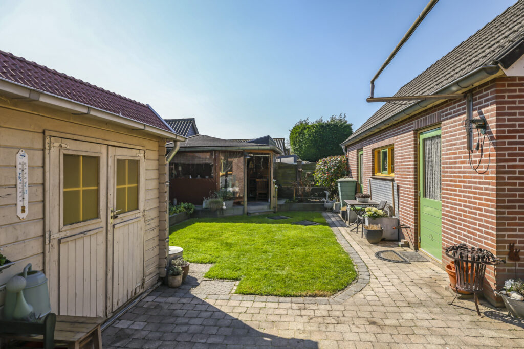 Diepe zonnige achtertuin met veranda, gazon en tuinhuis