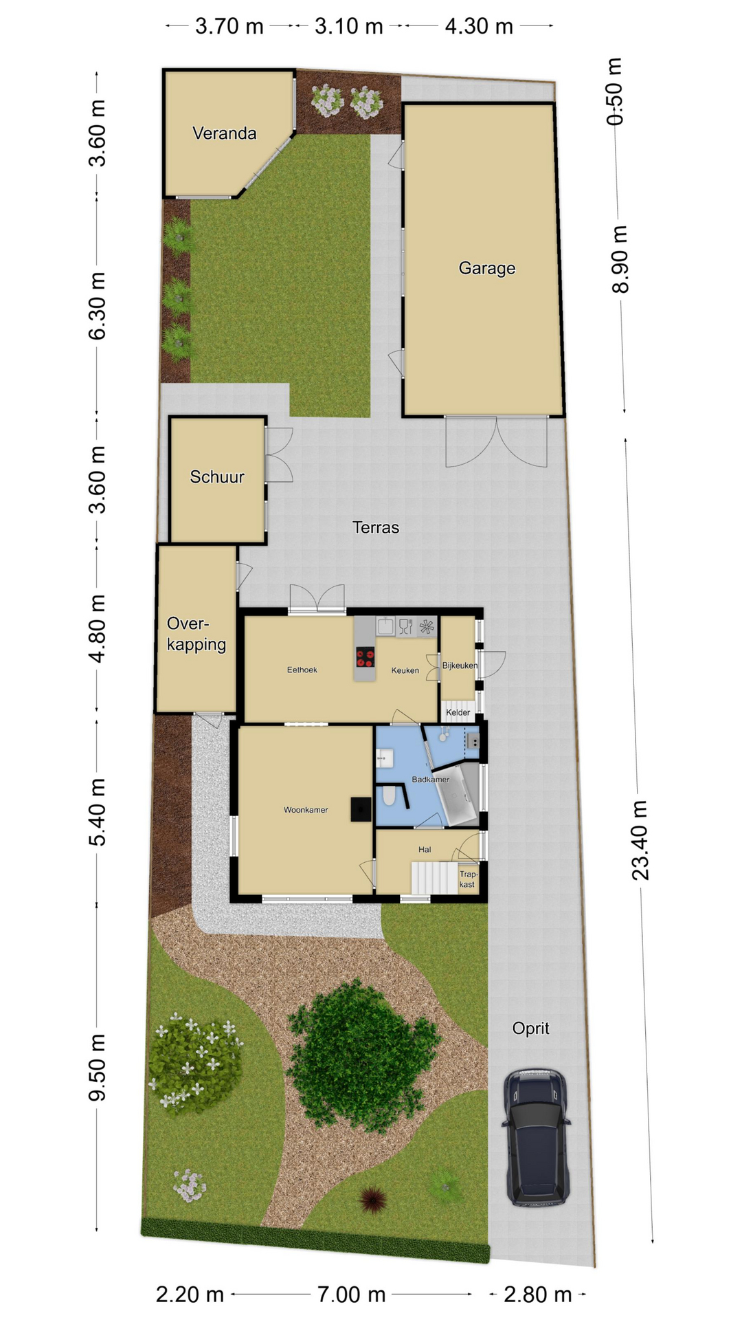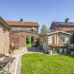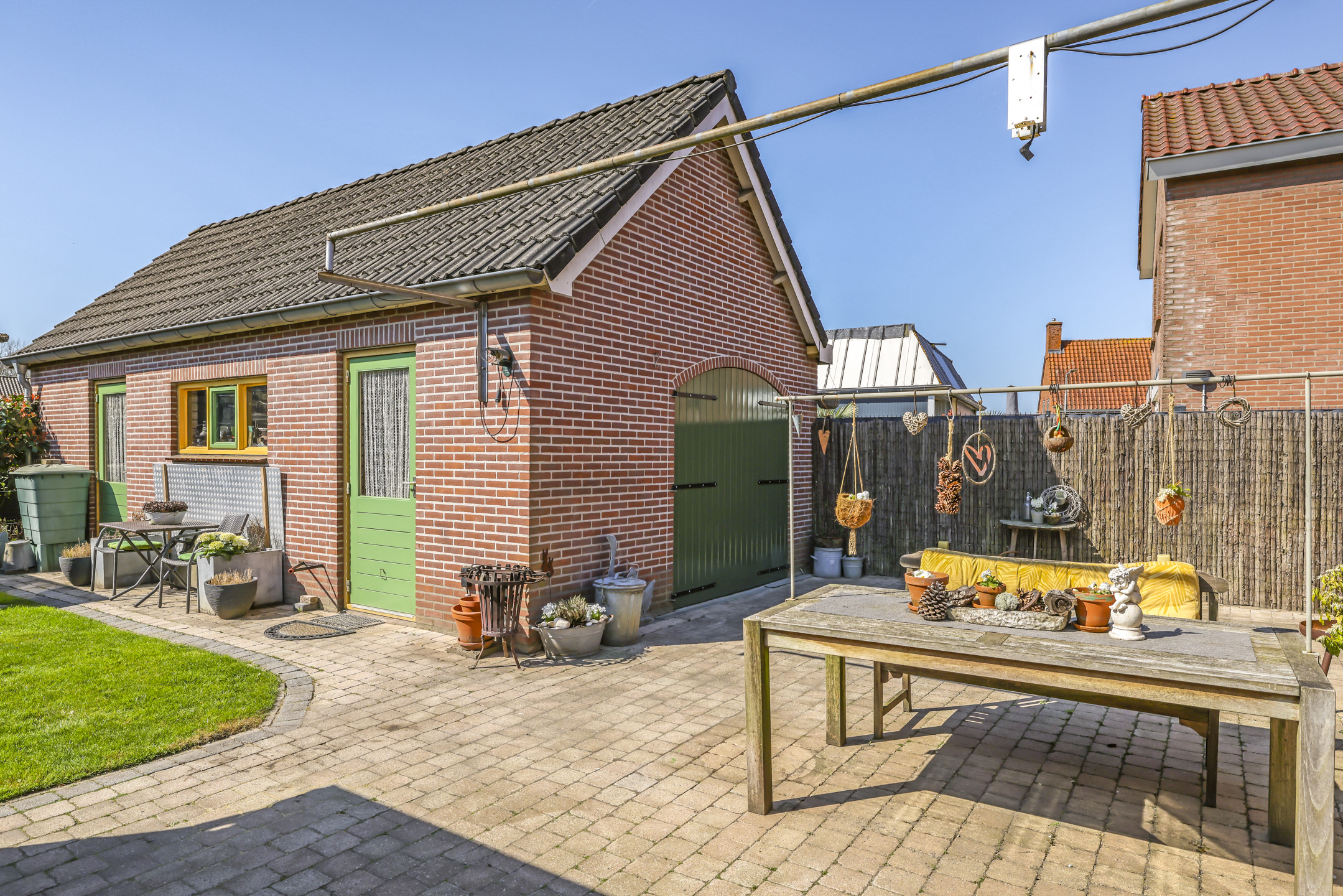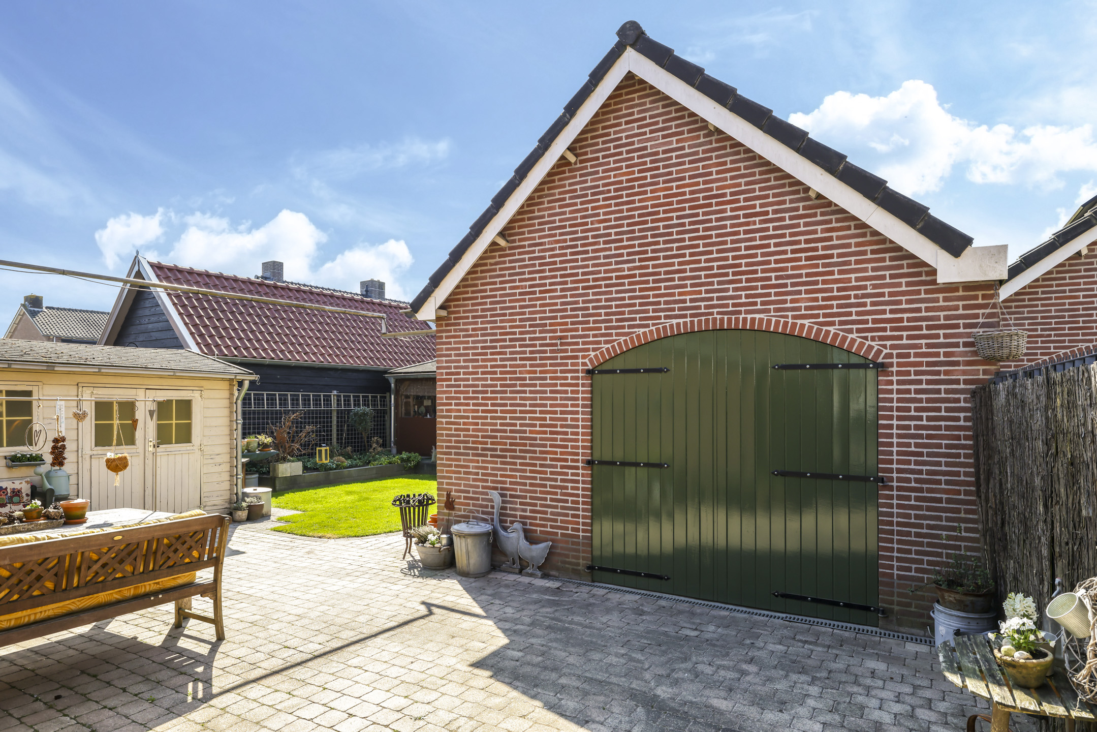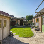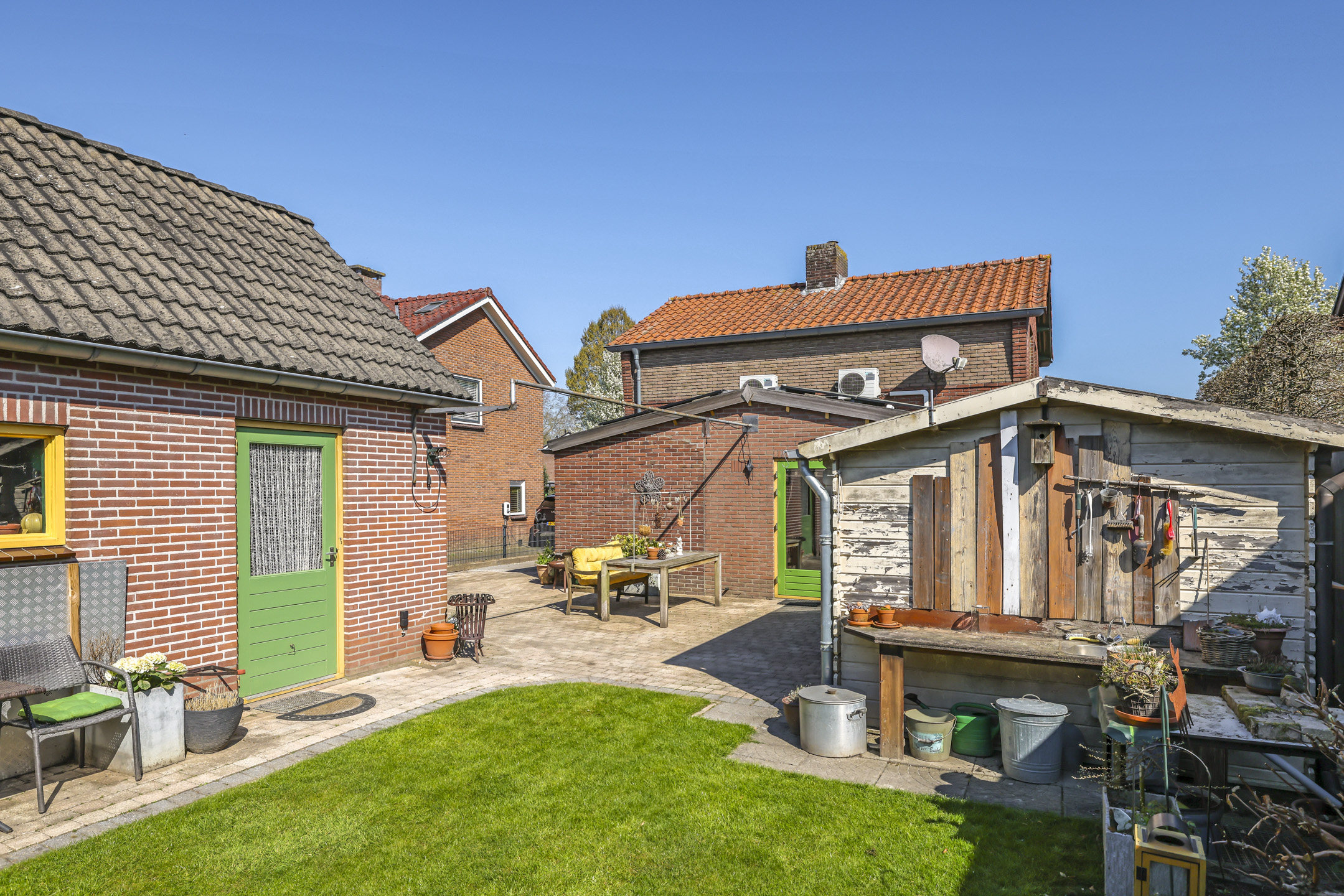 Diepe zonnige achtertuin met veranda, gazon en tuinhuis
