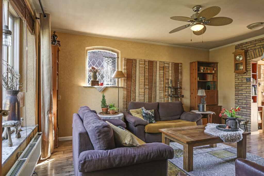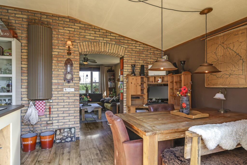 De woonkamer straalt een knusse en warme sfeer uit die direct uitnodigt tot ontspannen. De ruimte is voorzien van een prachtig afgewerkte houten vloer die niet alleen zorgt voor een natuurlijke uitstraling, maar dankzij de isolatie ook bijdraagt aan een aangenaam binnenklimaat. Grote raampartijen zorgen voor een overvloed aan natuurlijk licht en bieden een fraai uitzicht op de groene, verzorgde voortuin. Hierdoor voelt de woonkamer extra ruim en levendig aan. Een sfeervolle gashaard vormt het warme middelpunt van de kamer en zorgt op koudere dagen voor extra gezelligheid en comfort. De indeling van de ruimte biedt volop mogelijkheden voor het creëren van een zithoek, waar je heerlijk kunt ontspannen. Kortom, een ideale plek om thuis te komen.