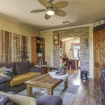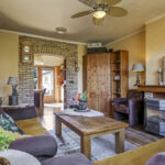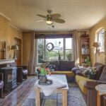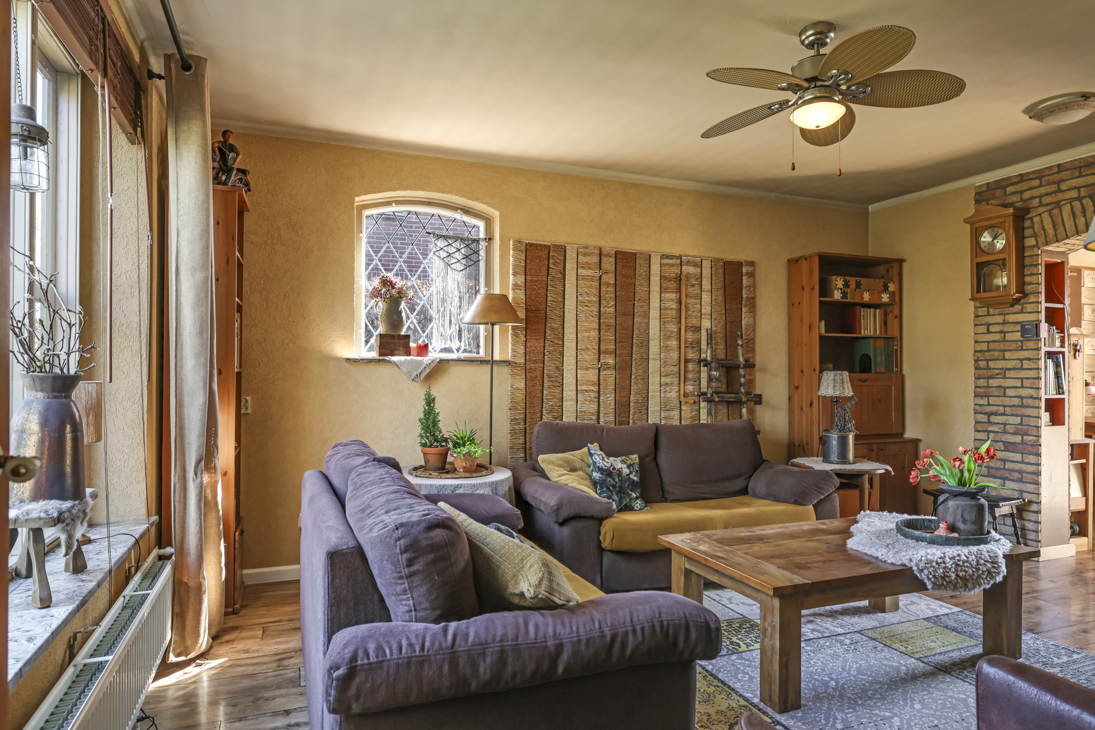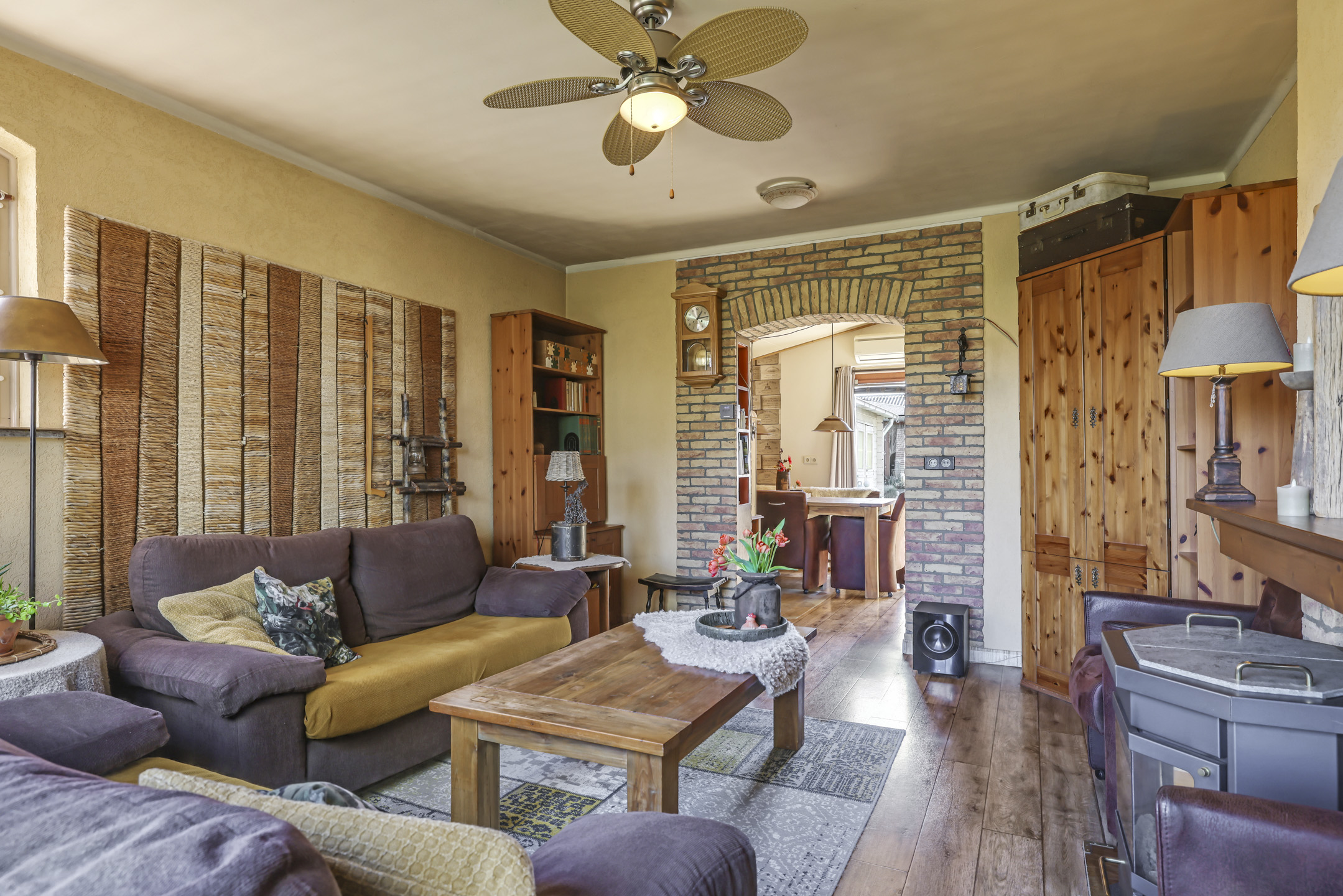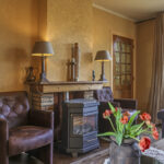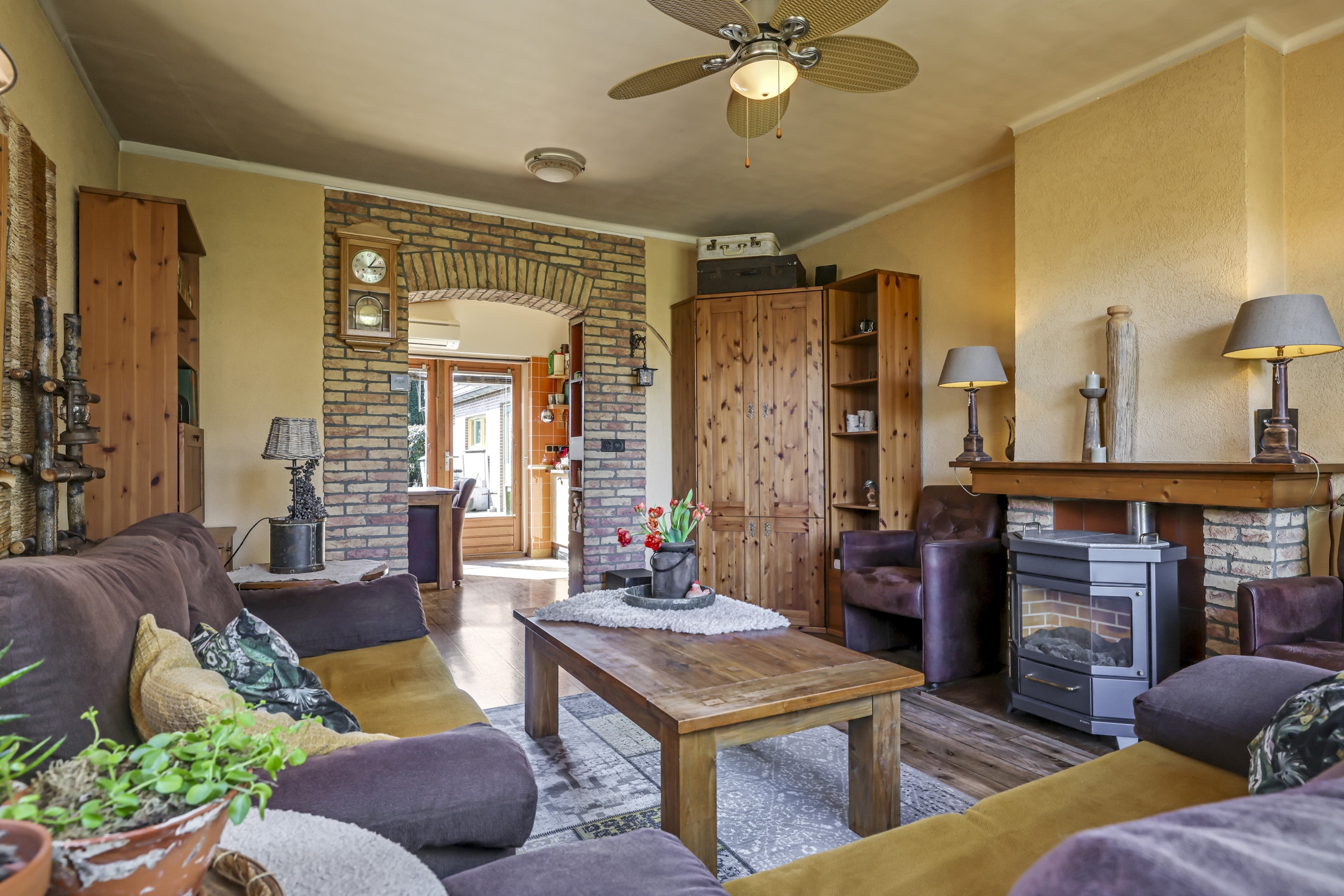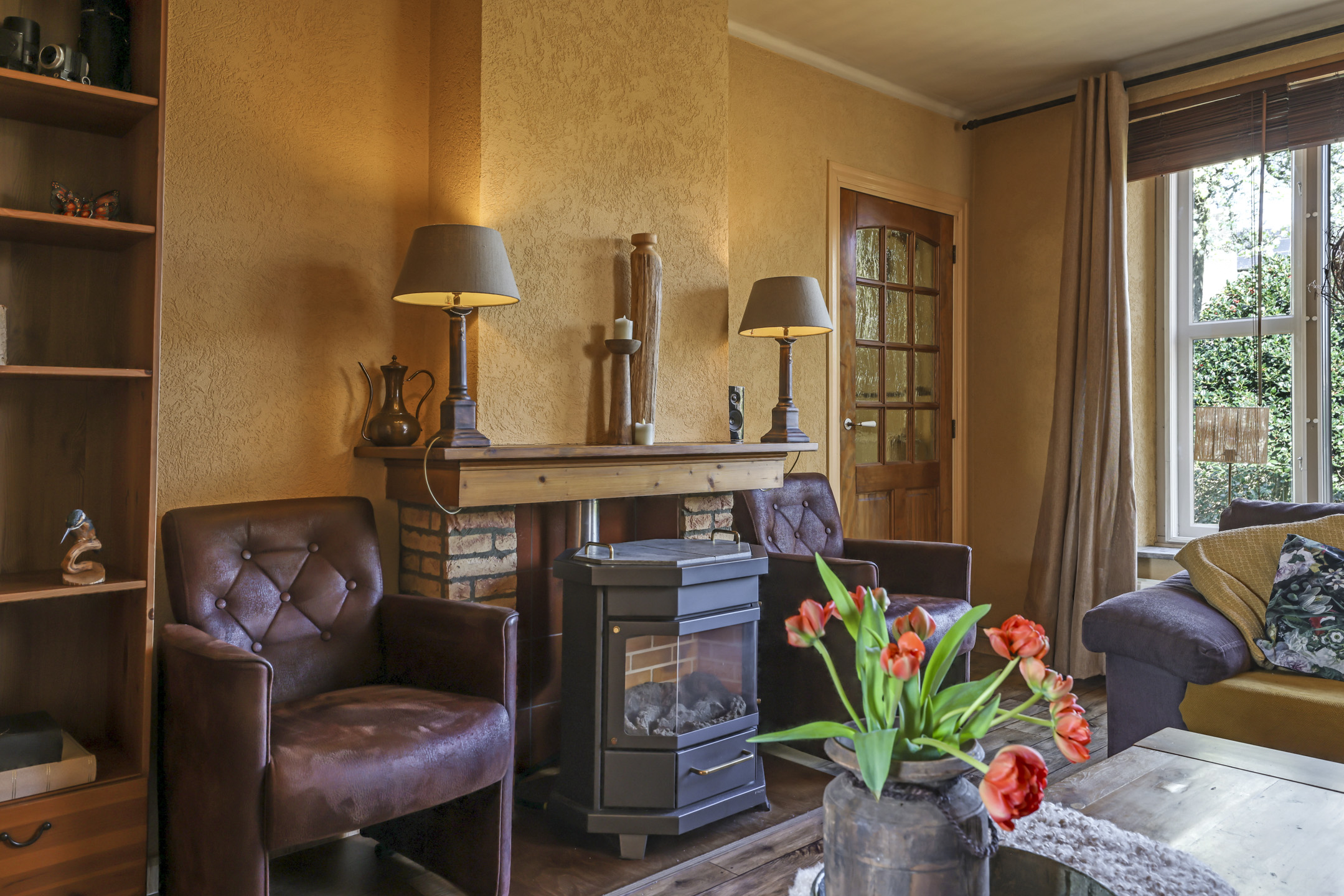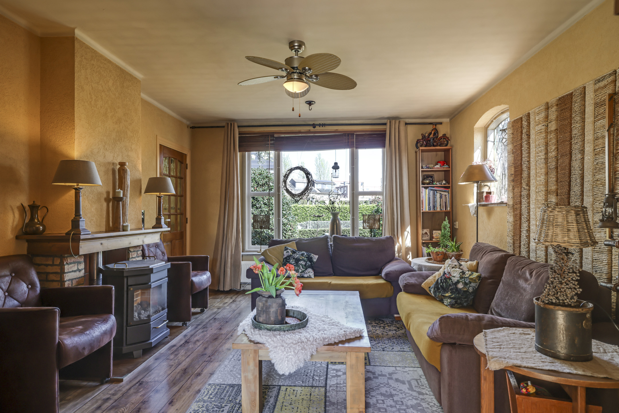 Gezellige woonkamer met houten vloer en gashaard
