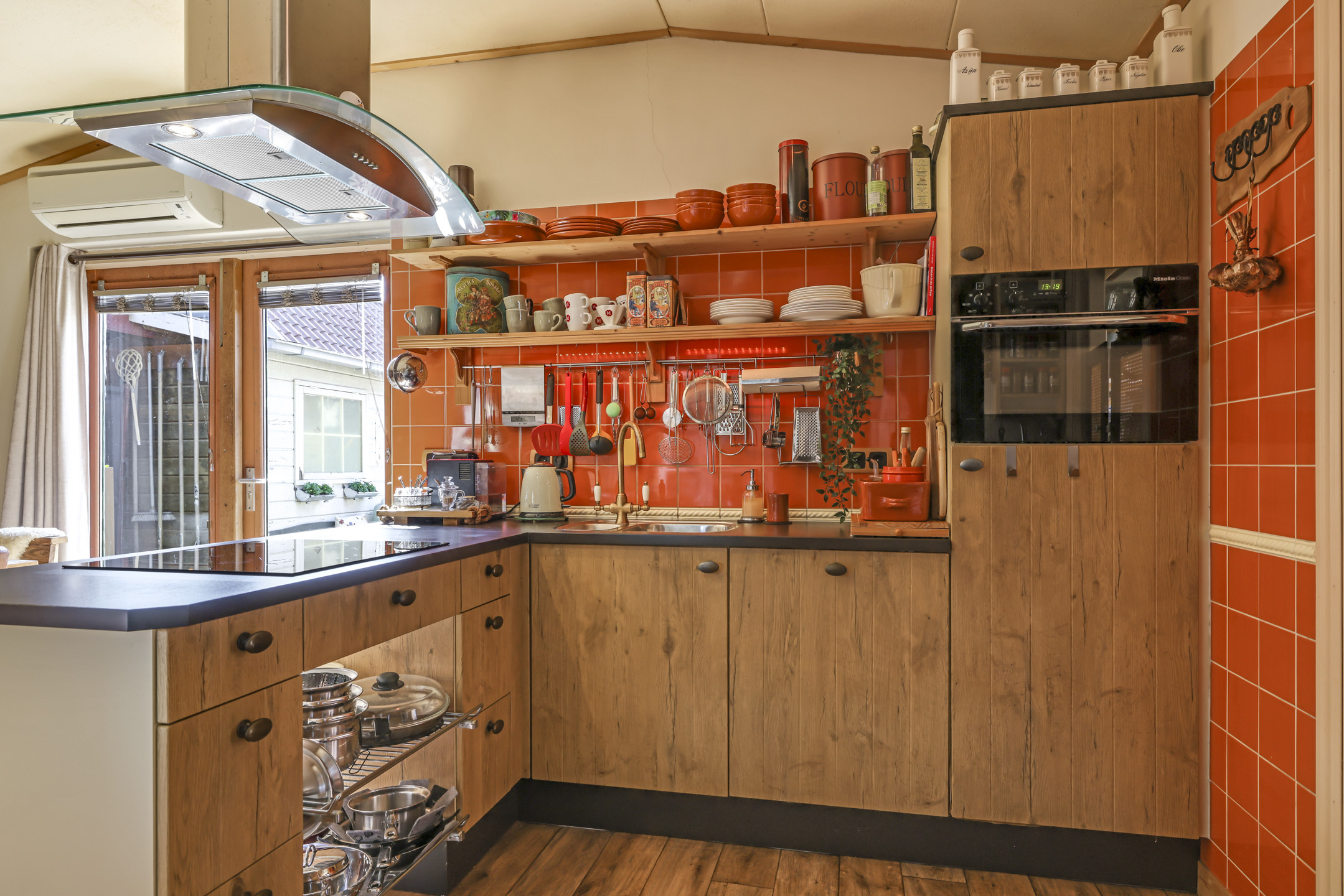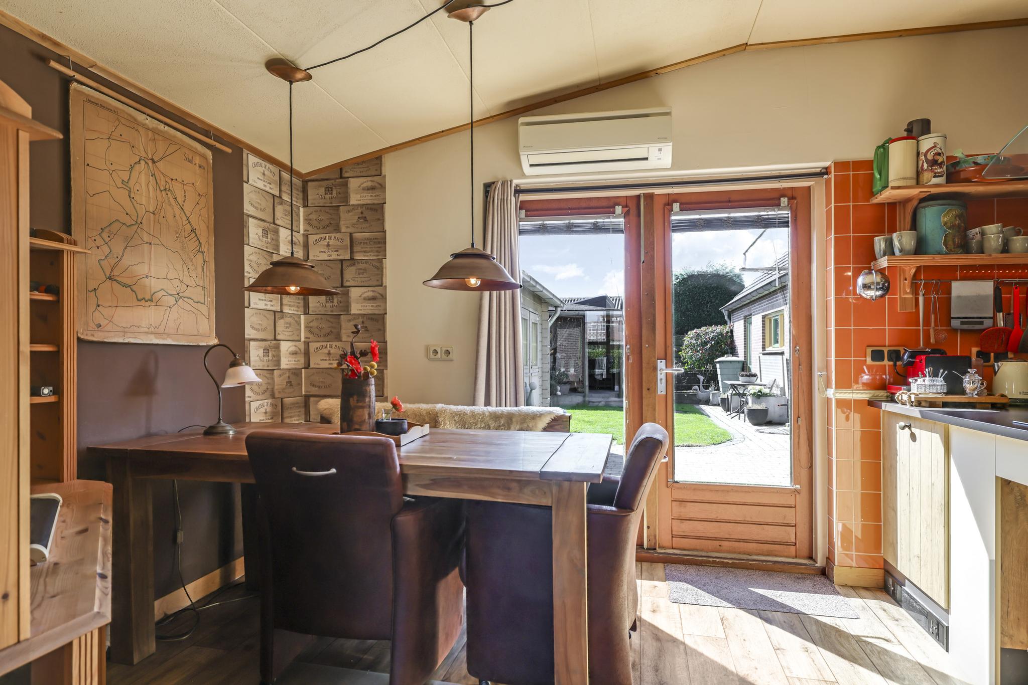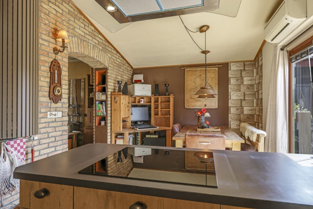 In de aanbouw aan de achterzijde bevindt zich een royale woonkeuken. De keuken is in een hoekopstelling met een schiereiland geplaatst. Zo klets je tijdens het koken gezellig door met je de tafelgenoten. De inbouwapparatuur bestaat uit een inductiekookplaat (2024), een vaatwasser (2025) een combi-oven en een koelkast. In de achtergevel zijn openslaande tuindeuren geplaatst waardoor je op de zomerdag alles lekker op zetten. De temperatuur blijft aangenaam door de aanwezige airco.