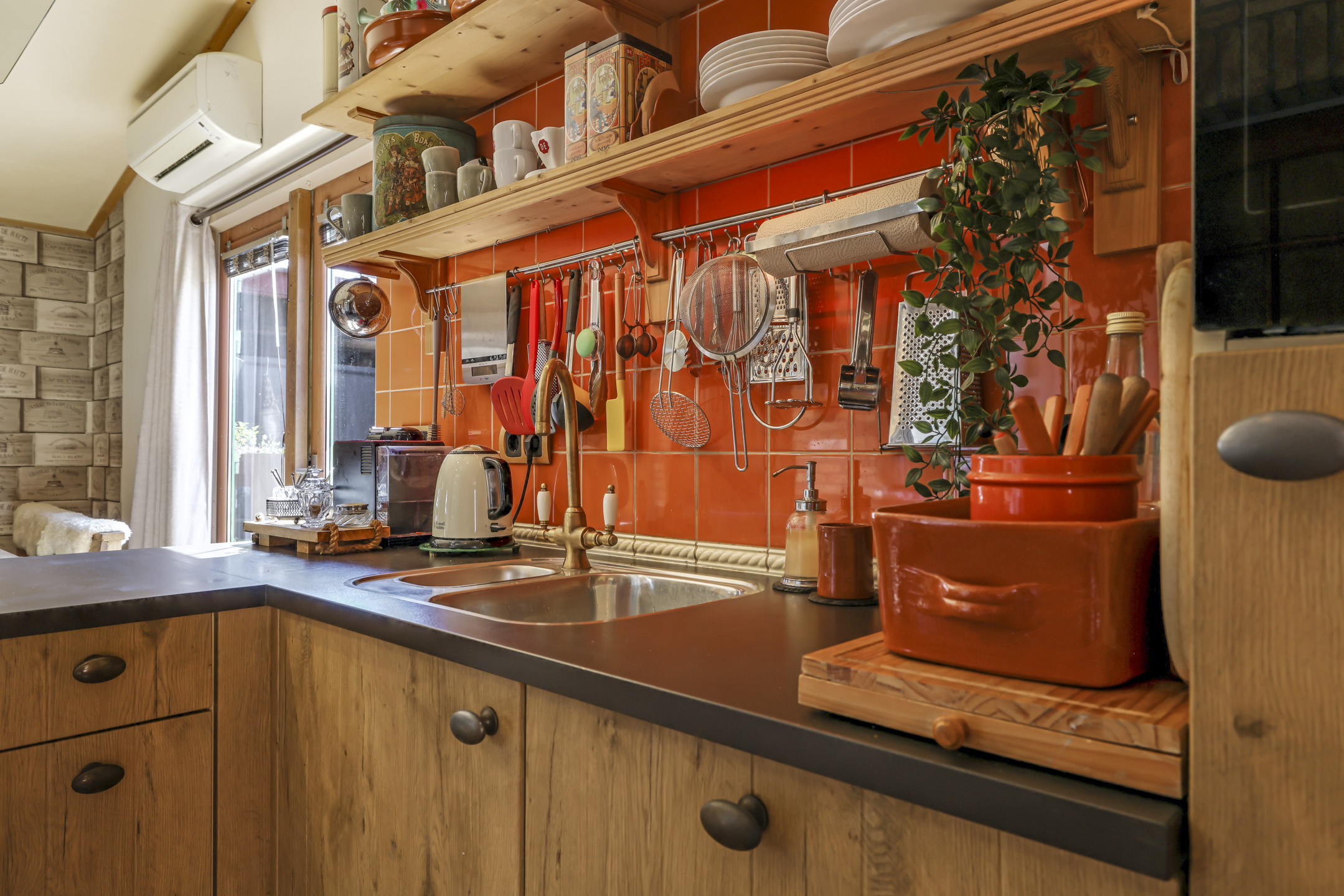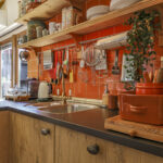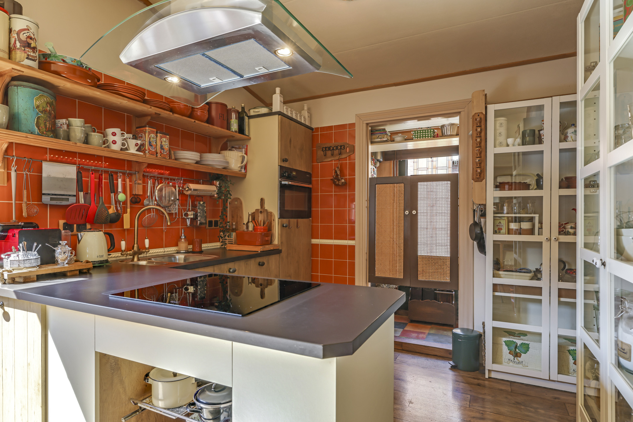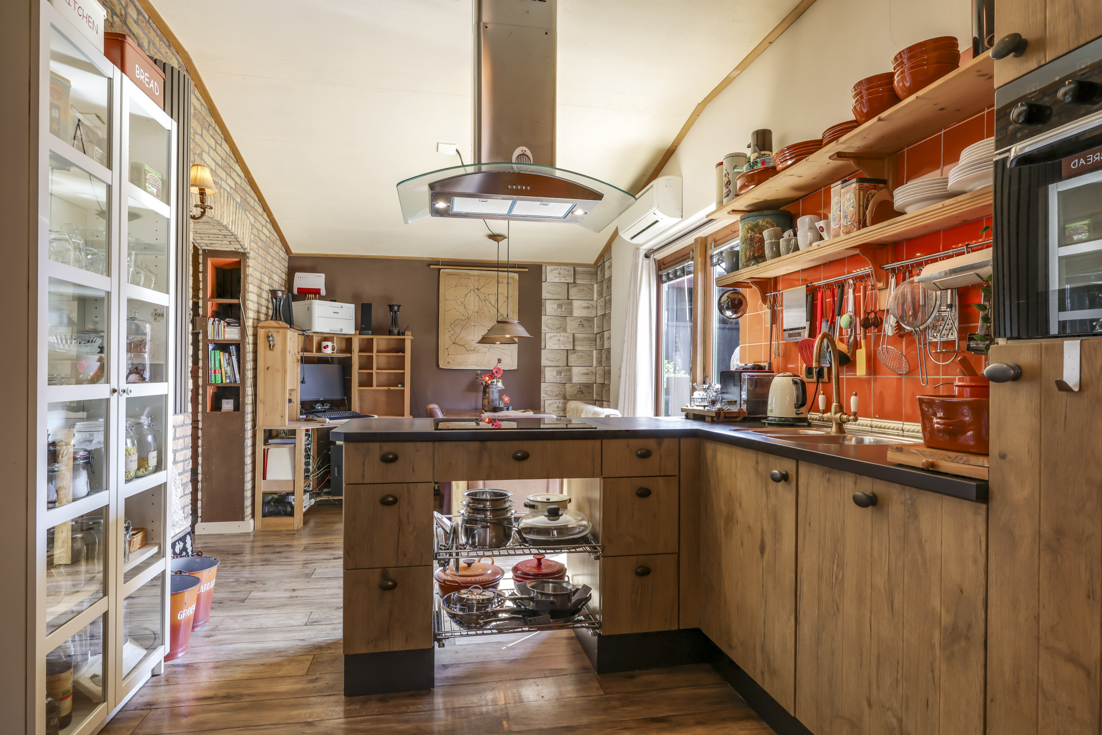 In de aanbouw aan de achterzijde bevindt zich een royale woonkeuken. De keuken is in een hoekopstelling met een schiereiland geplaatst. Zo klets je tijdens het koken gezellig door met je de tafelgenoten. De inbouwapparatuur bestaat uit een inductiekookplaat (2024), een vaatwasser (2025) een combi-oven en een koelkast. In de achtergevel zijn openslaande tuindeuren geplaatst waardoor je op de zomerdag alles lekker op zetten. De temperatuur blijft aangenaam door de aanwezige airco.