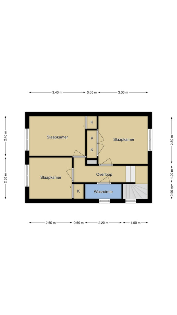 Via de bordestrap in de hal bereiken we de eerste verdieping. De overloop is prettig van formaat en biedt toegang tot drie slaapkamers en een wasruimte. Alle drie de slaapkamers zijn volwaardig van formaat en voorzien van een eigen inloopkast. Erg praktisch omdat je dan geen linnenkast hoeft te plaatsen. Door de aanwezigheid van meerdere ramen zijn de kamers licht en luchtig.