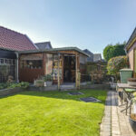 Met een diepte van circa 15 meter en een breedte van 12 meter biedt deze tuin volop ruimte om te ontspannen, spelen of tuinieren. Dankzij de ligging op het zuiden geniet je hier de hele dag van de zon. Bij de achtergevel is een terras aangelegd met genoeg plek voor een tuinset. Verder is de tuin aangekleed met een groen gazon en plantenbakken. Een houten schuur biedt extra opslagmogelijkheden voor bijvoorbeeld de grasmaaier en tuinkussens. Achterin de tuin is een gezellige veranda van ca. 12m2 groot geplaatst. Hier kan je op een warme zomerdag prima de schaduw opzoeken.