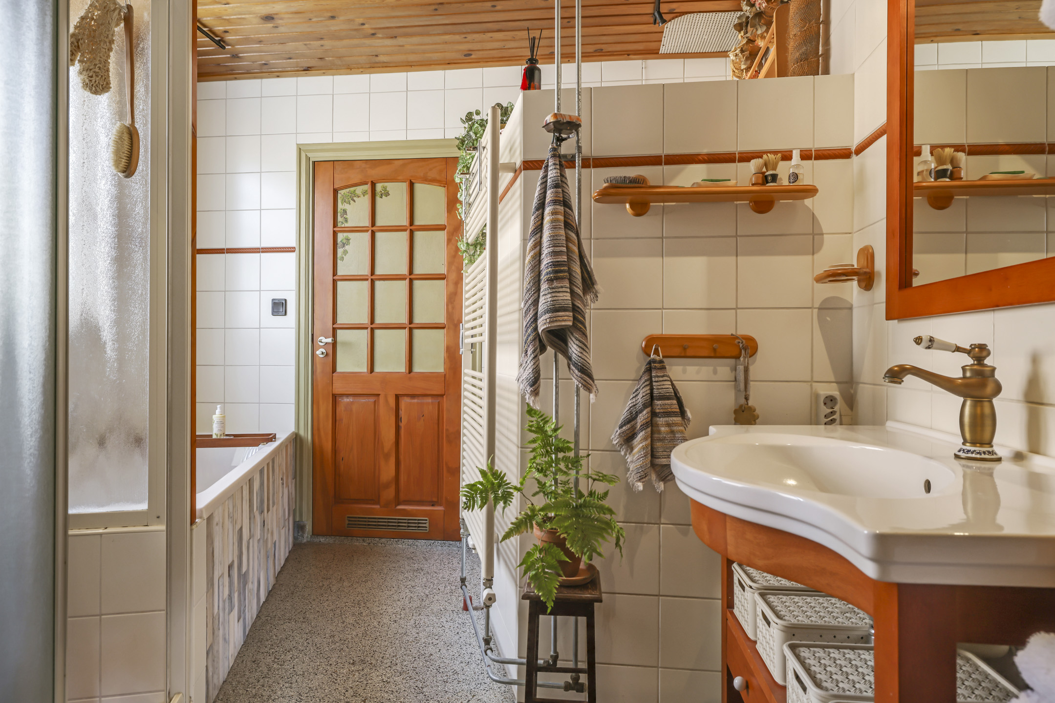 Badkamer op begane grond met ligbad, inloopdouche, wastafelmeubel, toilet en handdoekradiator