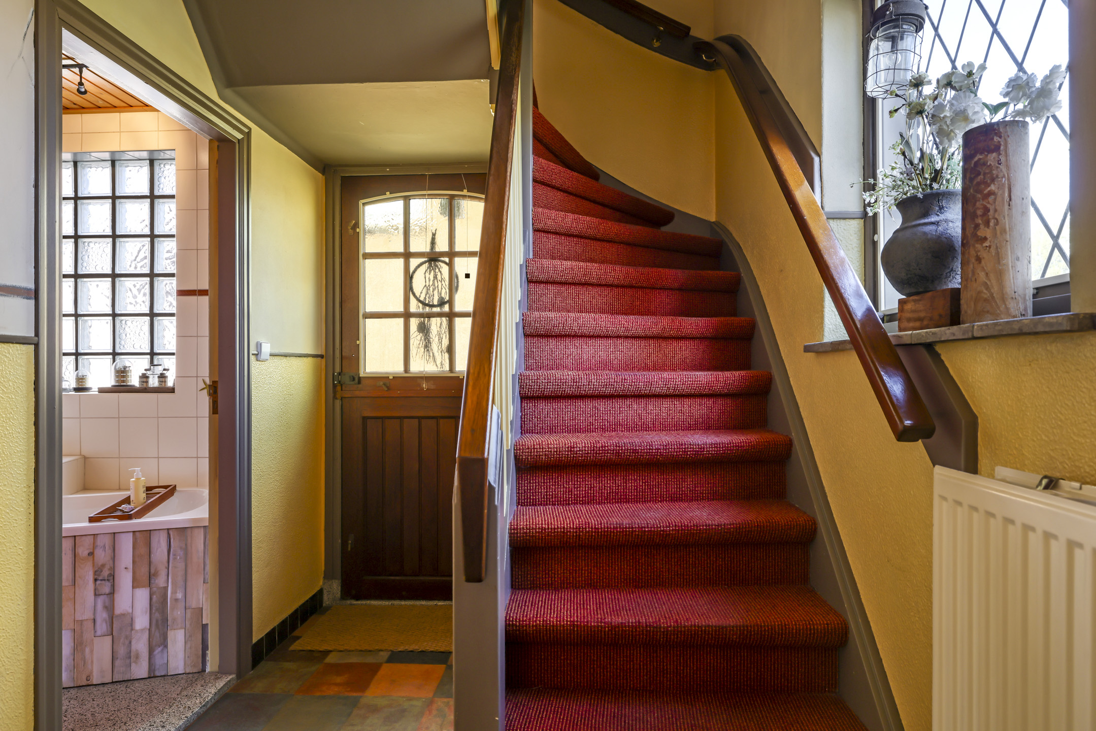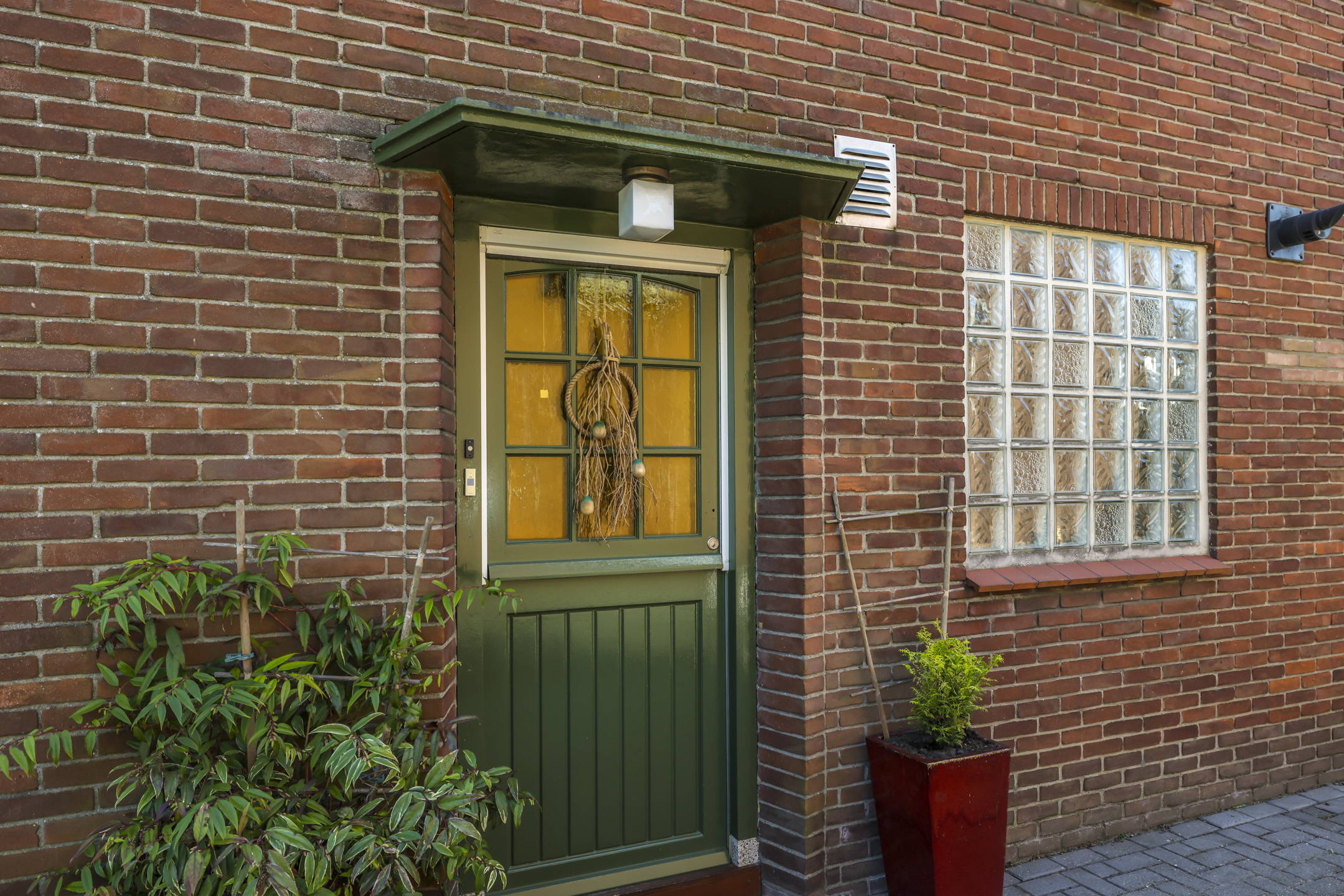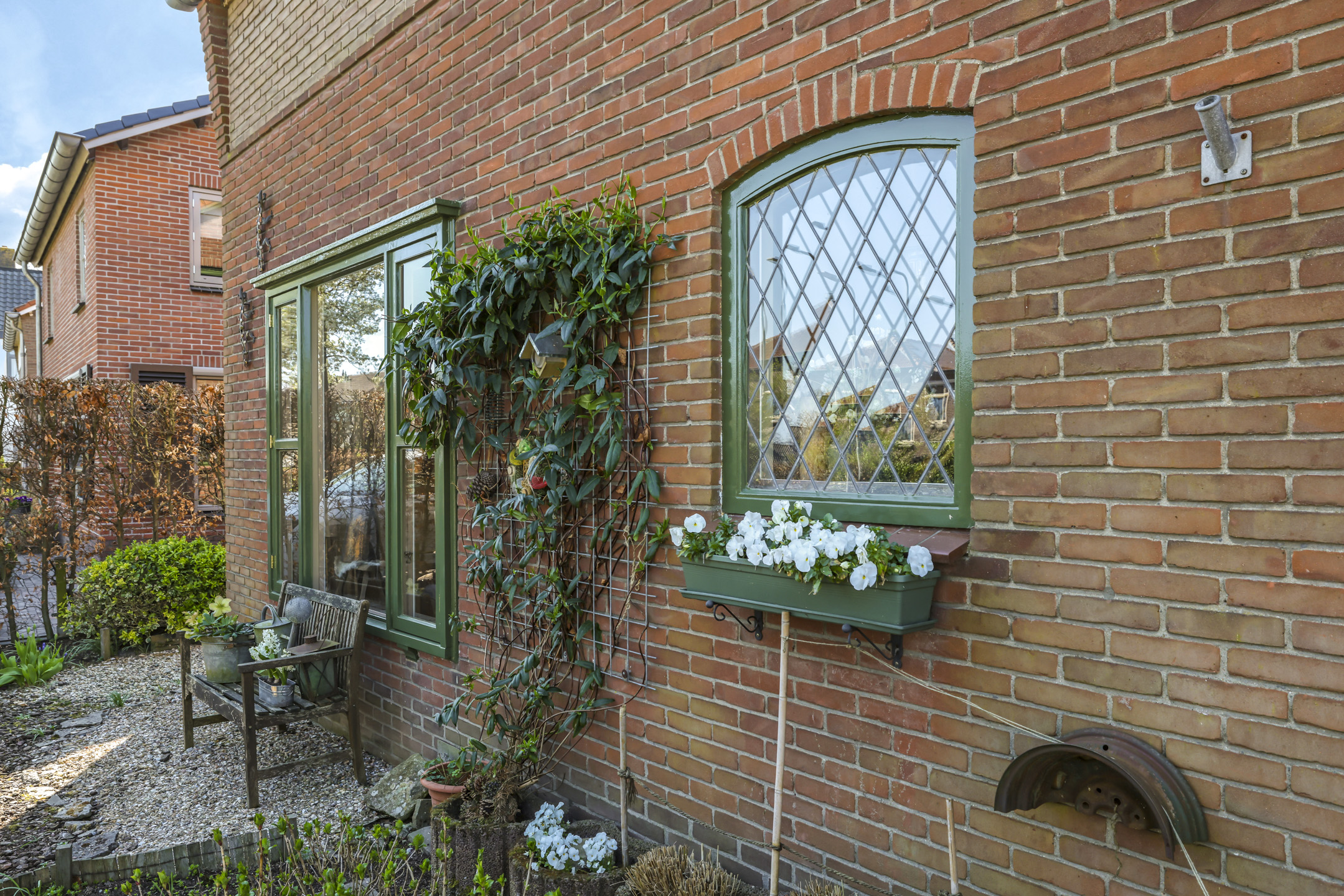 Authentieke voorgevel met afwijkende steenkleur en glas-in-loodramen